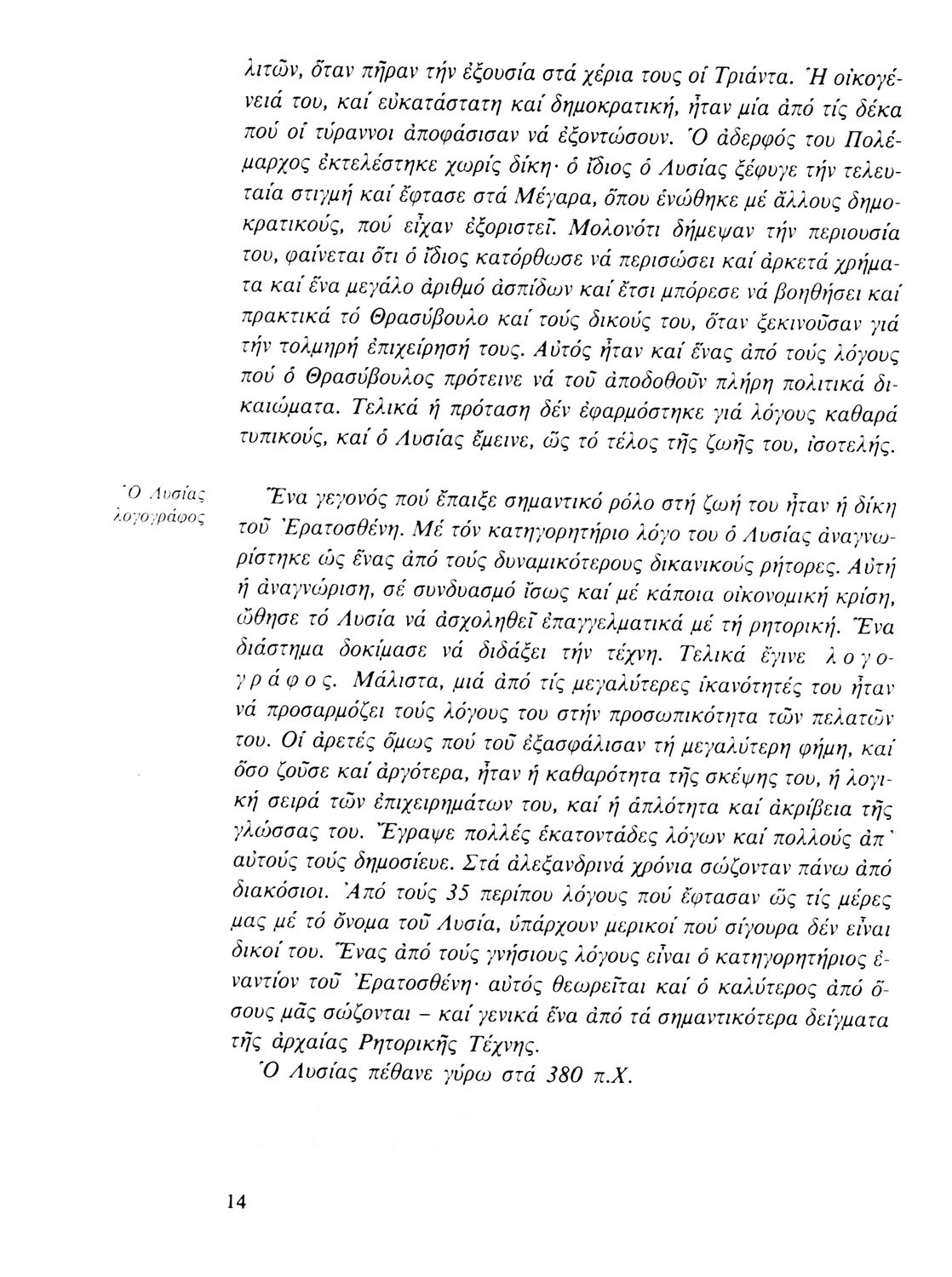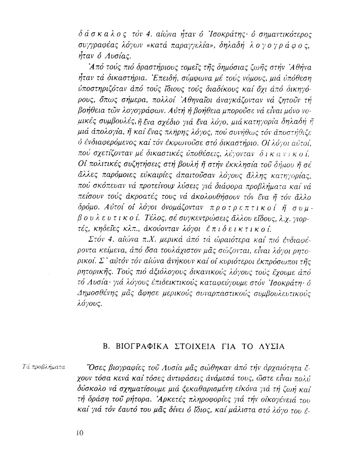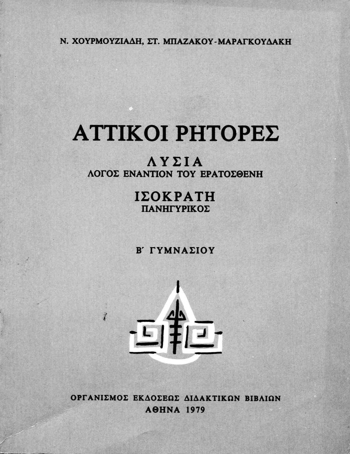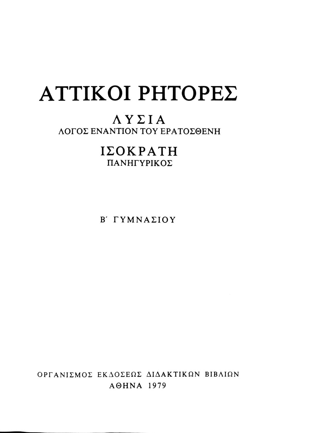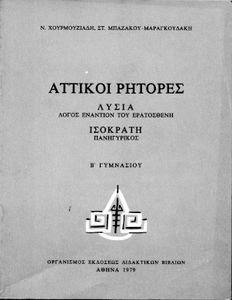 Σχολικό εγχειρίδιο Αρχαίων Ελληνικών για τη Β΄ Γυμνασίου που περιλαμβάνει Λόγους των Λυσία και Ισοκράτη και αποσπάσματα από τα Ελληνικά του Ξενοφώντα σε μετάφραση, εισαγωγή στη ζωή και το έργο τους και ερμηνευτικές σημειώσεις.