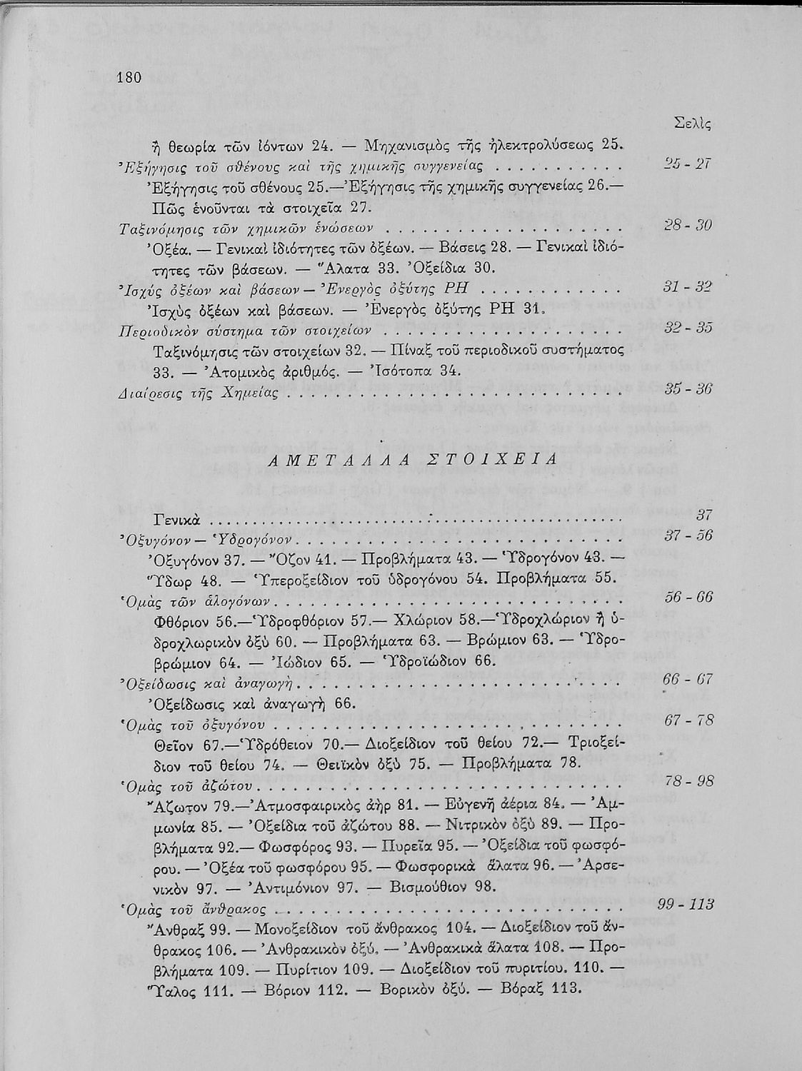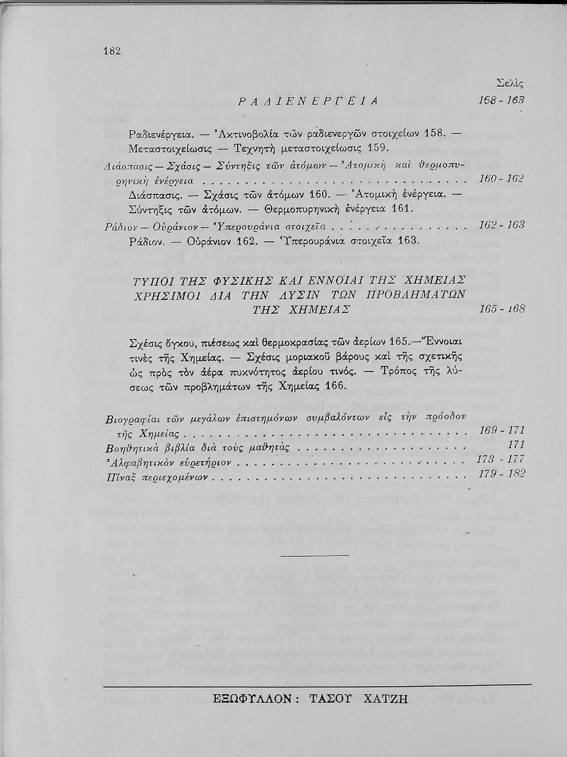 Σχολικό εγχειρίδιο Χημείας που απευθύνεται σε μαθητές Γυμνασίου με σκοπό τη περιγραφή εισαγωγικών εννοιών χημείας (ύλη, νόμοι χημείας, χημικές αντιδράσεις-εξισώσεις-ενώσεις). Στο βιβλίο γίνεται αναλυτική περιγραφή στοιχείων μετάλλων και αμέταλλων περιγράφοντας τις ιδιότητες και τις ενώσεις τους. Τέλος προσδιορίζεται η ακτινοβολία ραδιενεργών σωμάτων.