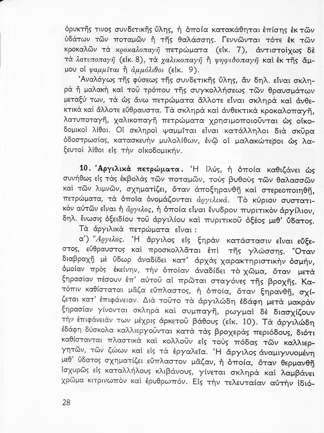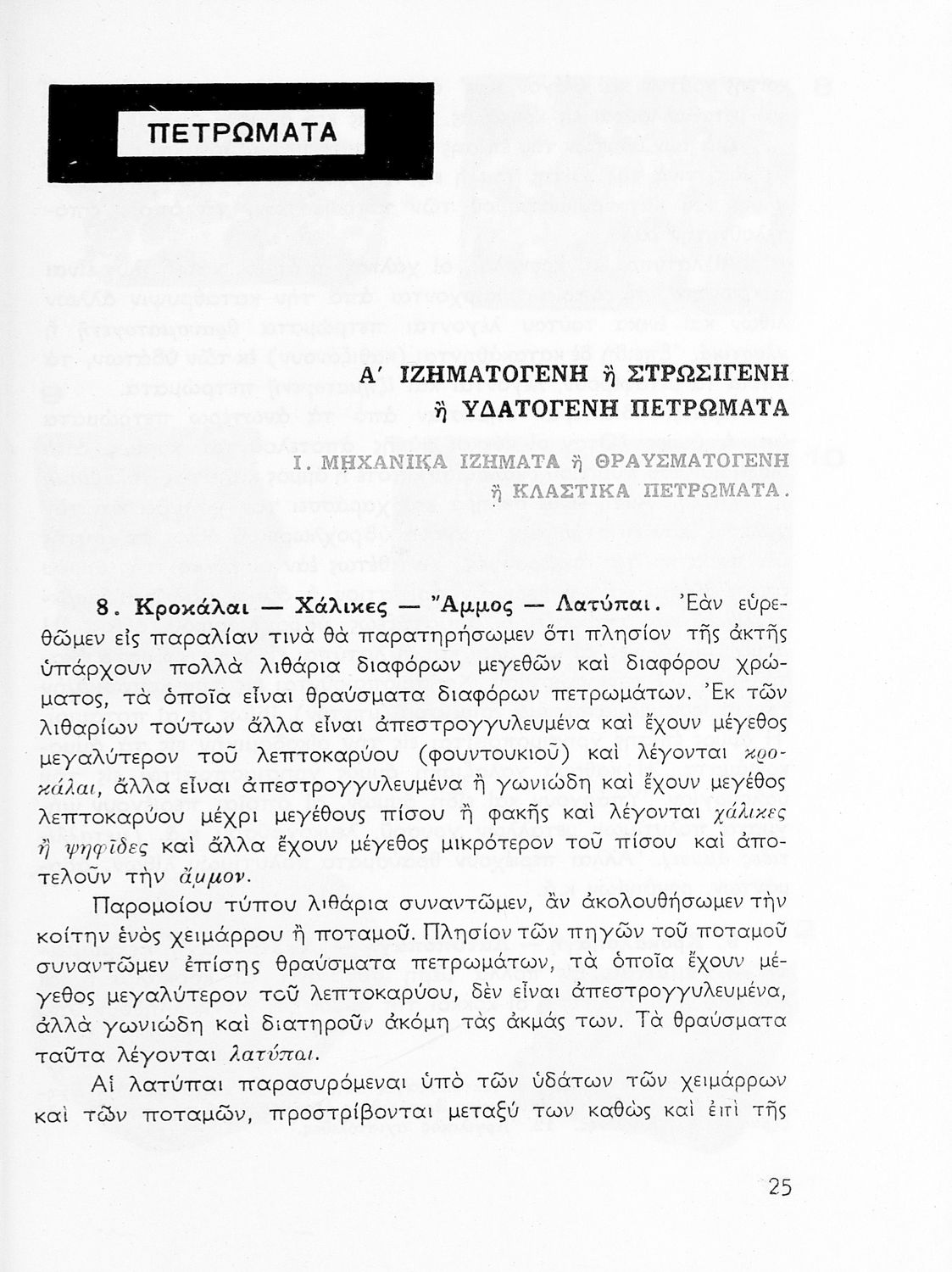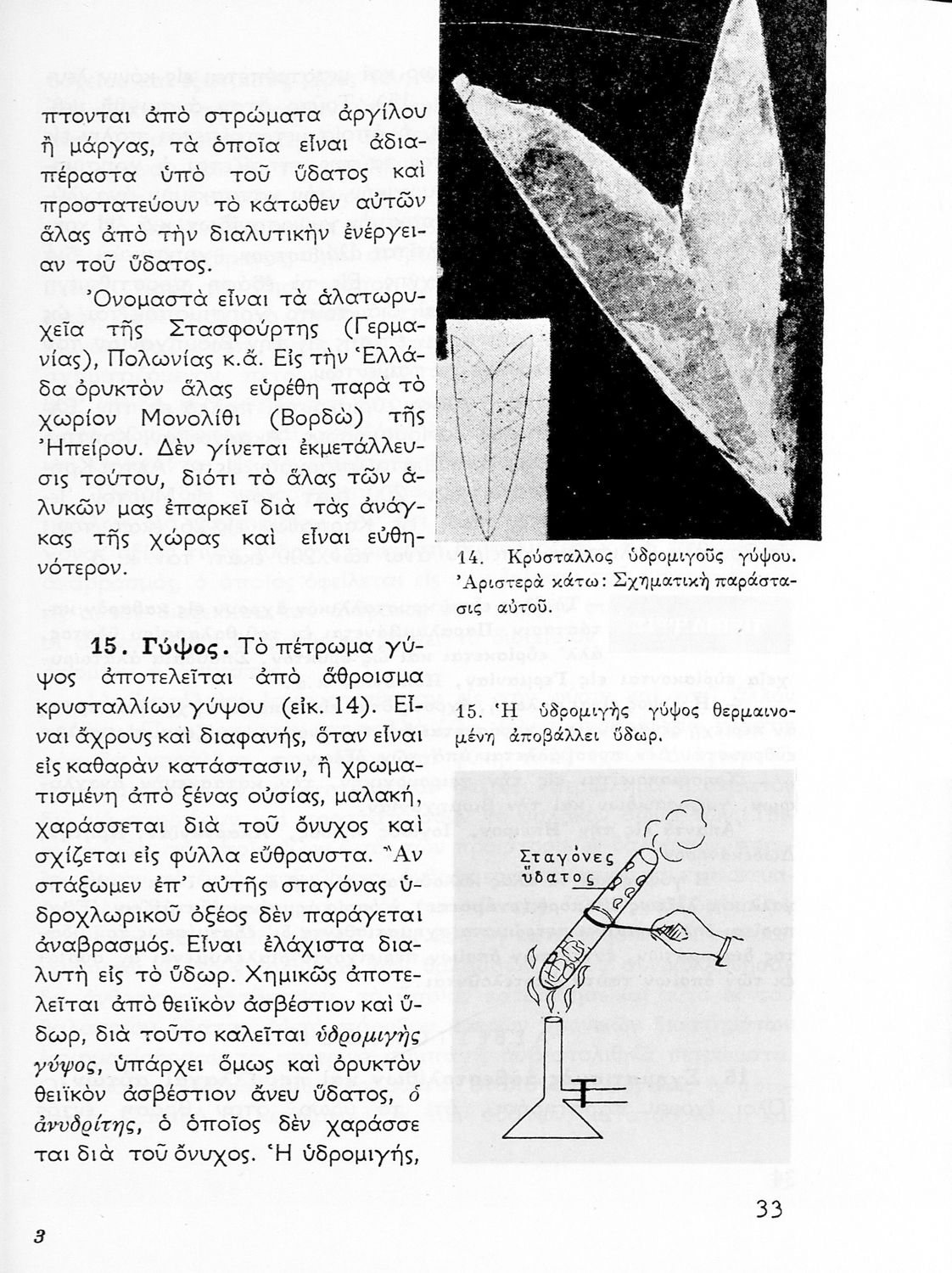 Σχολικό εγχειρίδιο Γεωλογίας/Ορυκτολογίας για την Δ΄ Γυμνασίου που περιλαμβάνει χθονογραφική, δυναμική και ιστορική γεωλογία, και γενική και ειδική ορυκτολογία. Ο συγγραφέας ήταν καθηγητής πανεπιστημίου και η συγγραφέας φυσικός. Περιέχει παράρτημα με «Στοιχεία Μαθηματικής Γεωγραφίας» από τη γεωγραφία Δ’ τάξης του Αλκίνοου Μάζη (εκδ 1963).