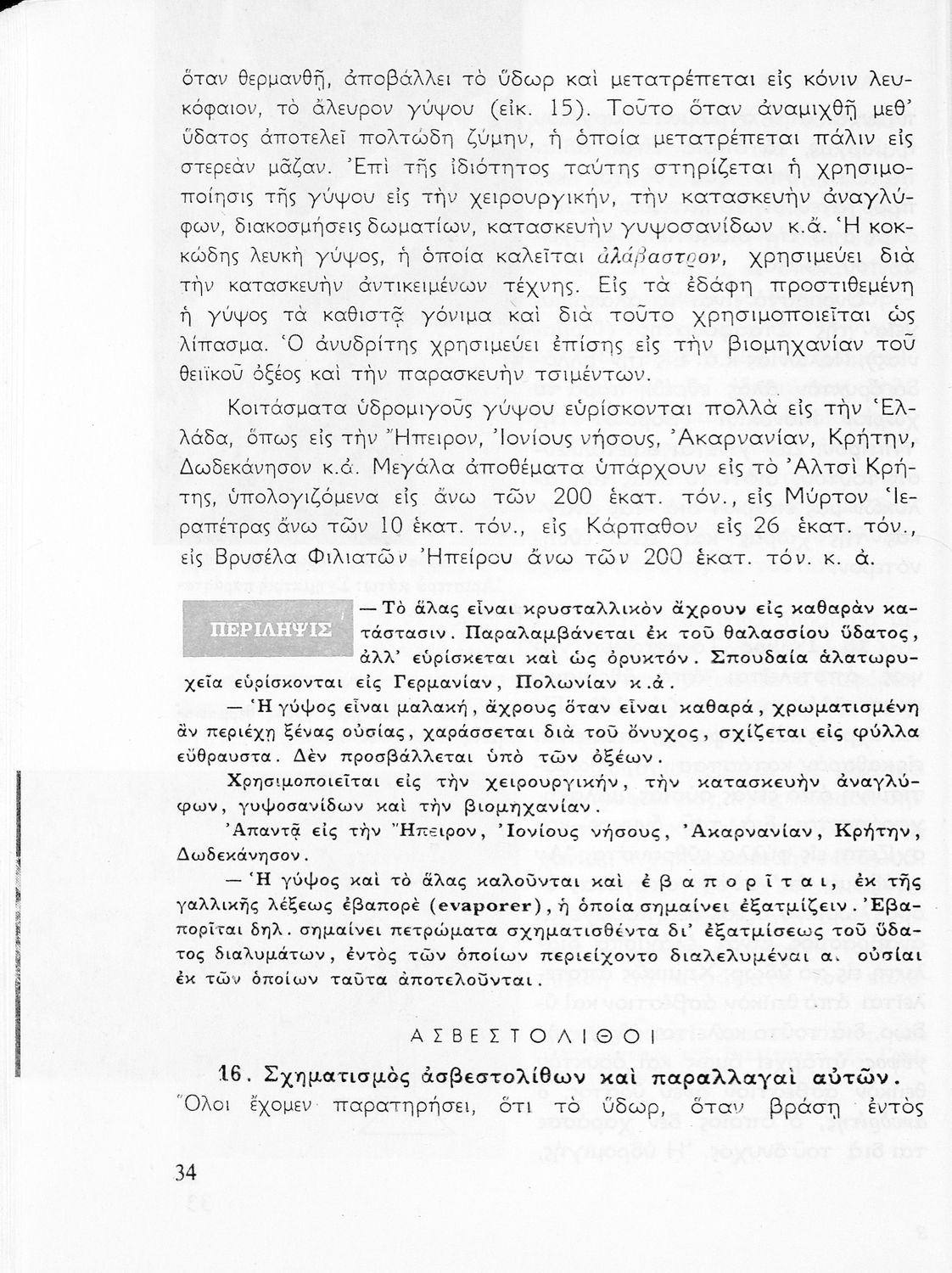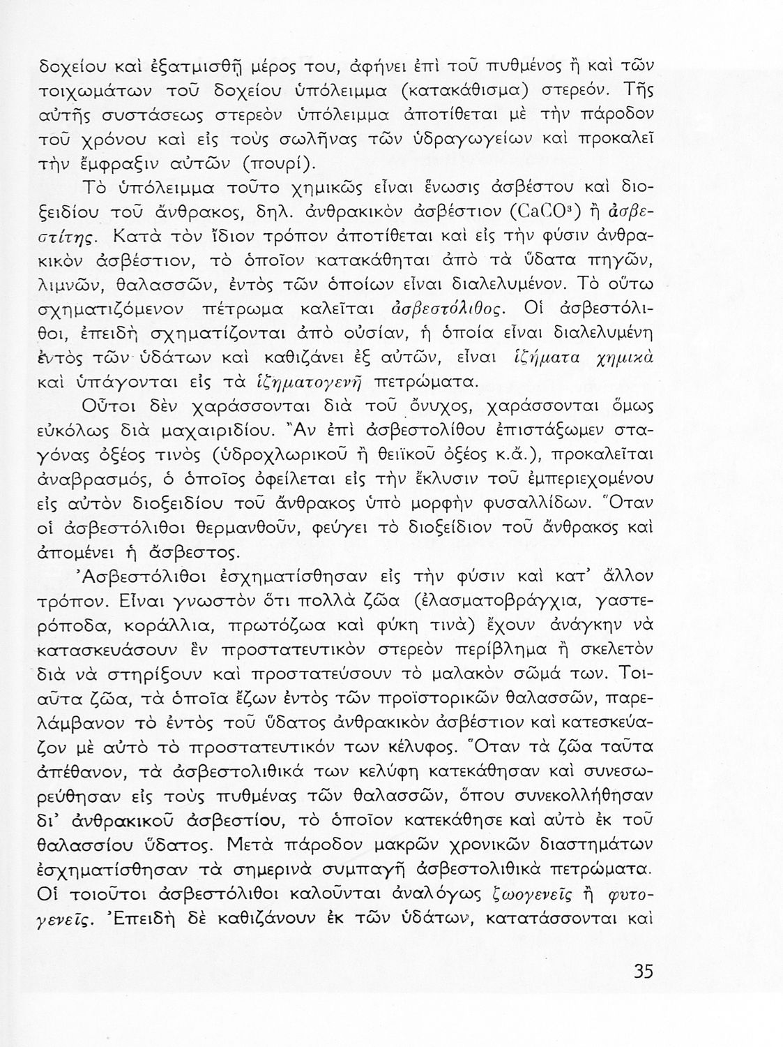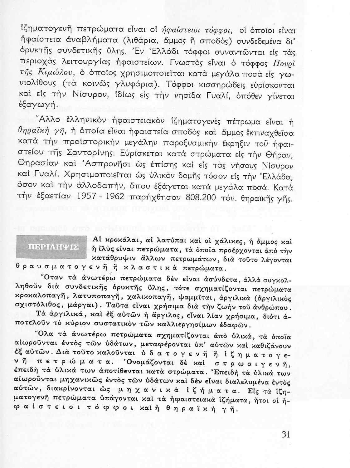 Σχολικό εγχειρίδιο Γεωλογίας/Ορυκτολογίας για την Δ΄ Γυμνασίου που περιλαμβάνει χθονογραφική, δυναμική και ιστορική γεωλογία, και γενική και ειδική ορυκτολογία. Ο συγγραφέας ήταν καθηγητής πανεπιστημίου και η συγγραφέας φυσικός. Περιέχει παράρτημα με «Στοιχεία Μαθηματικής Γεωγραφίας» από τη γεωγραφία Δ’ τάξης του Αλκίνοου Μάζη (εκδ 1963).