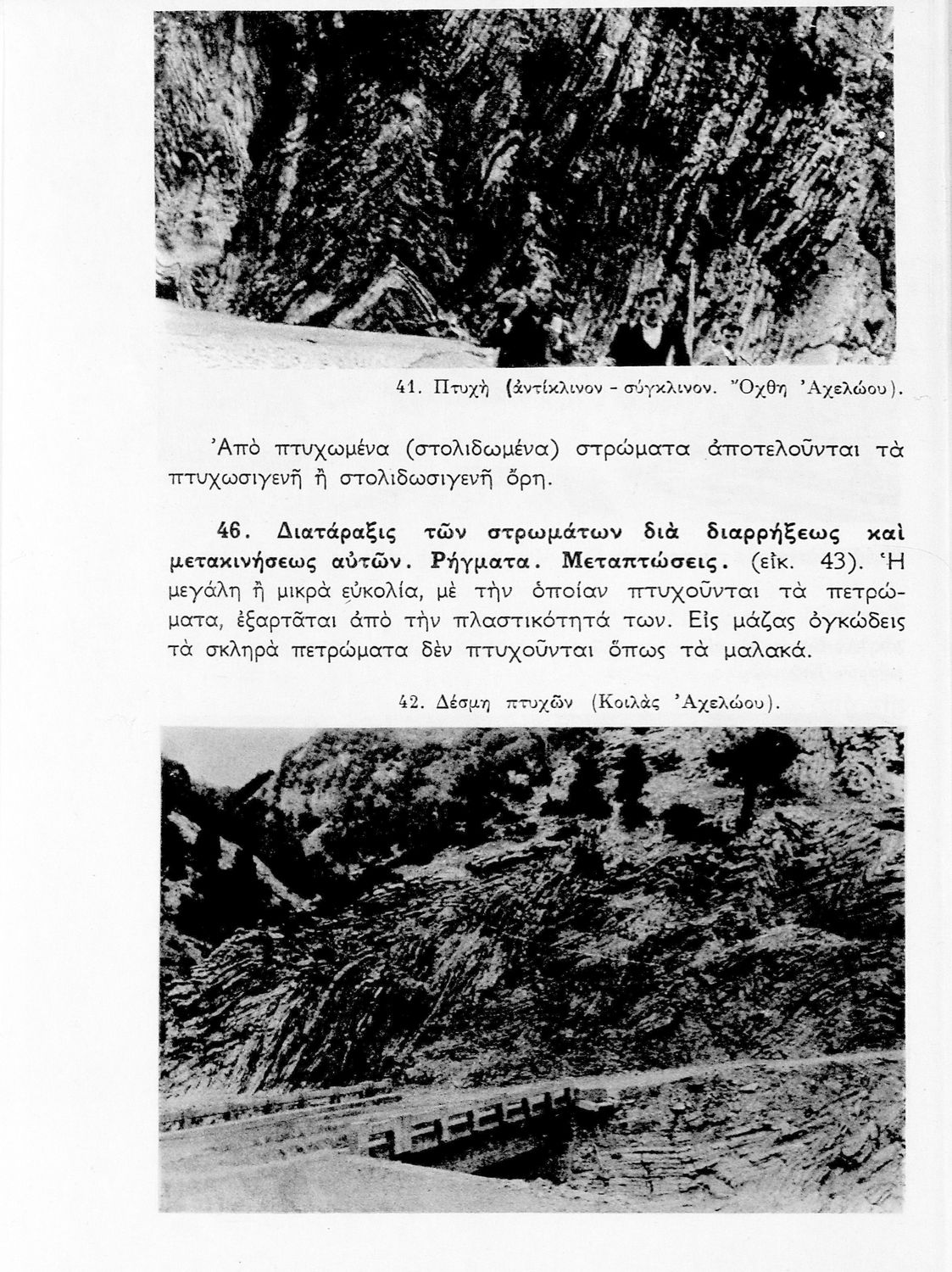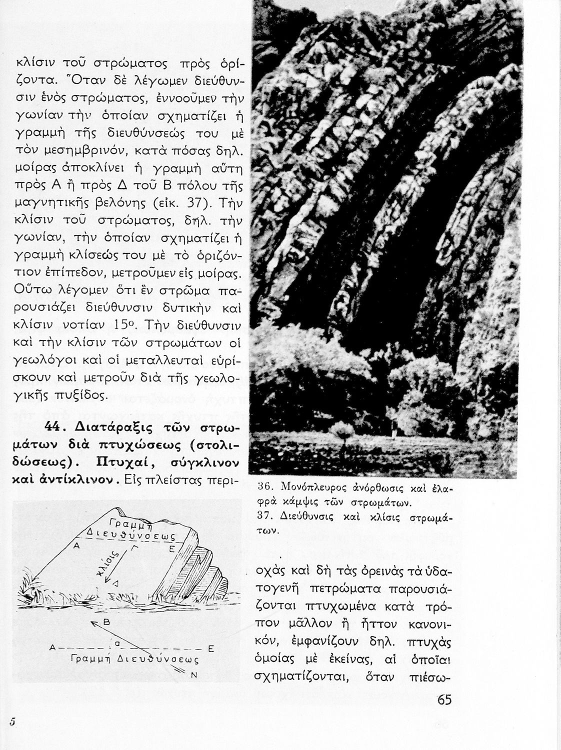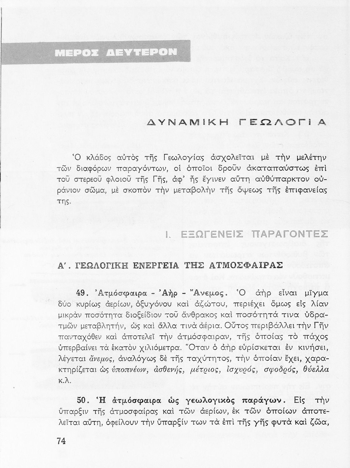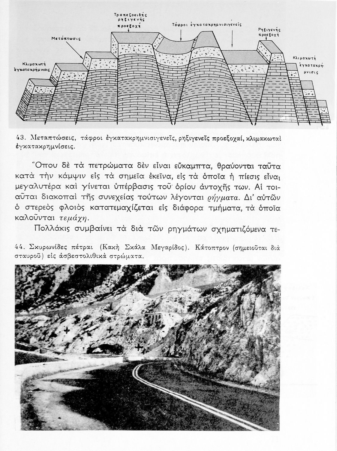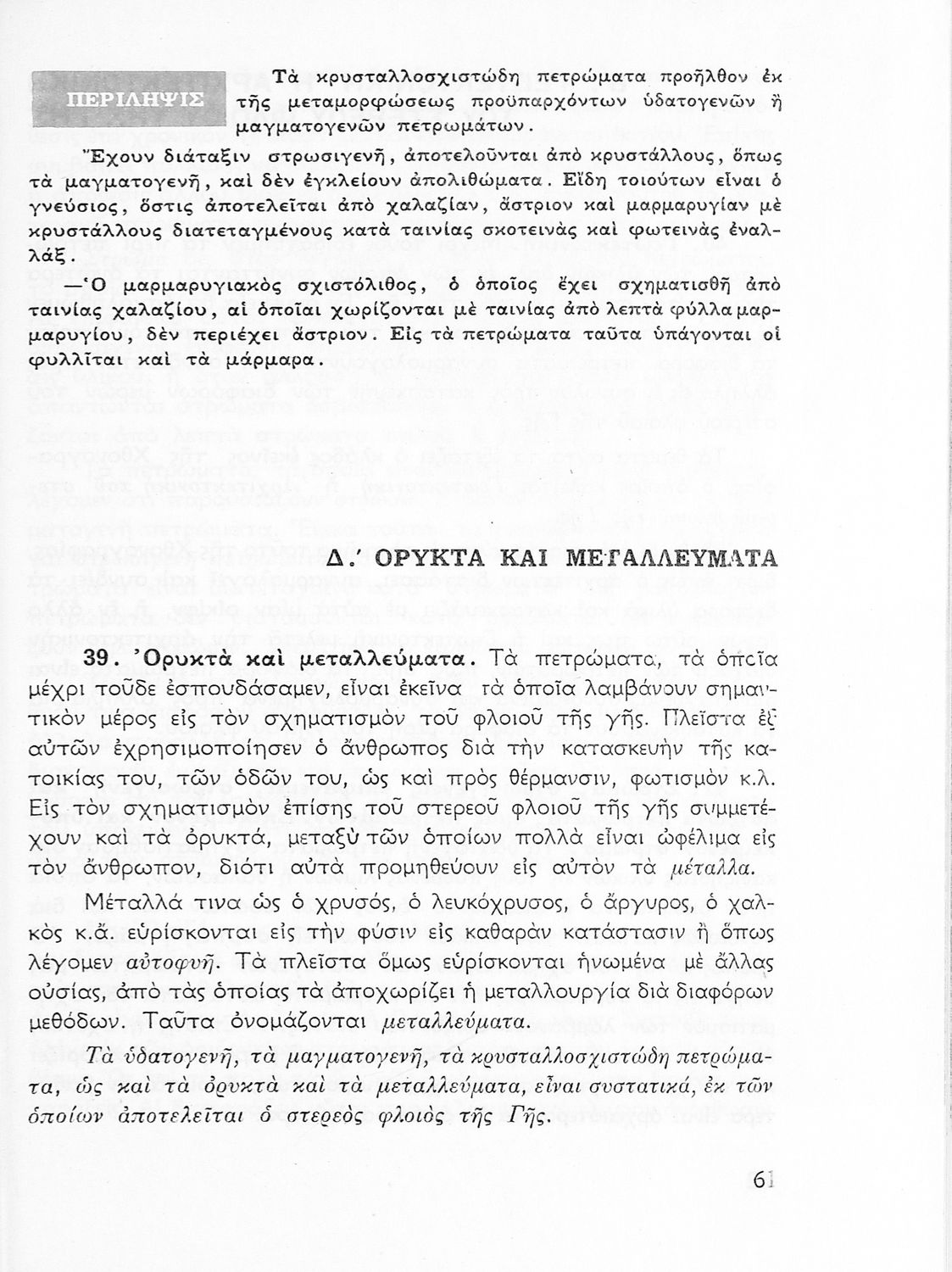 Σχολικό εγχειρίδιο Γεωλογίας/Ορυκτολογίας για την Δ΄ Γυμνασίου που περιλαμβάνει χθονογραφική, δυναμική και ιστορική γεωλογία, και γενική και ειδική ορυκτολογία. Ο συγγραφέας ήταν καθηγητής πανεπιστημίου και η συγγραφέας φυσικός. Περιέχει παράρτημα με «Στοιχεία Μαθηματικής Γεωγραφίας» από τη γεωγραφία Δ’ τάξης του Αλκίνοου Μάζη (εκδ 1963).