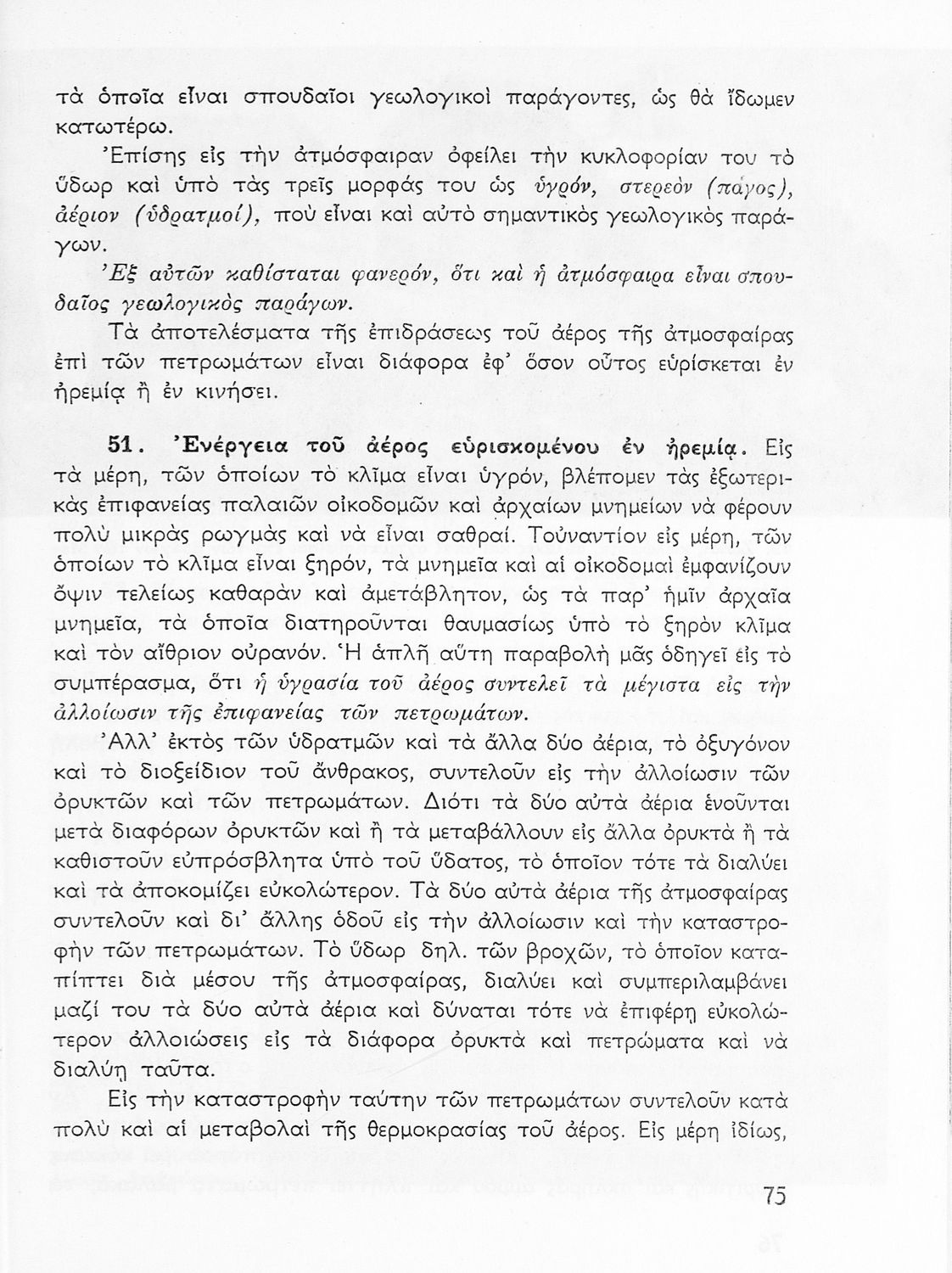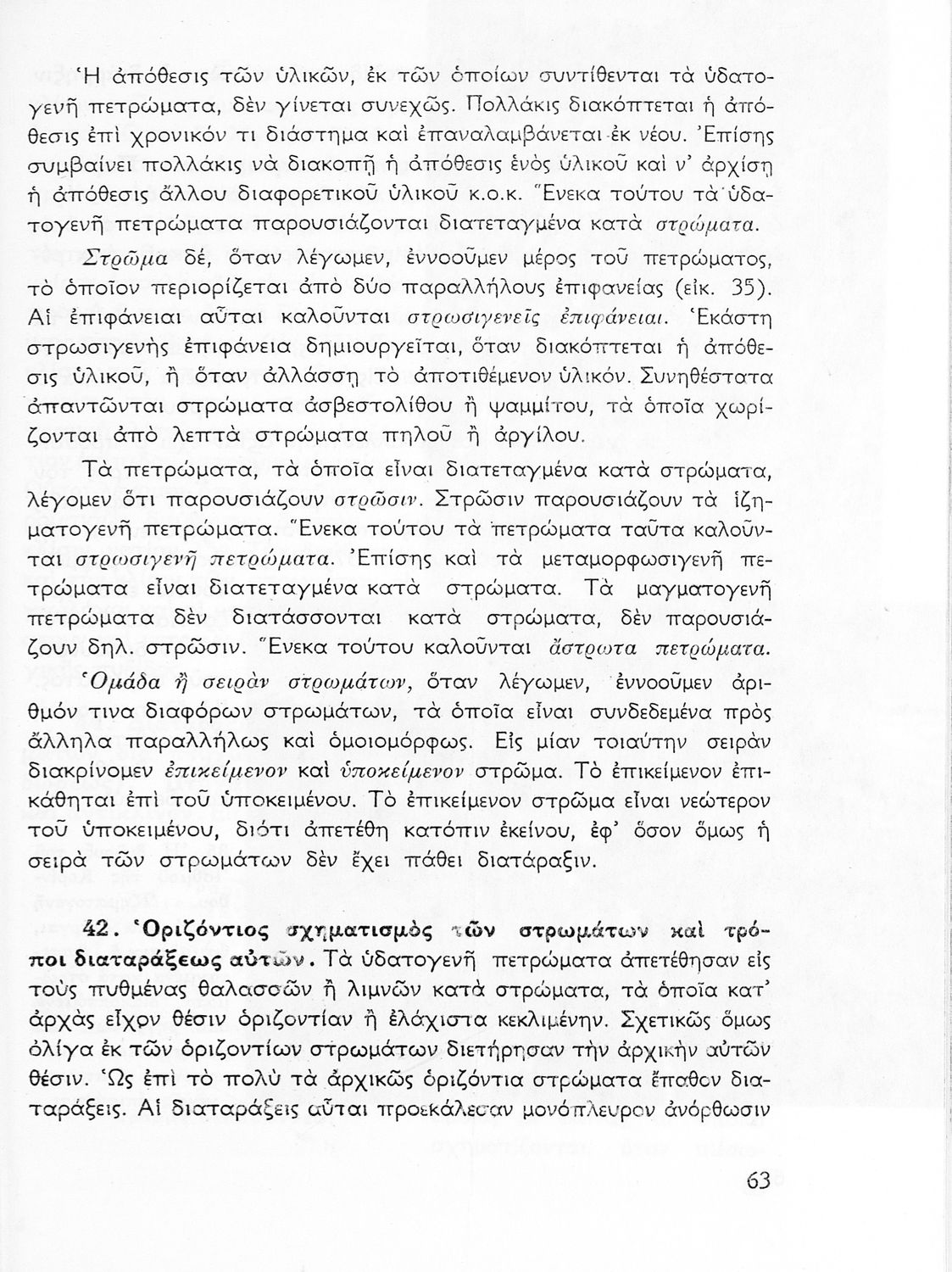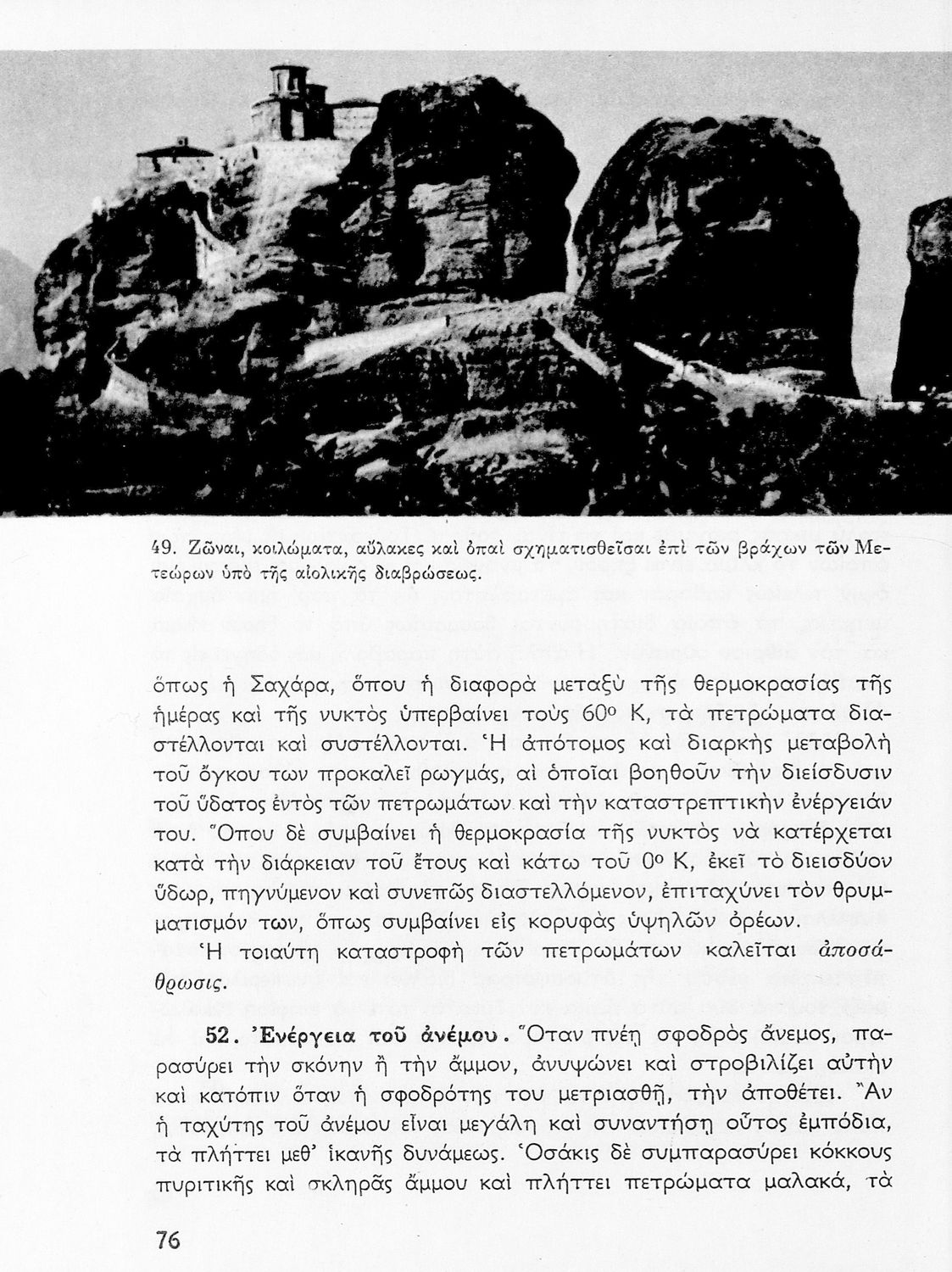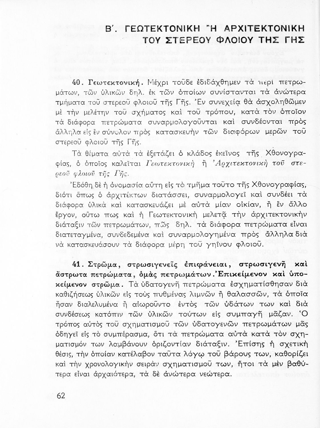 Σχολικό εγχειρίδιο Γεωλογίας/Ορυκτολογίας για την Δ΄ Γυμνασίου που περιλαμβάνει χθονογραφική, δυναμική και ιστορική γεωλογία, και γενική και ειδική ορυκτολογία. Ο συγγραφέας ήταν καθηγητής πανεπιστημίου και η συγγραφέας φυσικός. Περιέχει παράρτημα με «Στοιχεία Μαθηματικής Γεωγραφίας» από τη γεωγραφία Δ’ τάξης του Αλκίνοου Μάζη (εκδ 1963).