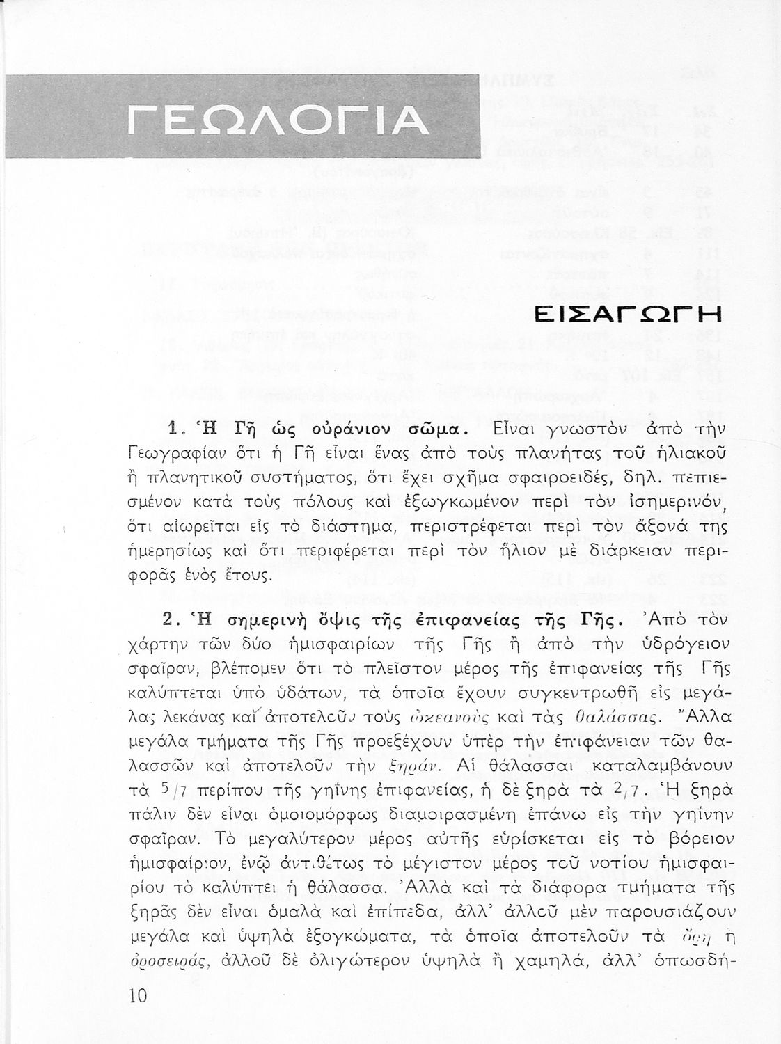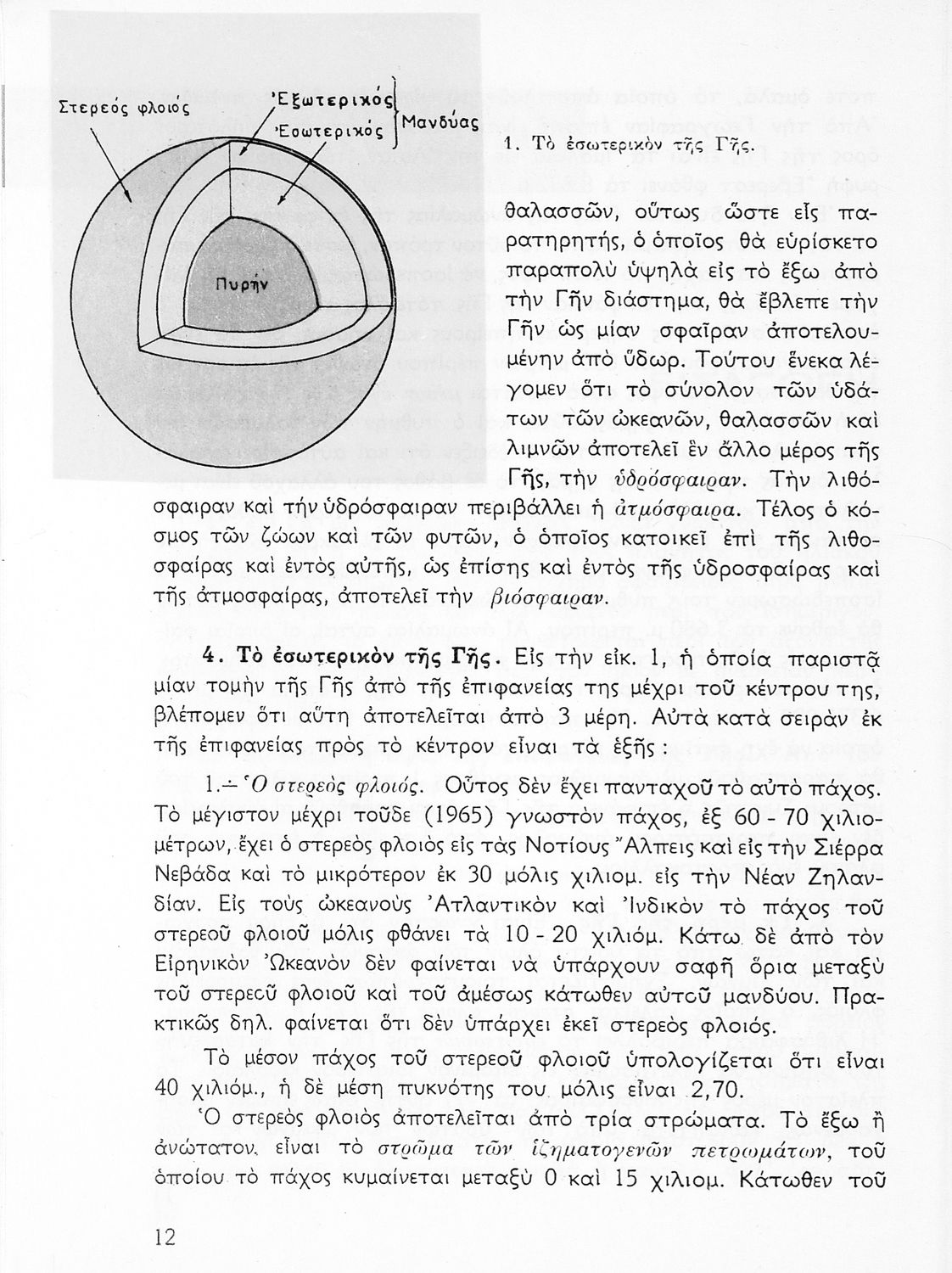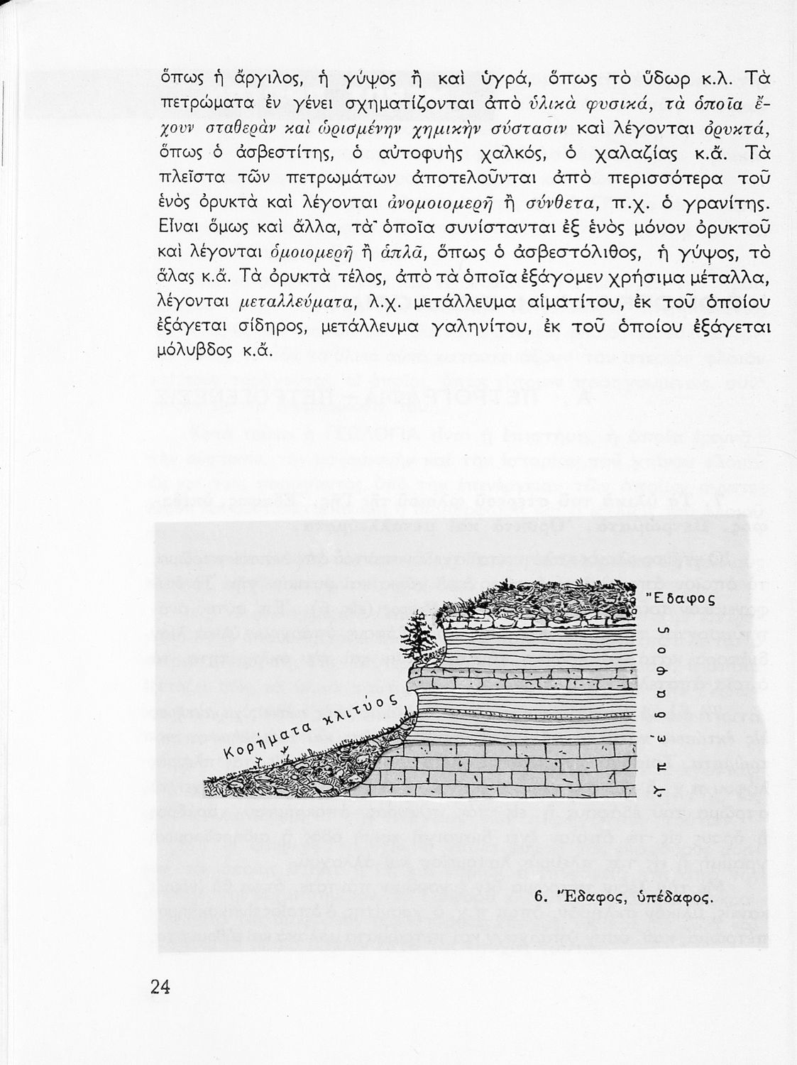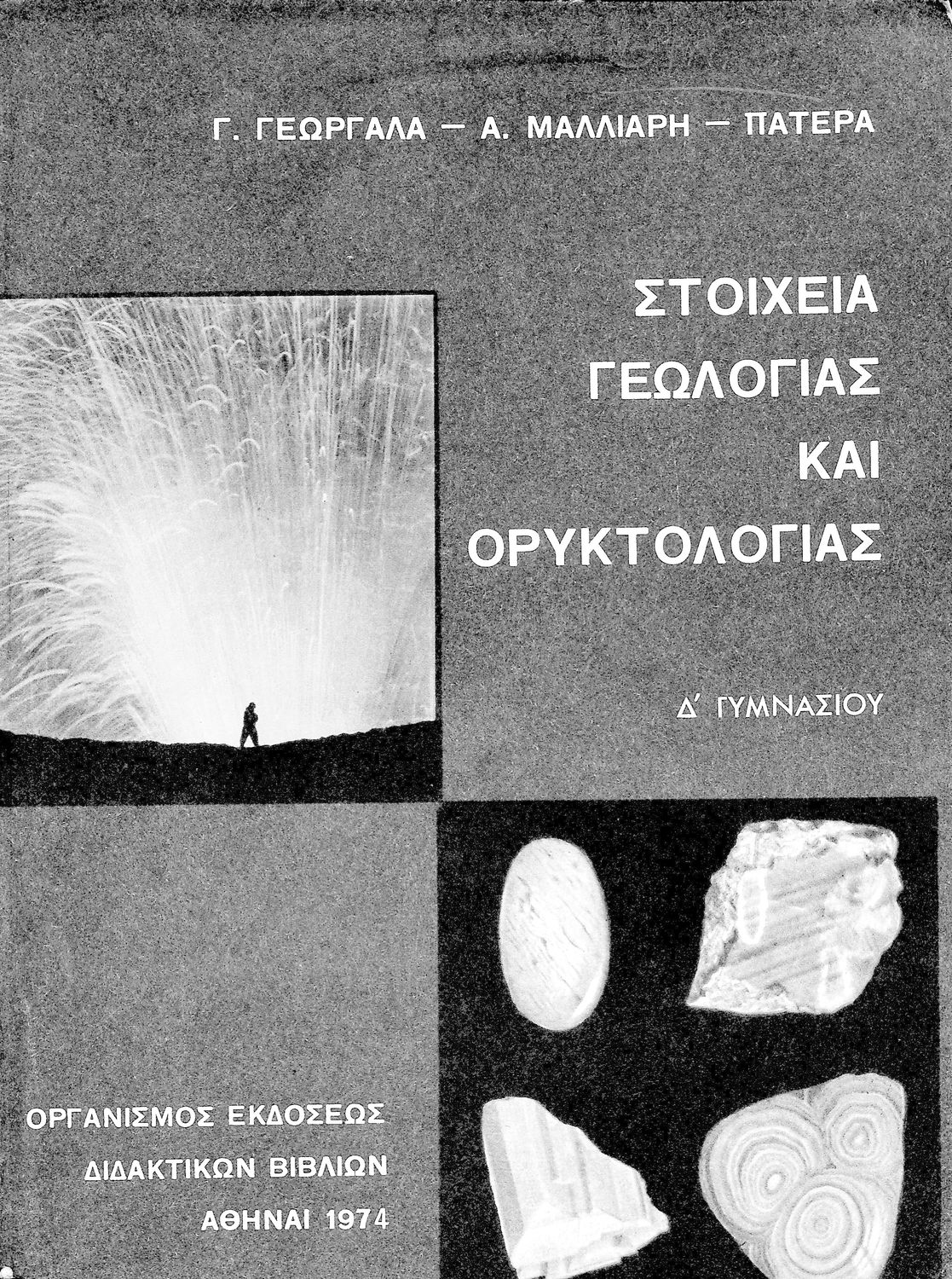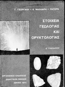 Σχολικό εγχειρίδιο Γεωλογίας/Ορυκτολογίας για την Δ΄ Γυμνασίου που περιλαμβάνει χθονογραφική, δυναμική και ιστορική γεωλογία, και γενική και ειδική ορυκτολογία. Ο συγγραφέας ήταν καθηγητής πανεπιστημίου και η συγγραφέας φυσικός. Περιέχει παράρτημα με «Στοιχεία Μαθηματικής Γεωγραφίας» από τη γεωγραφία Δ’ τάξης του Αλκίνοου Μάζη (εκδ 1963).