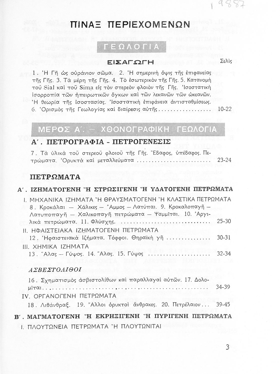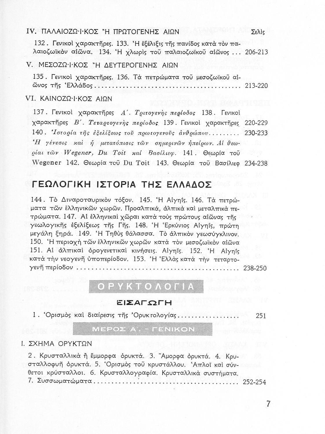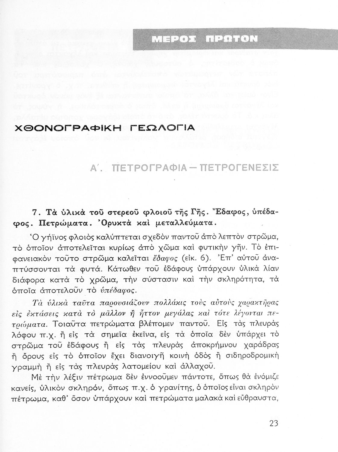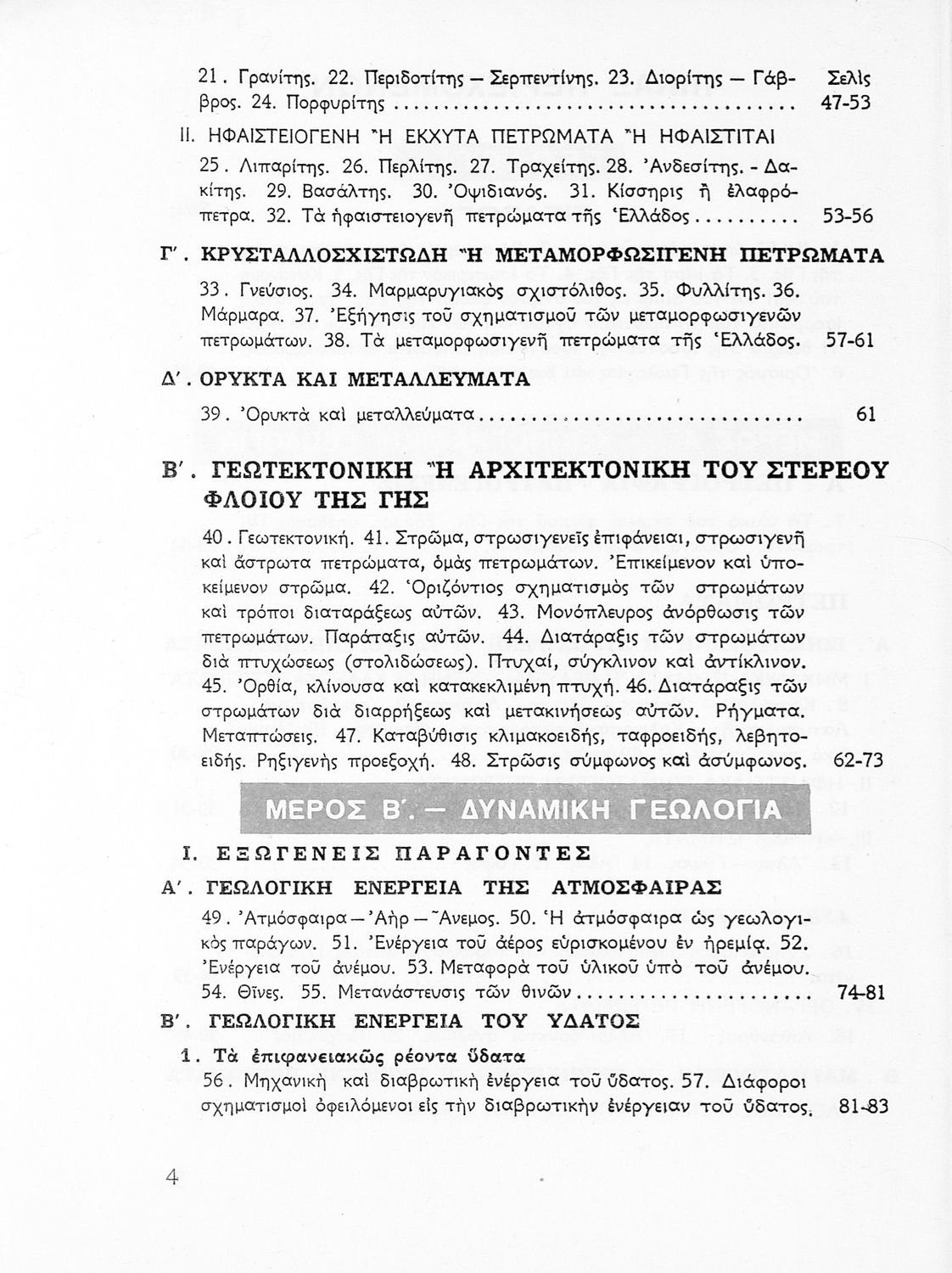 Σχολικό εγχειρίδιο Γεωλογίας/Ορυκτολογίας για την Δ΄ Γυμνασίου που περιλαμβάνει χθονογραφική, δυναμική και ιστορική γεωλογία, και γενική και ειδική ορυκτολογία. Ο συγγραφέας ήταν καθηγητής πανεπιστημίου και η συγγραφέας φυσικός. Περιέχει παράρτημα με «Στοιχεία Μαθηματικής Γεωγραφίας» από τη γεωγραφία Δ’ τάξης του Αλκίνοου Μάζη (εκδ 1963).