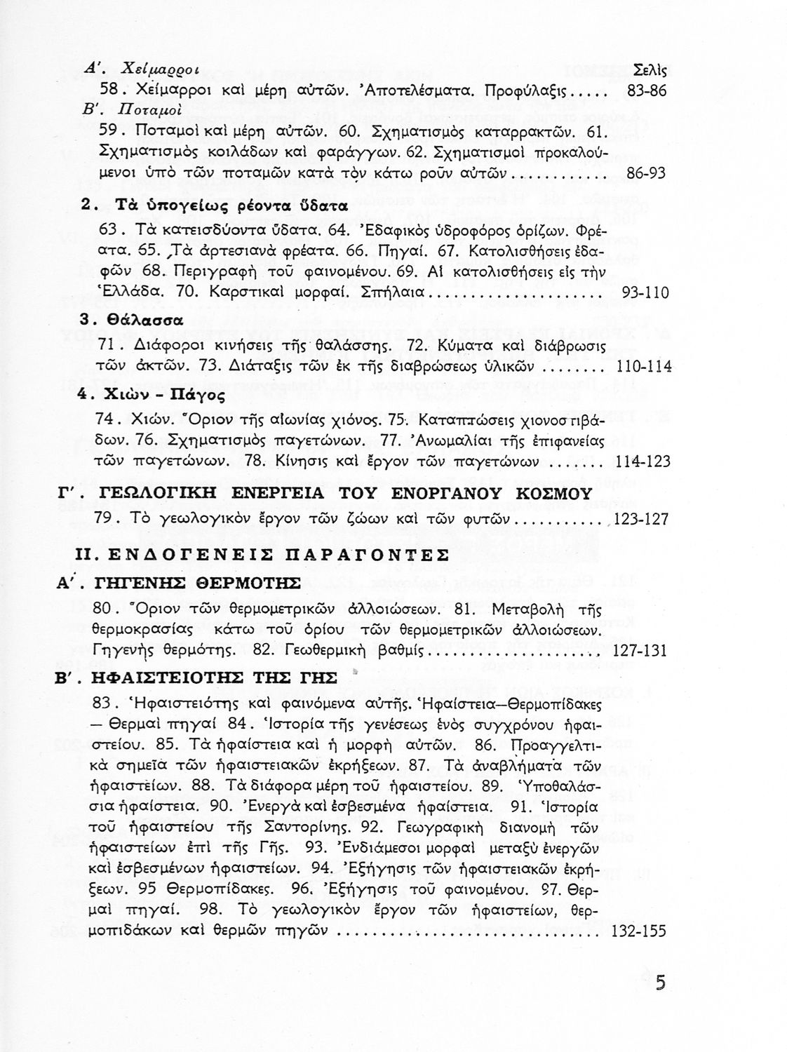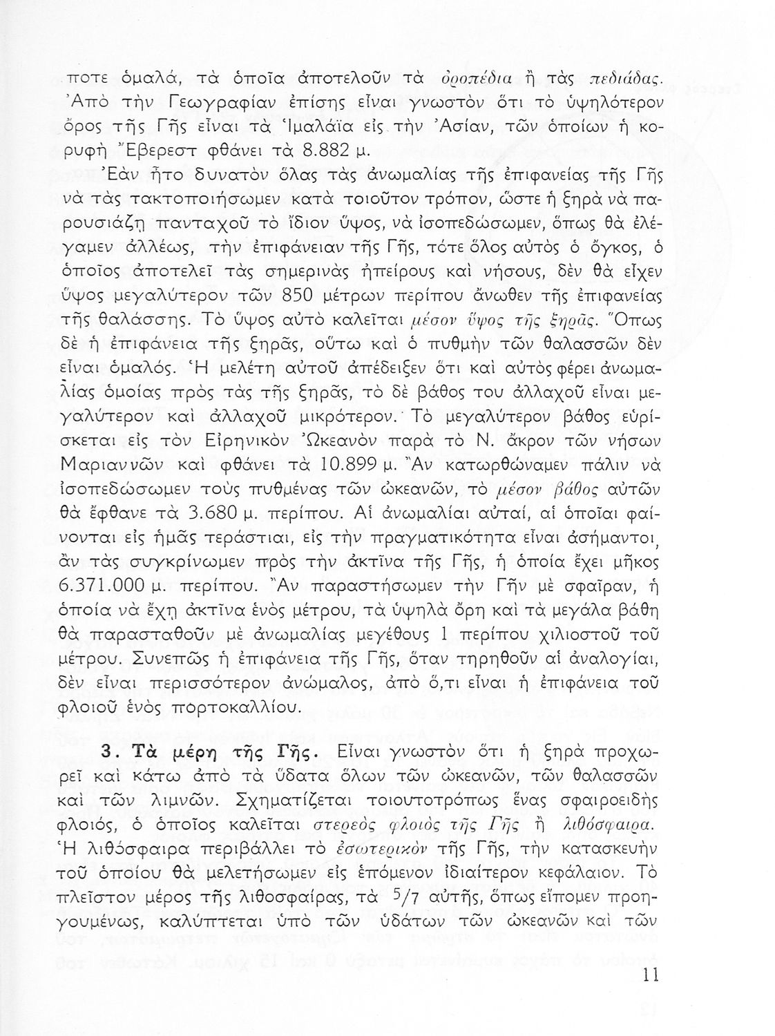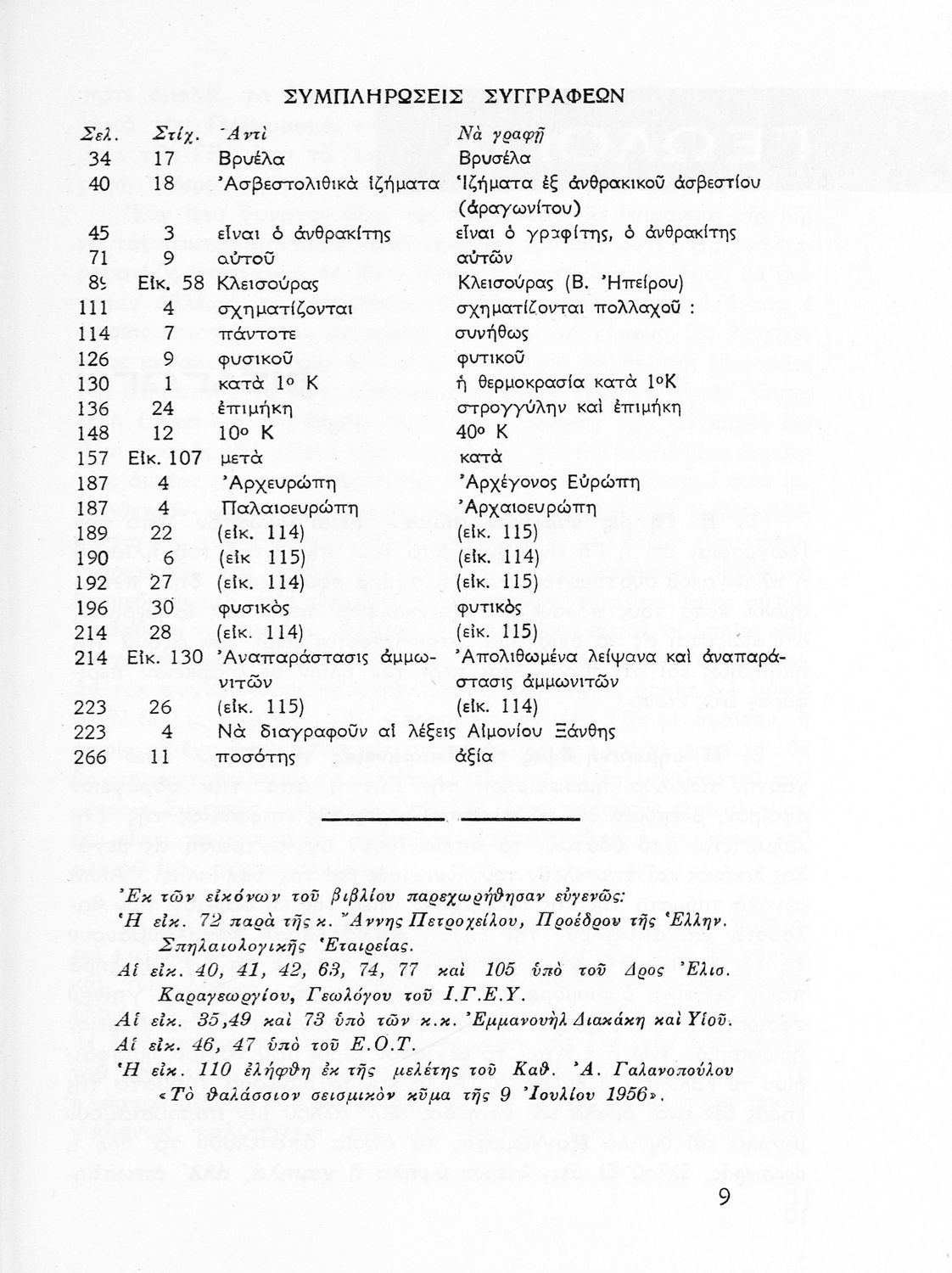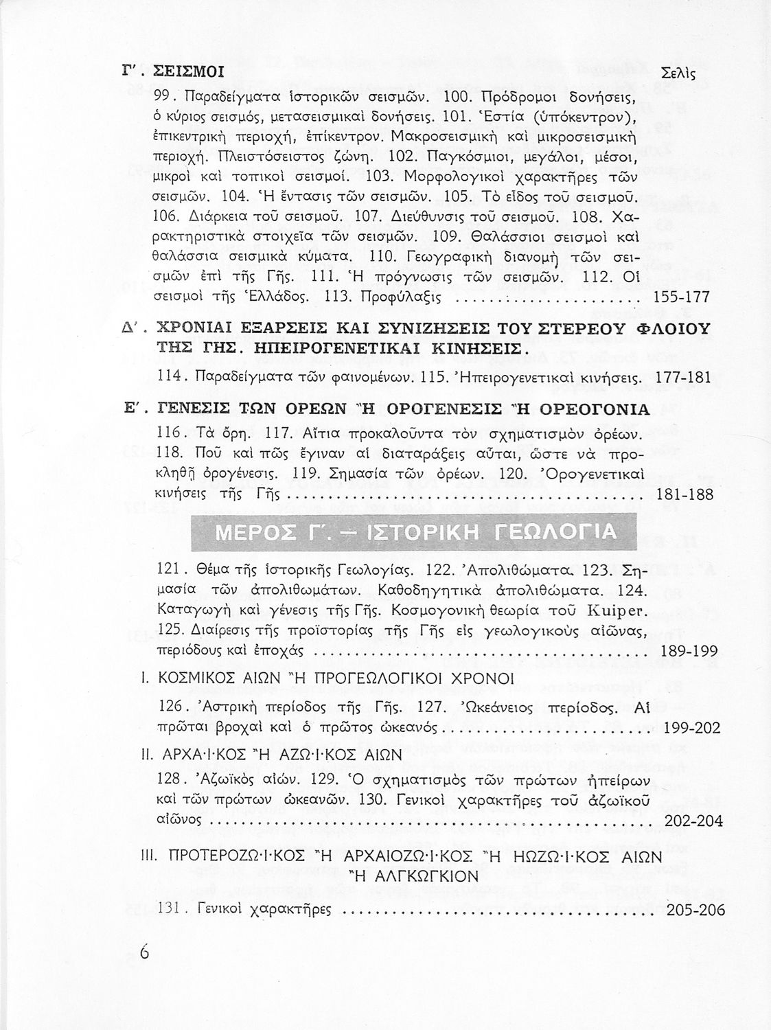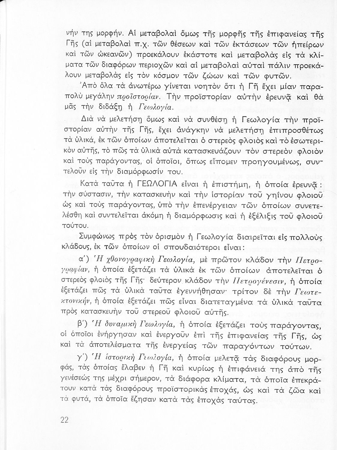 Σχολικό εγχειρίδιο Γεωλογίας/Ορυκτολογίας για την Δ΄ Γυμνασίου που περιλαμβάνει χθονογραφική, δυναμική και ιστορική γεωλογία, και γενική και ειδική ορυκτολογία. Ο συγγραφέας ήταν καθηγητής πανεπιστημίου και η συγγραφέας φυσικός. Περιέχει παράρτημα με «Στοιχεία Μαθηματικής Γεωγραφίας» από τη γεωγραφία Δ’ τάξης του Αλκίνοου Μάζη (εκδ 1963).