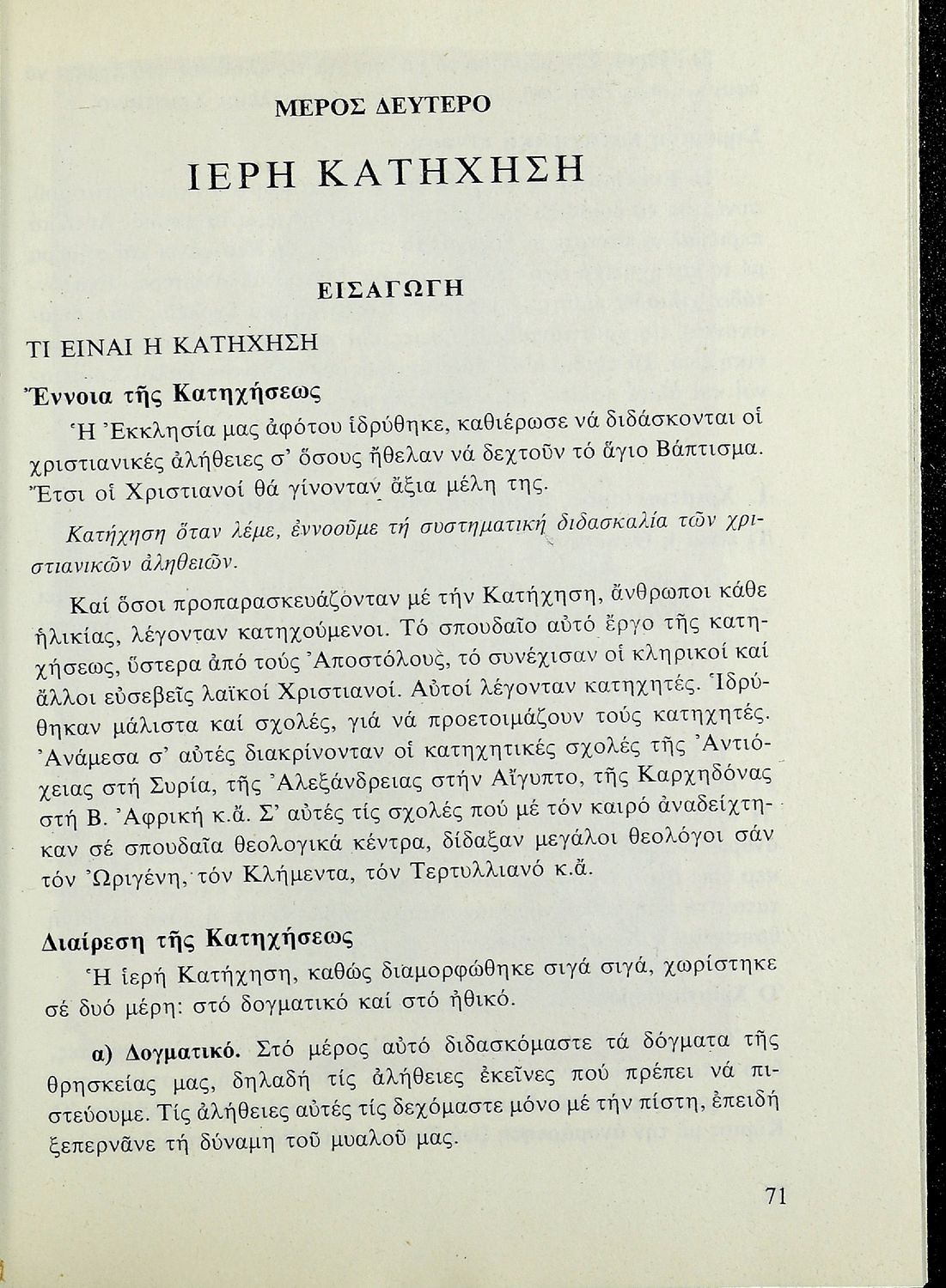 Σχολικό εγχειρίδιο Θρησκευτικών ΣΤ΄ Δημοτικού που αναλύει την έννοια της κατήχησης με έμφαση στο ορθόδοξο χριστιανικό δόγμα, το οποίο εξετάζει από δογματική και ηθική σκοπιά. Περιλαμβάνει και στοιχεία ...