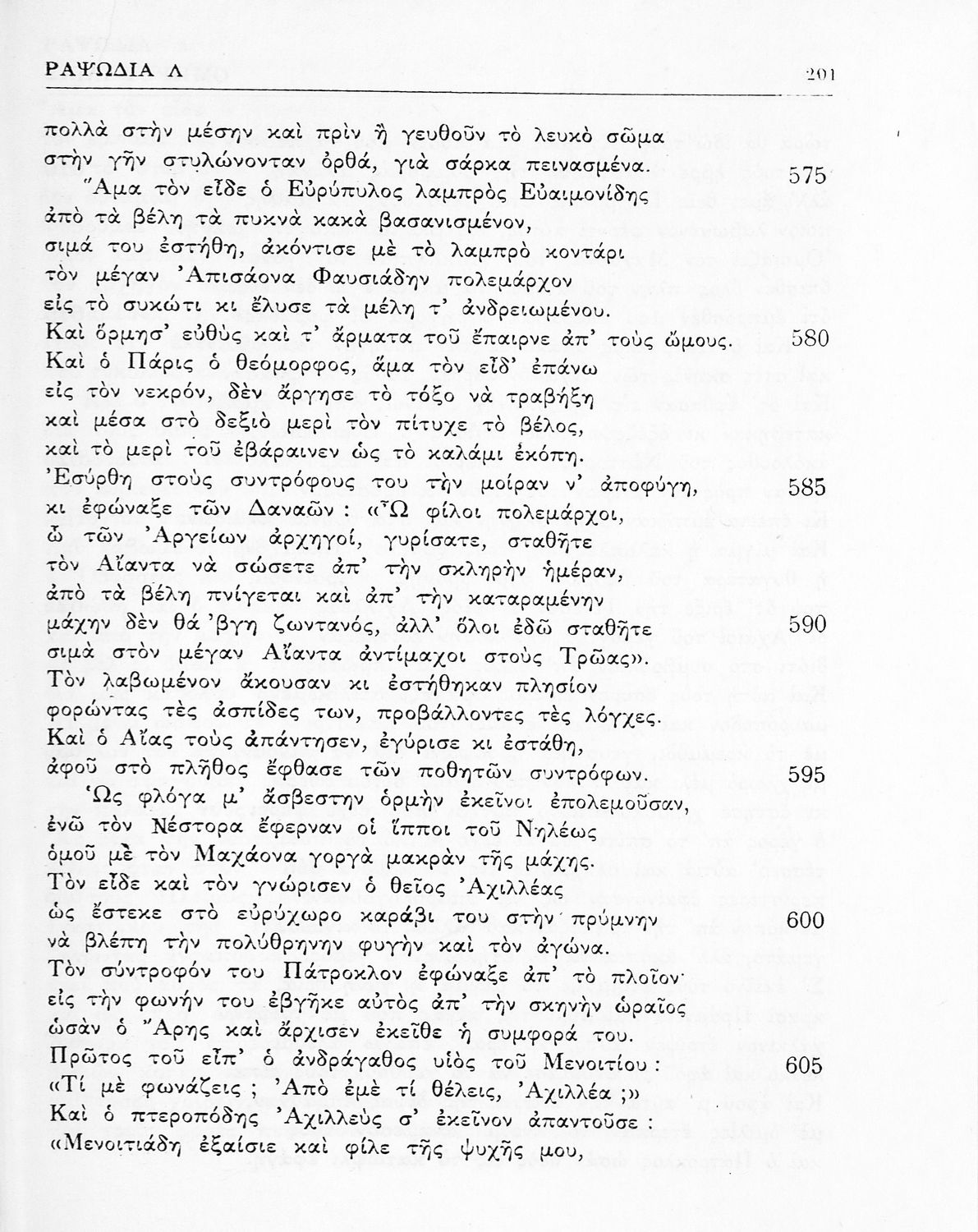 Σχολικό εγχειρίδιο Αρχαίων Ελληνικών. Το βιβλίο περιλαμβάνει την Ιλιάδα του Ομήρου σε μετάφραση του Ιάκωβου Πολυλά και ενδεικτικό Λεξιλόγιο.
