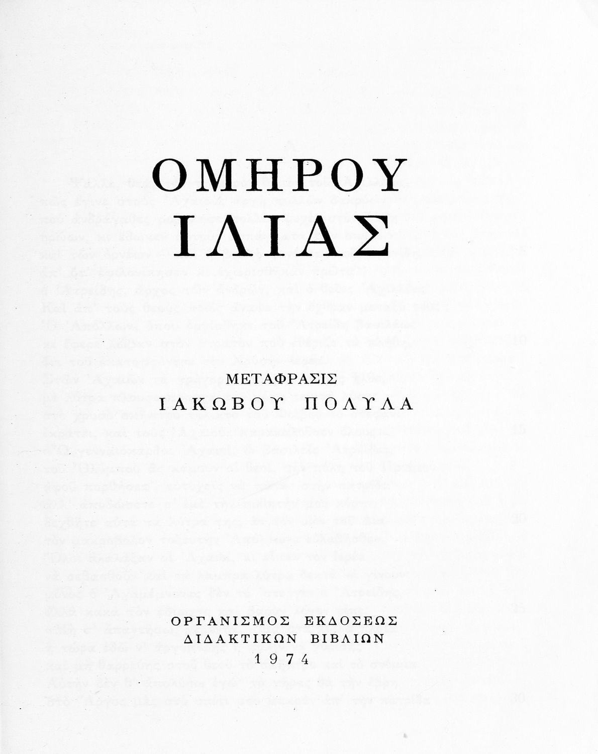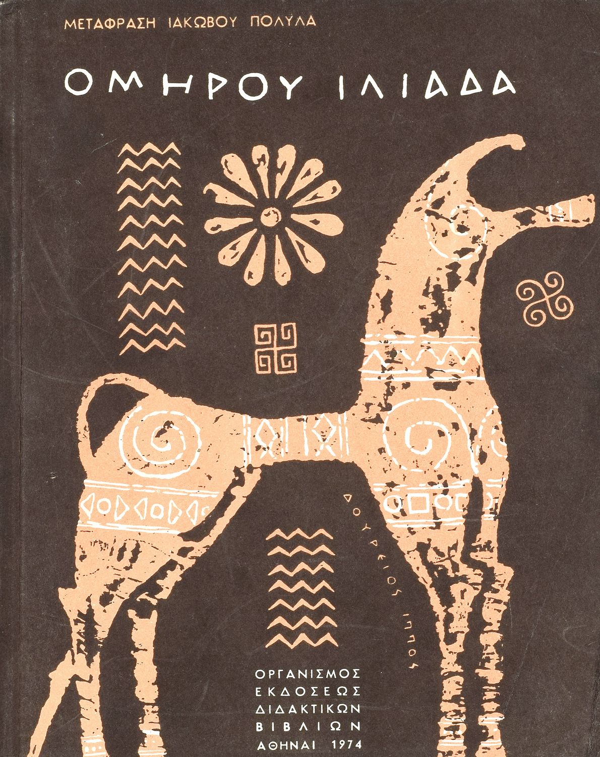 Σχολικό εγχειρίδιο Αρχαίων Ελληνικών. Το βιβλίο περιλαμβάνει την Ιλιάδα του Ομήρου σε μετάφραση του Ιάκωβου Πολυλά και ενδεικτικό Λεξιλόγιο.