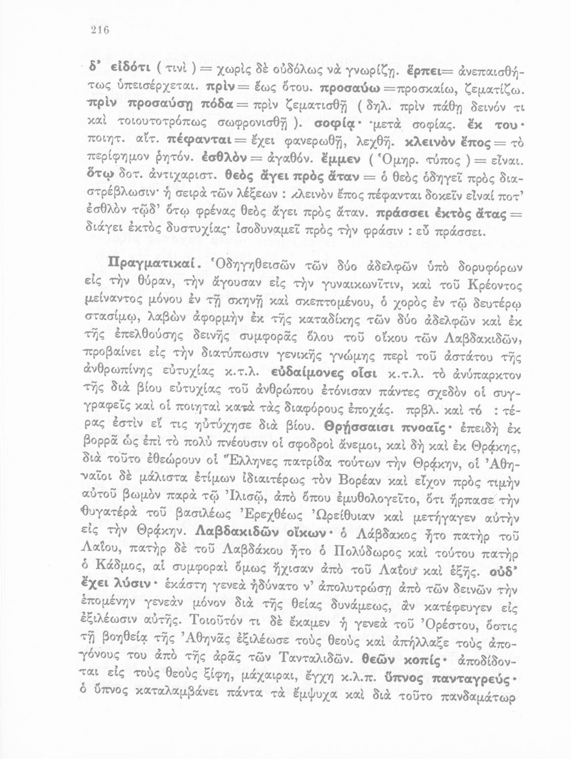 Βαθμίδα εκπαίδευσης: Δευτεροβάθμια Τάξη: ΣΤ' Γυμνασίου Μάθημα: Αρχαία Ελληνικά Γλώσσα: Καθαρεύουσα Παρουσίαση περιεχομένου: Σχολικό εγχειρίδιο Αρχαίων Ελληνικών. Το βιβλίο περιλαμβάνει εισαγωγή σχετικά με το αρχαίο δράμα, τη ζωή και το έργο του Σοφοκλή καθώς και για το περιεχόμενου των τραγωδιών "Οιδίπους Τύραννος" και "Αντιγόνη". Ακολουθούν αποσπάσματα από τις δύο παραπάνω τραγωδίες τα οποία συνοδεύονται από ερμηνευτικές σημειώσεις. |