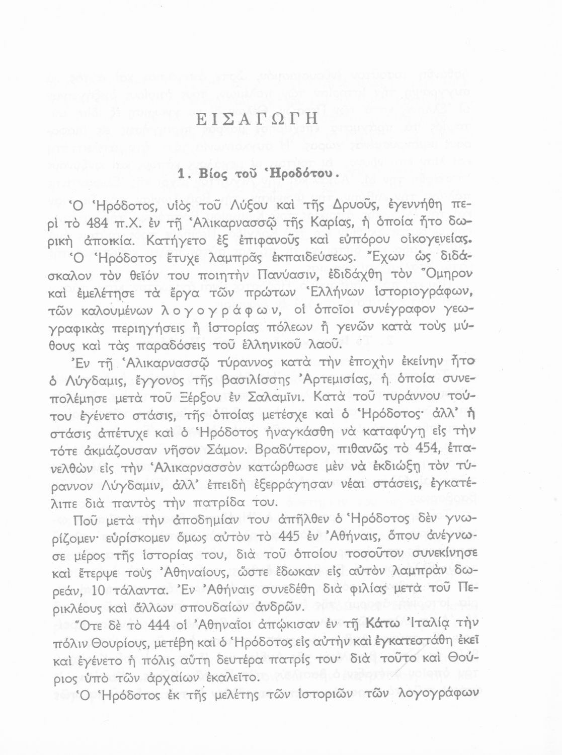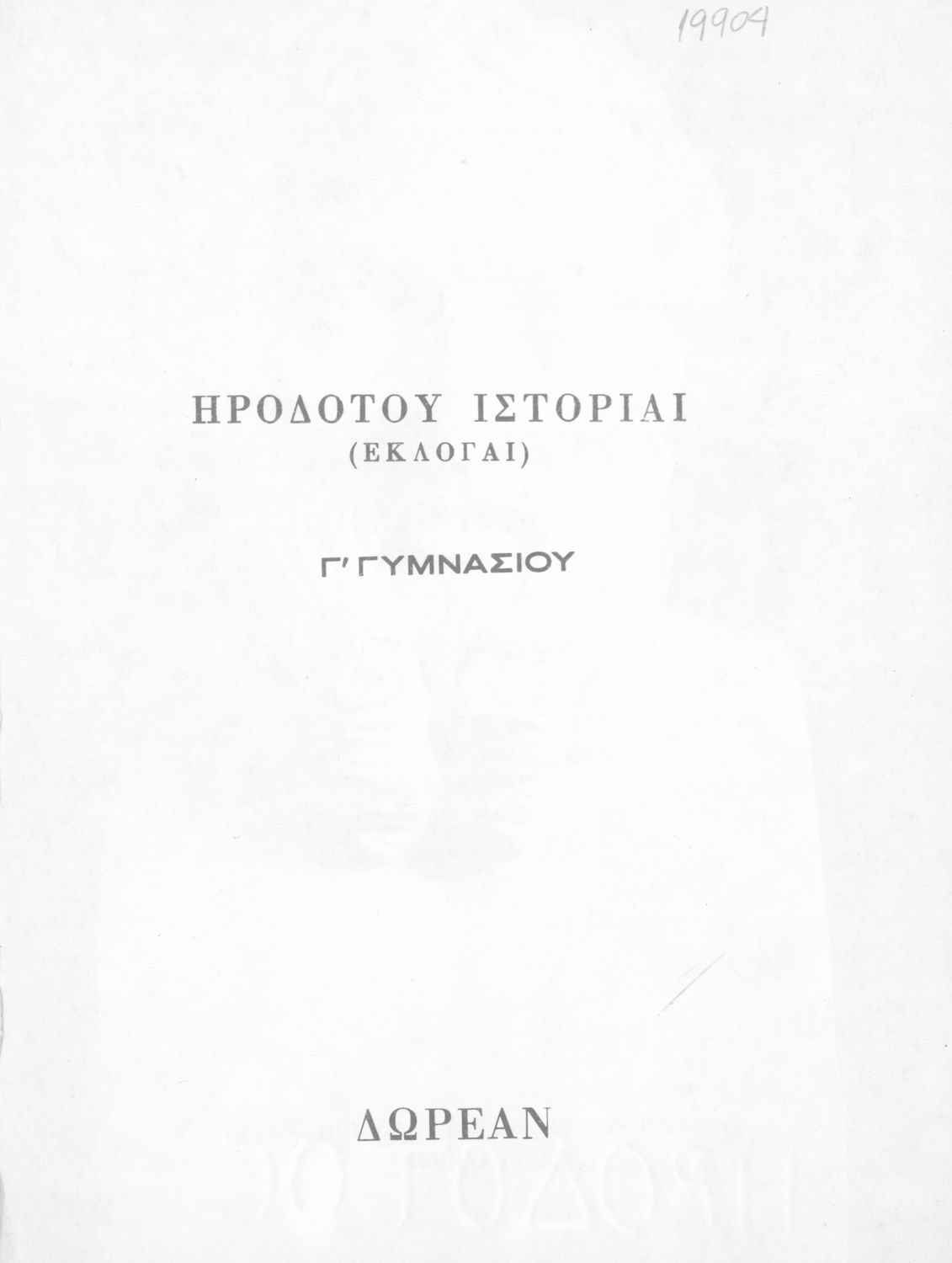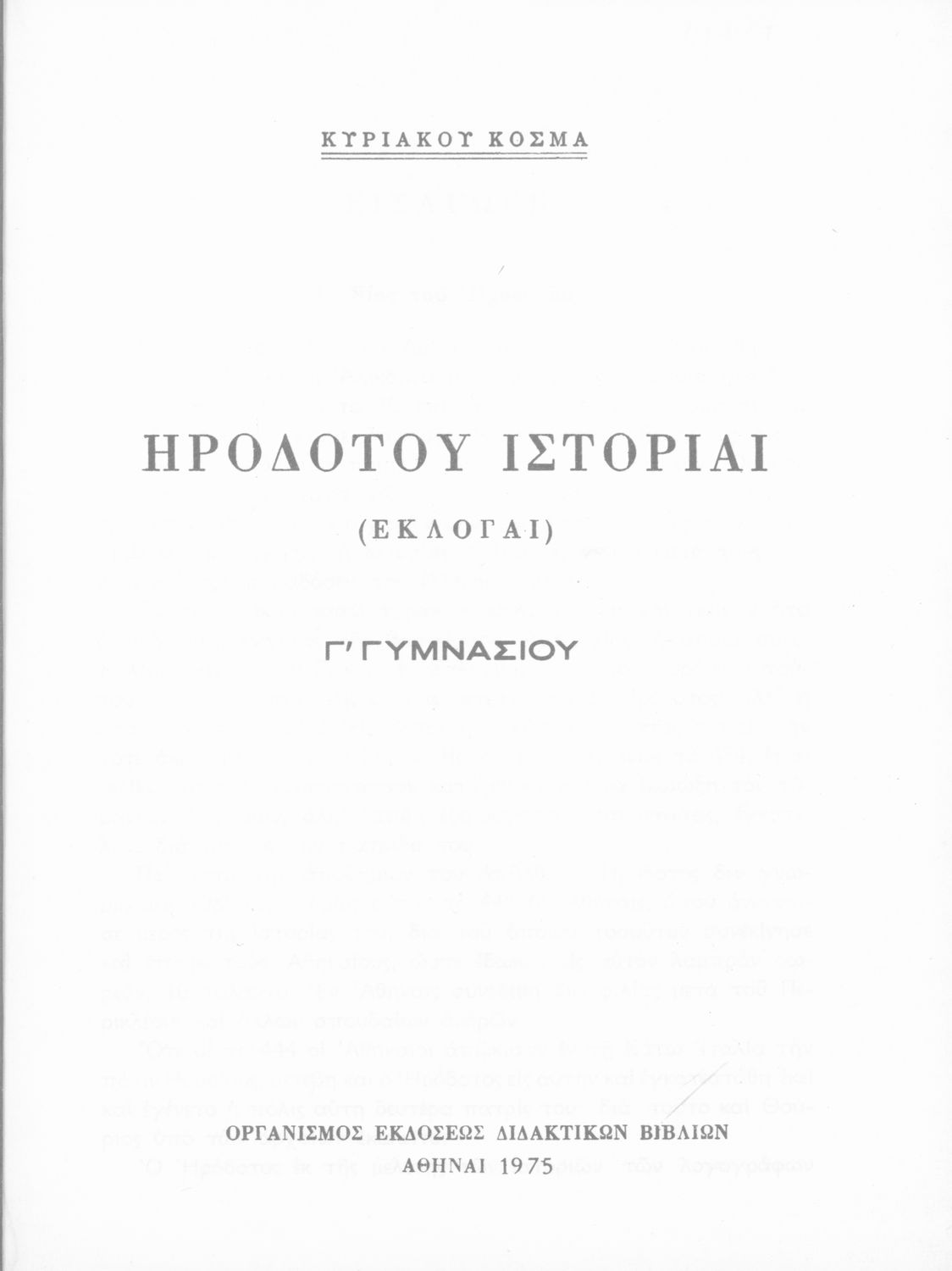 Σχολικό εγχειρίδιο Αρχαίων Ελληνικών Γ΄ Γυμνασίου που περιλαμβάνει εισαγωγή στη ζωή και το έργο του Ηρόδοτου, αποσπάσματα από την Ιστορία του, ερμηνευτικές σημειώσεις και τοπογραφικούς πίνακες με εικόνες και χάρτες.