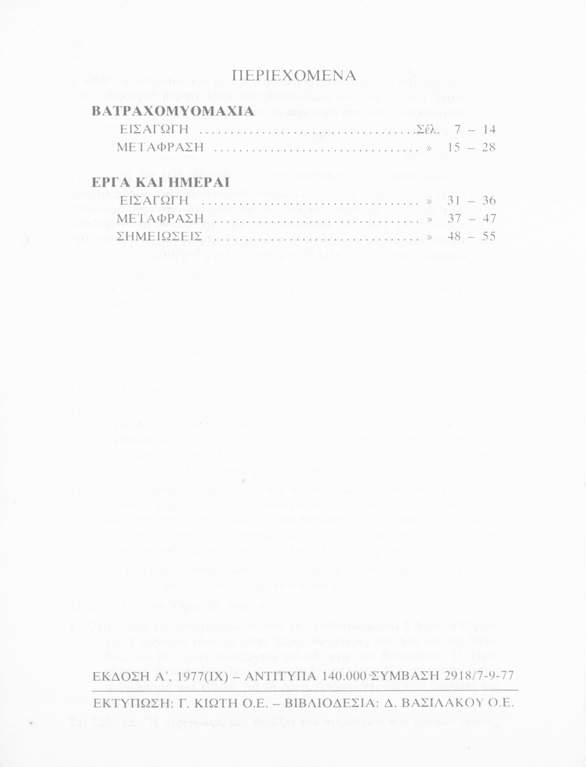 Σχολικό εγχειρίδιο Αρχαίων Ελληνικών Β' Γυμνασίου που περιέχει την Βατραχομυομαχία του Όμηρου και τα Έργα και Ημέραι του Ησίοδου σε μετάφραση, και ερμηνευτικές και λεξιλογικές παρατηρήσεις.