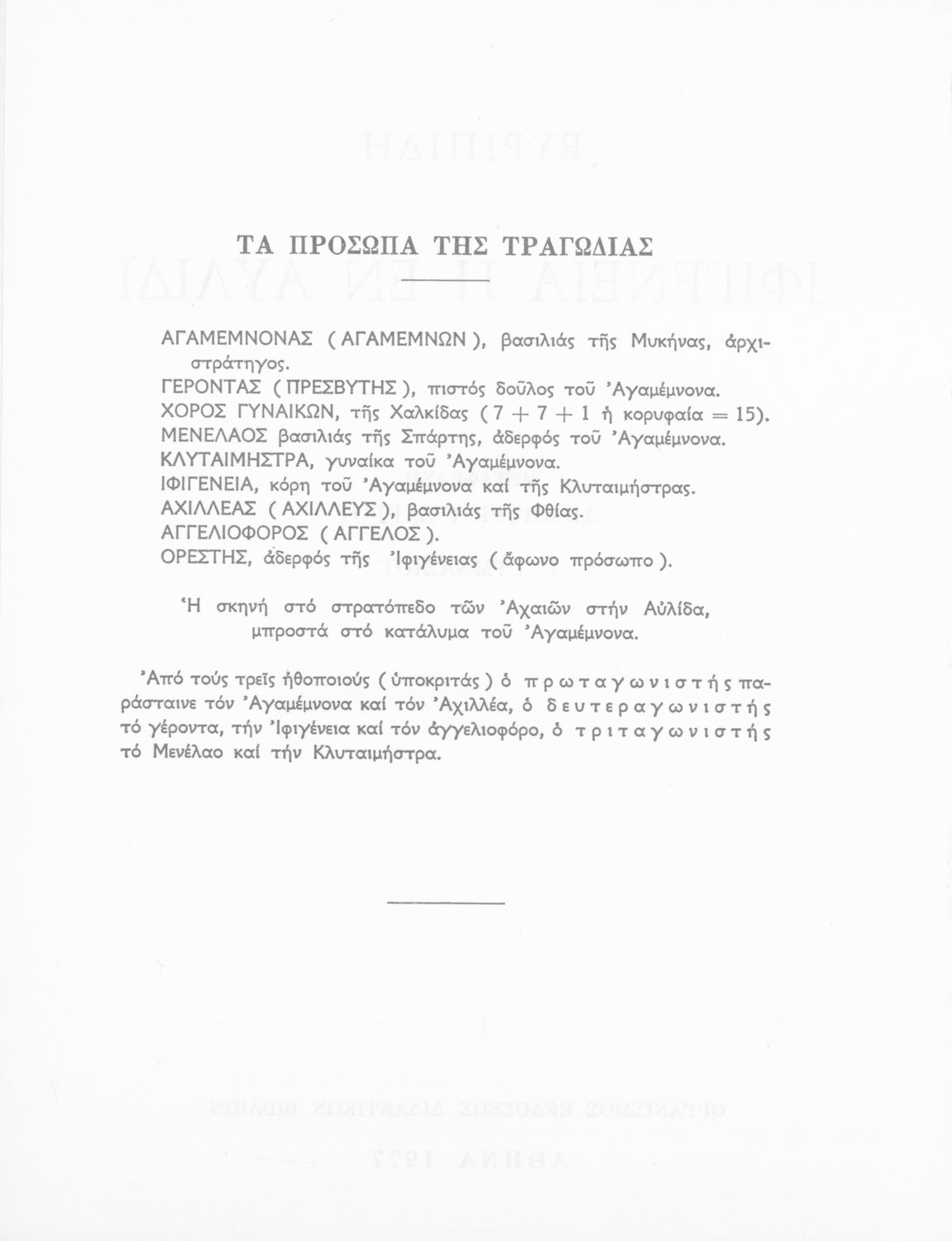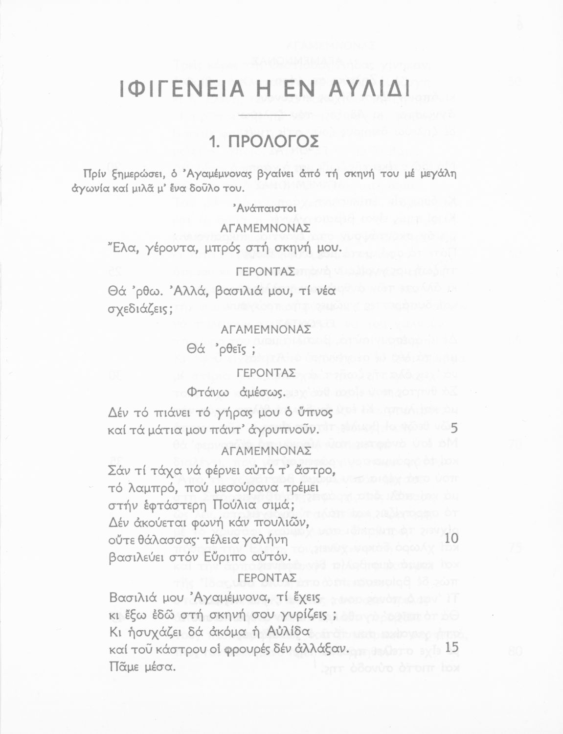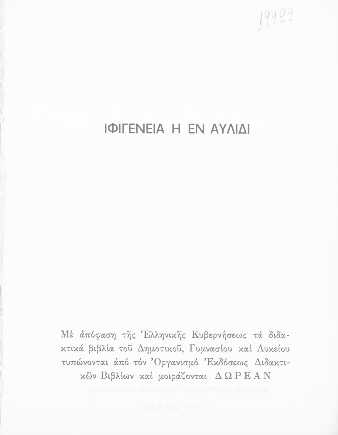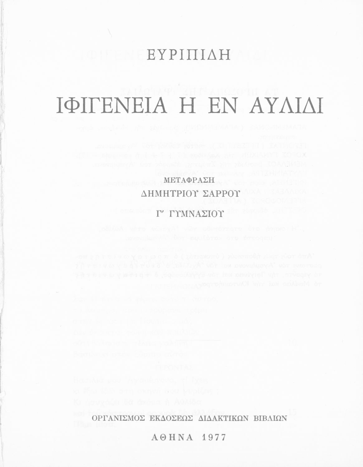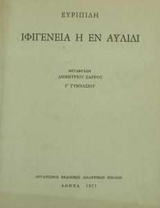 Βαθμίδα εκπαίδευσης: Δευτεροβάθμια Τάξη: Γ' Γυμνασίου Μάθημα: Αρχαία Ελληνικά Γλώσσα: Δημοτική Παρουσίαση περιεχομένου: Σχολικό εγχειρίδιο Αρχαίων Ελληνικών Γ΄ Γυμνασίου που περιλαμβάνει αποσπάσματα από την τραγωδία του Ευριπίδη Ιφιγένεια η εν Αυλίδι σε μετάφραση και επεξηγηματικά σημειώματα. |
