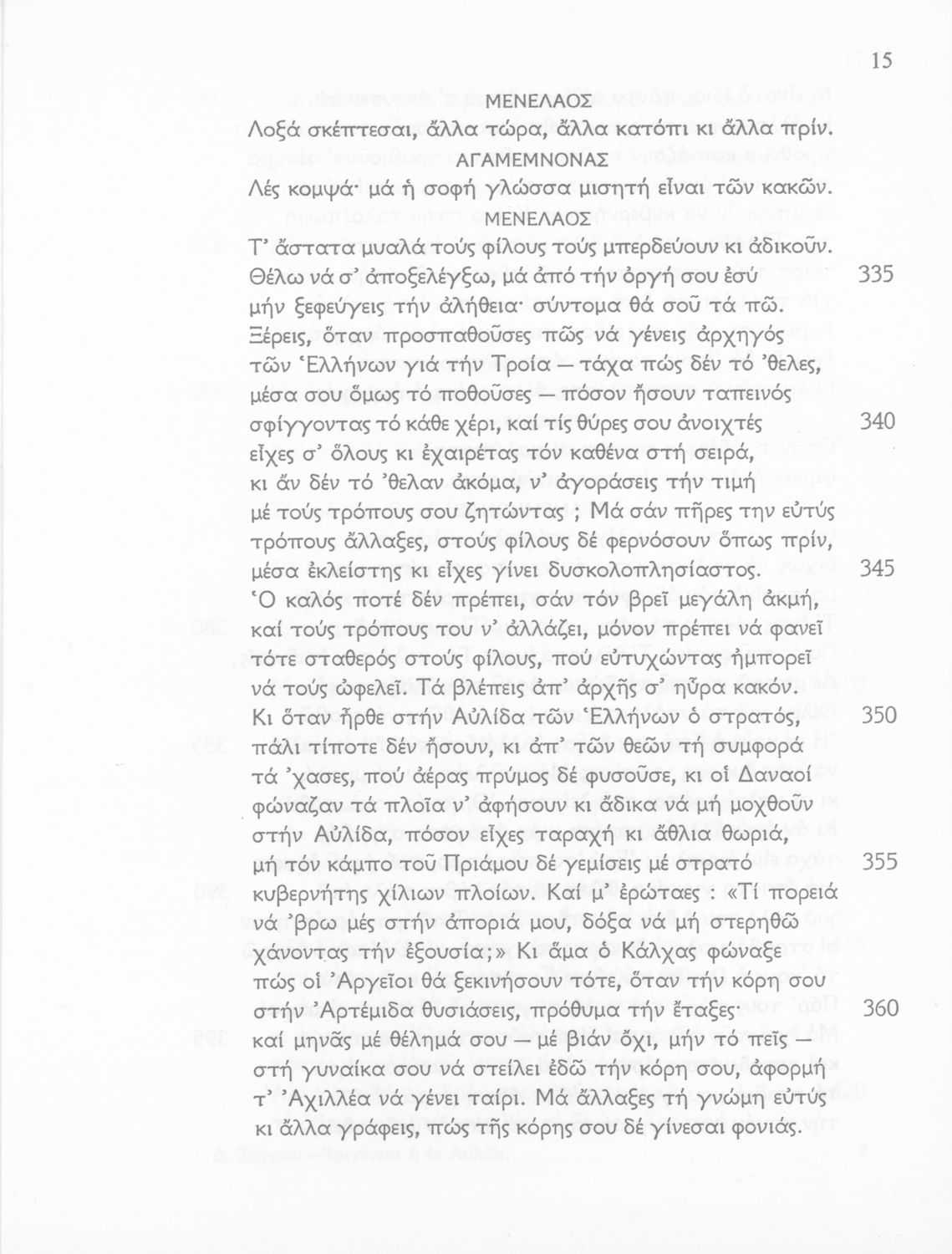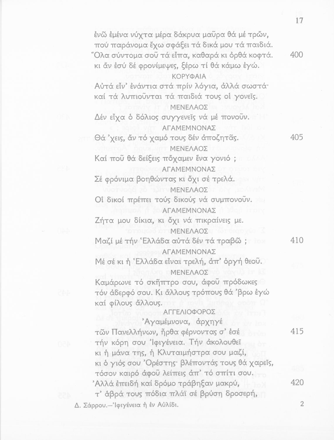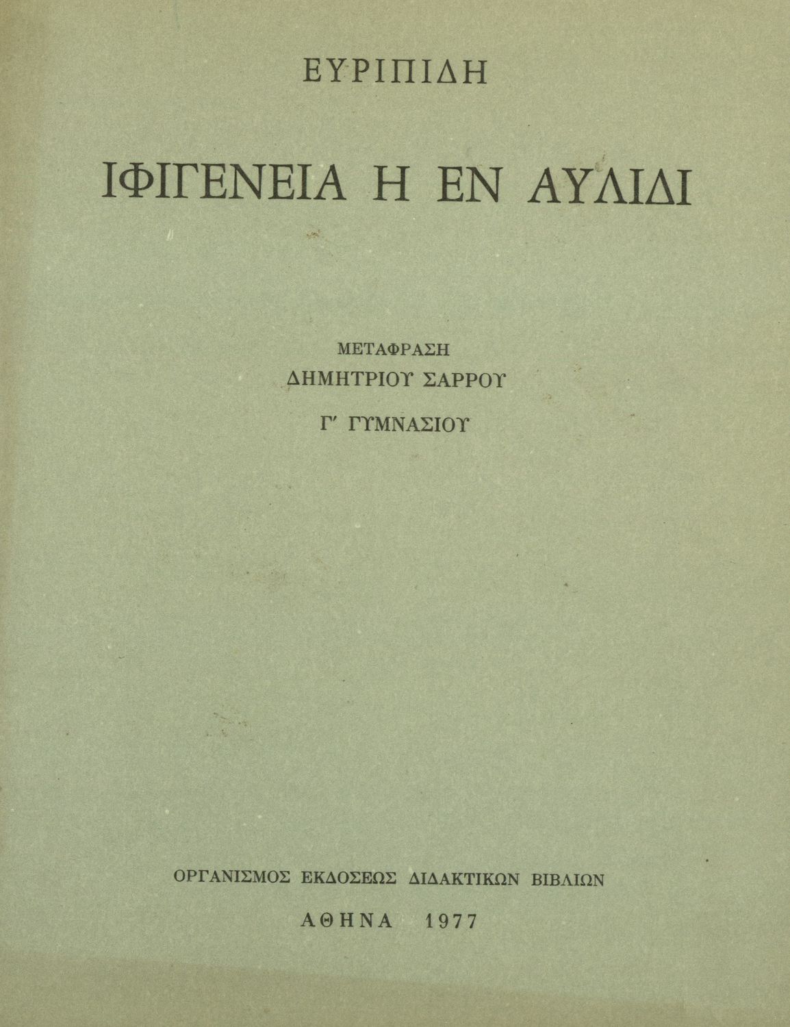 Σχολικό εγχειρίδιο Αρχαίων Ελληνικών Γ΄ Γυμνασίου που περιλαμβάνει αποσπάσματα από την τραγωδία του Ευριπίδη Ιφιγένεια η εν Αυλίδι σε μετάφραση και επεξηγηματικά σημειώματα.