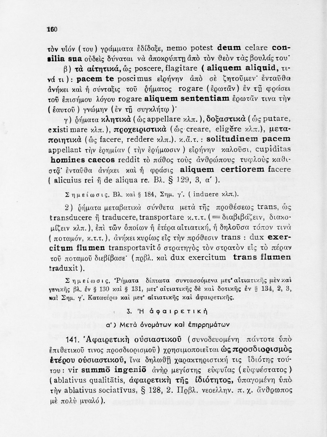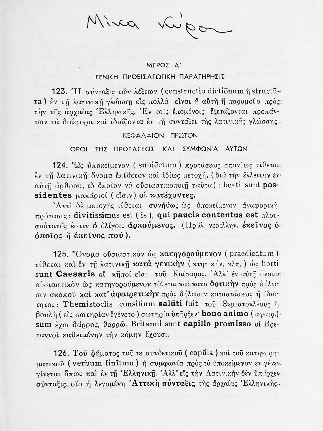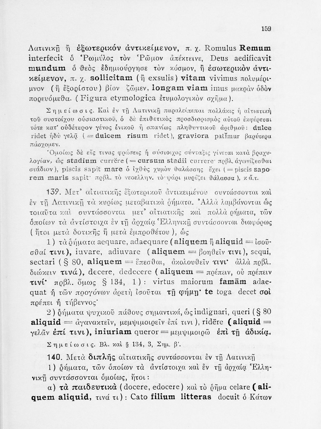 Σχολικό εγχειρίδιο Λατινικών Α΄, Β΄, Γ' Γυμνασίου που περιλαμβάνει γραμματική και συντακτικό και είναι χωρισμένο σε φθογγολογικό, τυπολογικό και ετυμολογικό μέρος.