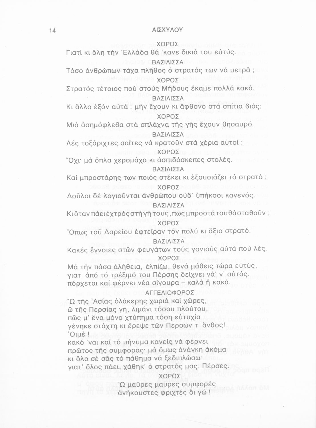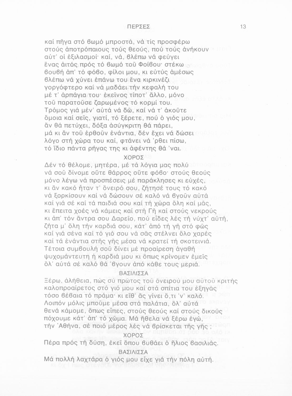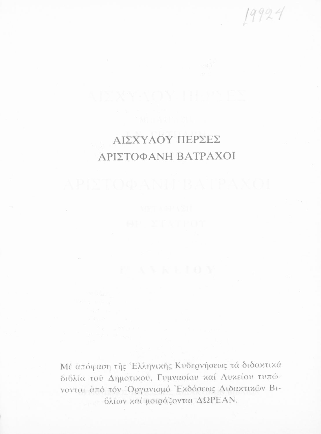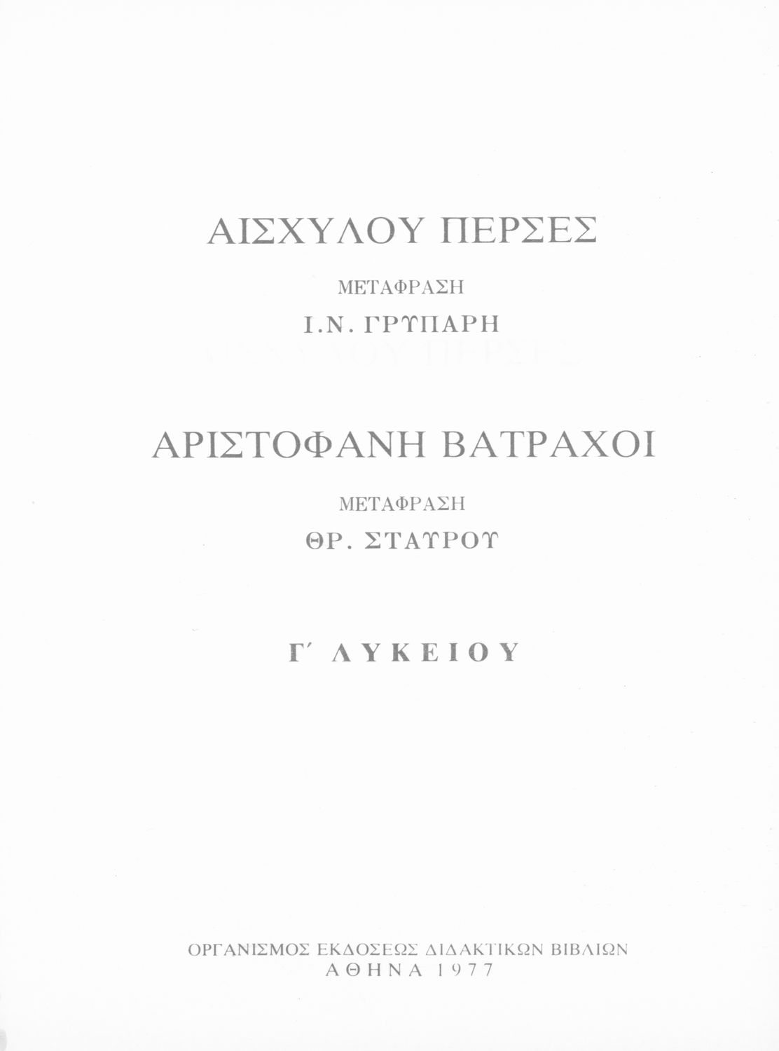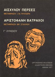Σχολικό εγχειρίδιο Αρχαίων Ελληνικών Γ΄ Λυκείου που περιλαμβάνει αποσπάσματα από την Τραγωδία του Αισχύλου Πέρσες σε μετάφραση Ι. Ν. Γρυπάρη, εισαγωγικό σημείωμα σχετικά με την αρχαία ελληνική κωμωδία του Ι. Κ. Κακριδή και αποσπάσματα από την κωμωδία του Αριστοφάνη Βάτραχοι σε μετάφραση και ερμηνευτικά σχόλια του Θρ. Σταύρου.