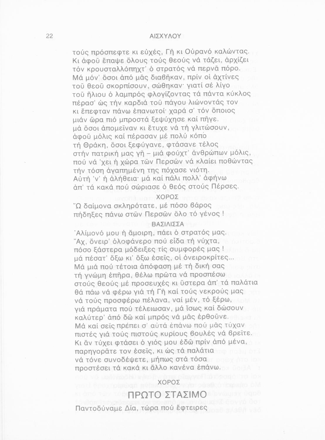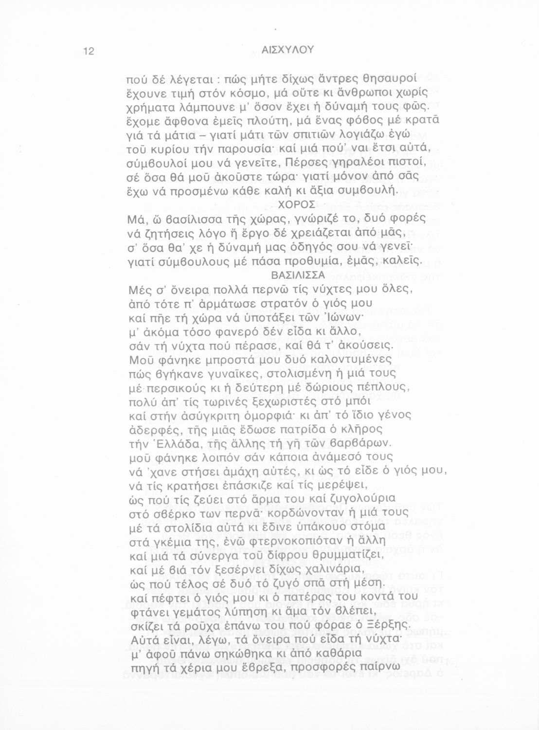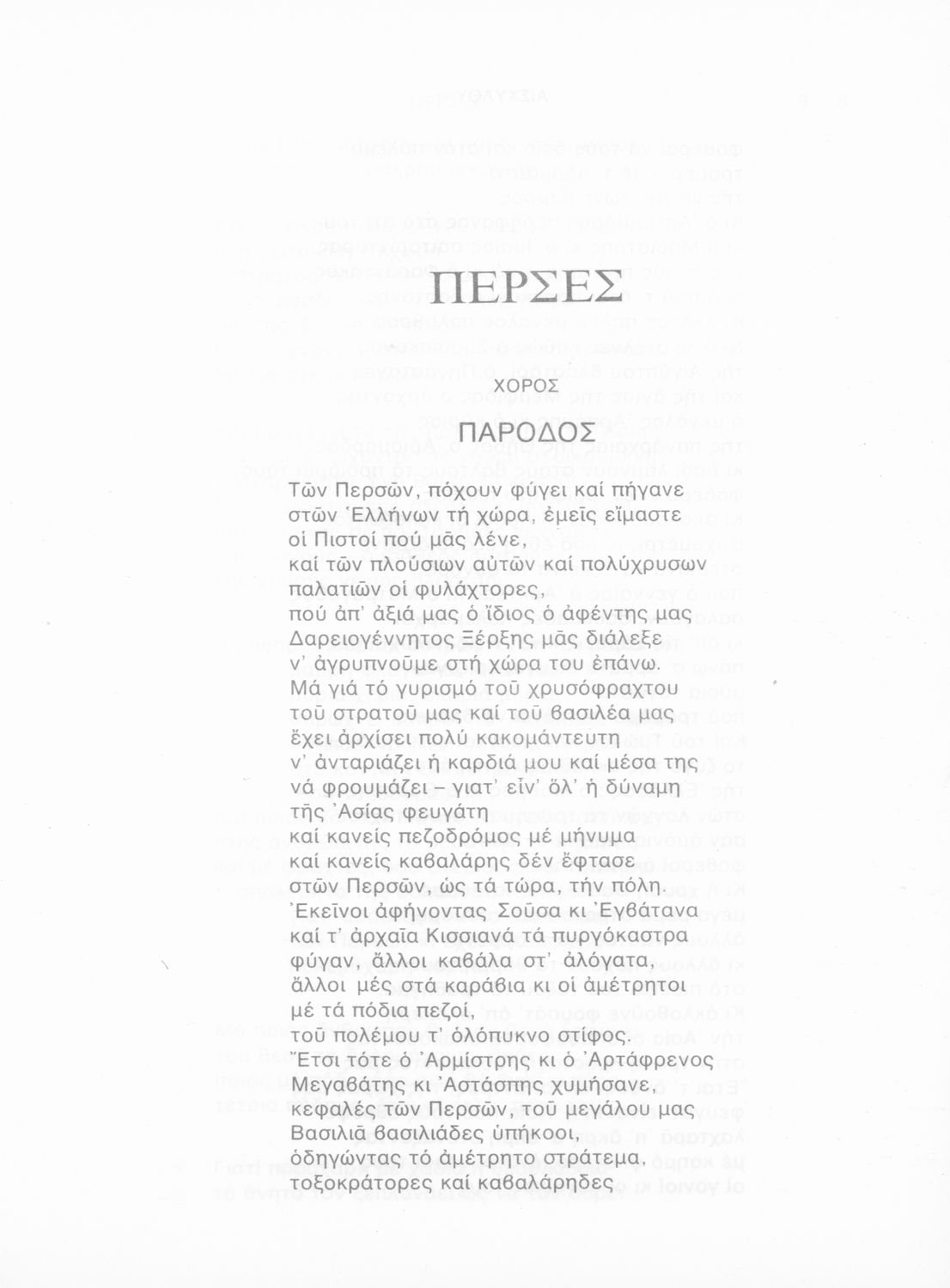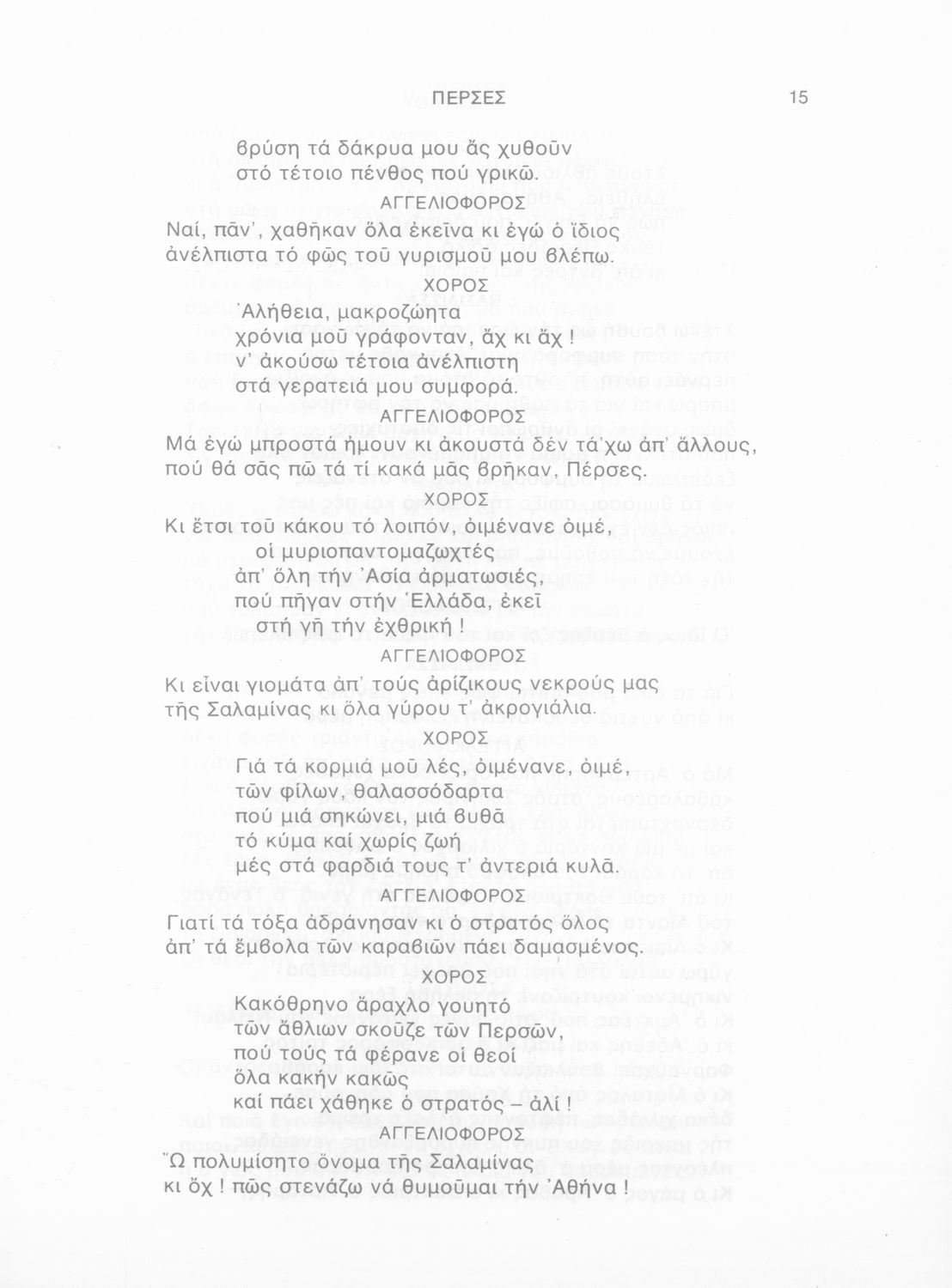 Σχολικό εγχειρίδιο Αρχαίων Ελληνικών Γ΄ Λυκείου που περιλαμβάνει αποσπάσματα από την Τραγωδία του Αισχύλου Πέρσες σε μετάφραση Ι. Ν. Γρυπάρη, εισαγωγικό σημείωμα σχετικά με την αρχαία ελληνική κωμωδία του Ι. Κ. Κακριδή και αποσπάσματα από την κωμωδία του Αριστοφάνη Βάτραχοι σε μετάφραση και ερμηνευτικά σχόλια του Θρ. Σταύρου.