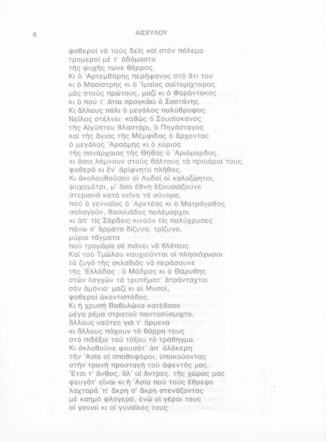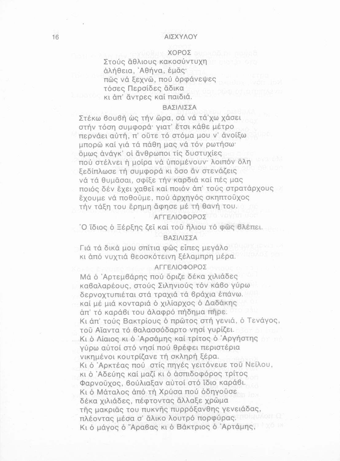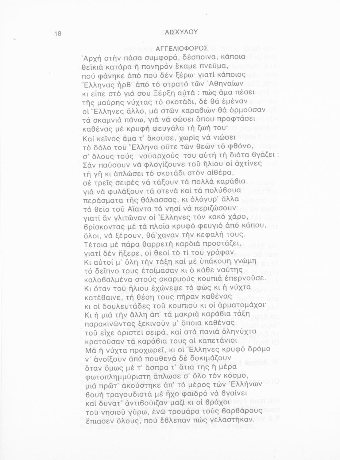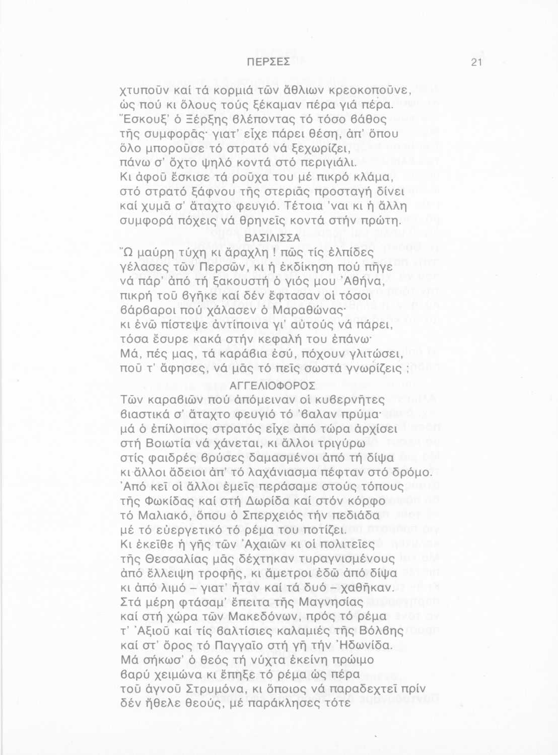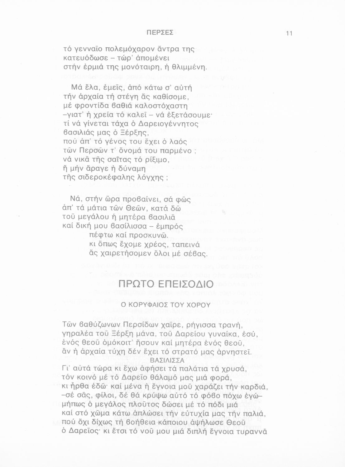 Σχολικό εγχειρίδιο Αρχαίων Ελληνικών Γ΄ Λυκείου που περιλαμβάνει αποσπάσματα από την Τραγωδία του Αισχύλου Πέρσες σε μετάφραση Ι. Ν. Γρυπάρη, εισαγωγικό σημείωμα σχετικά με την αρχαία ελληνική κωμωδία του Ι. Κ. Κακριδή και αποσπάσματα από την κωμωδία του Αριστοφάνη Βάτραχοι σε μετάφραση και ερμηνευτικά σχόλια του Θρ. Σταύρου.