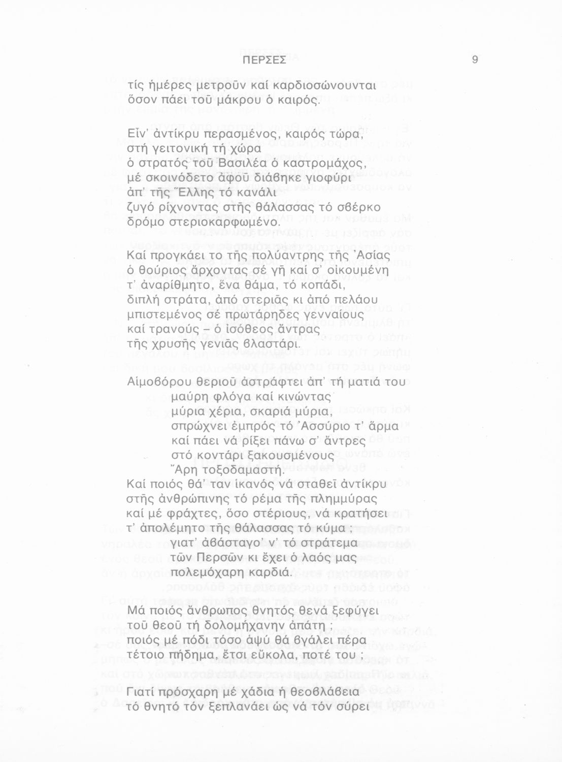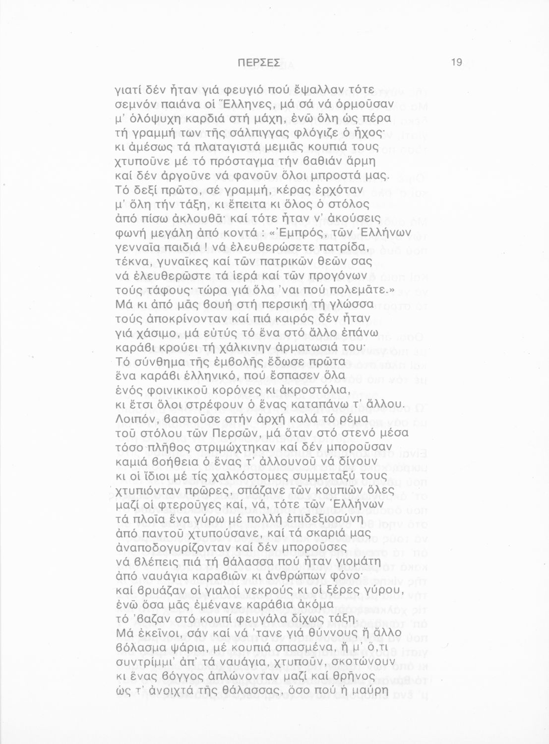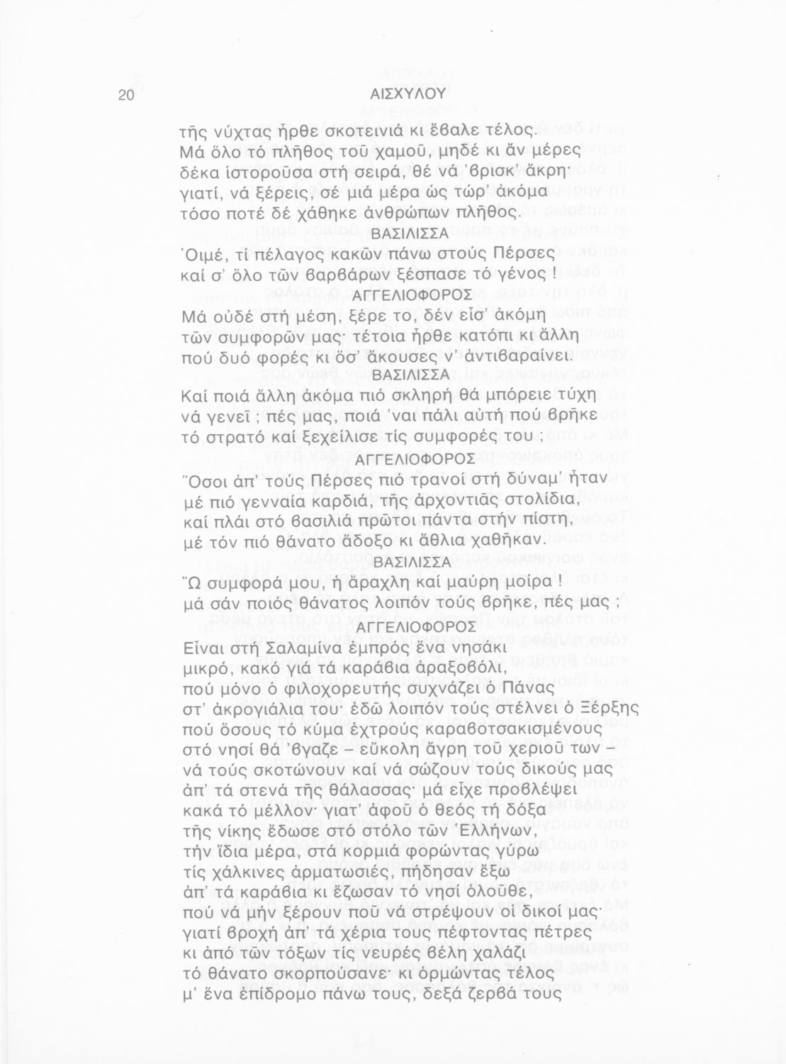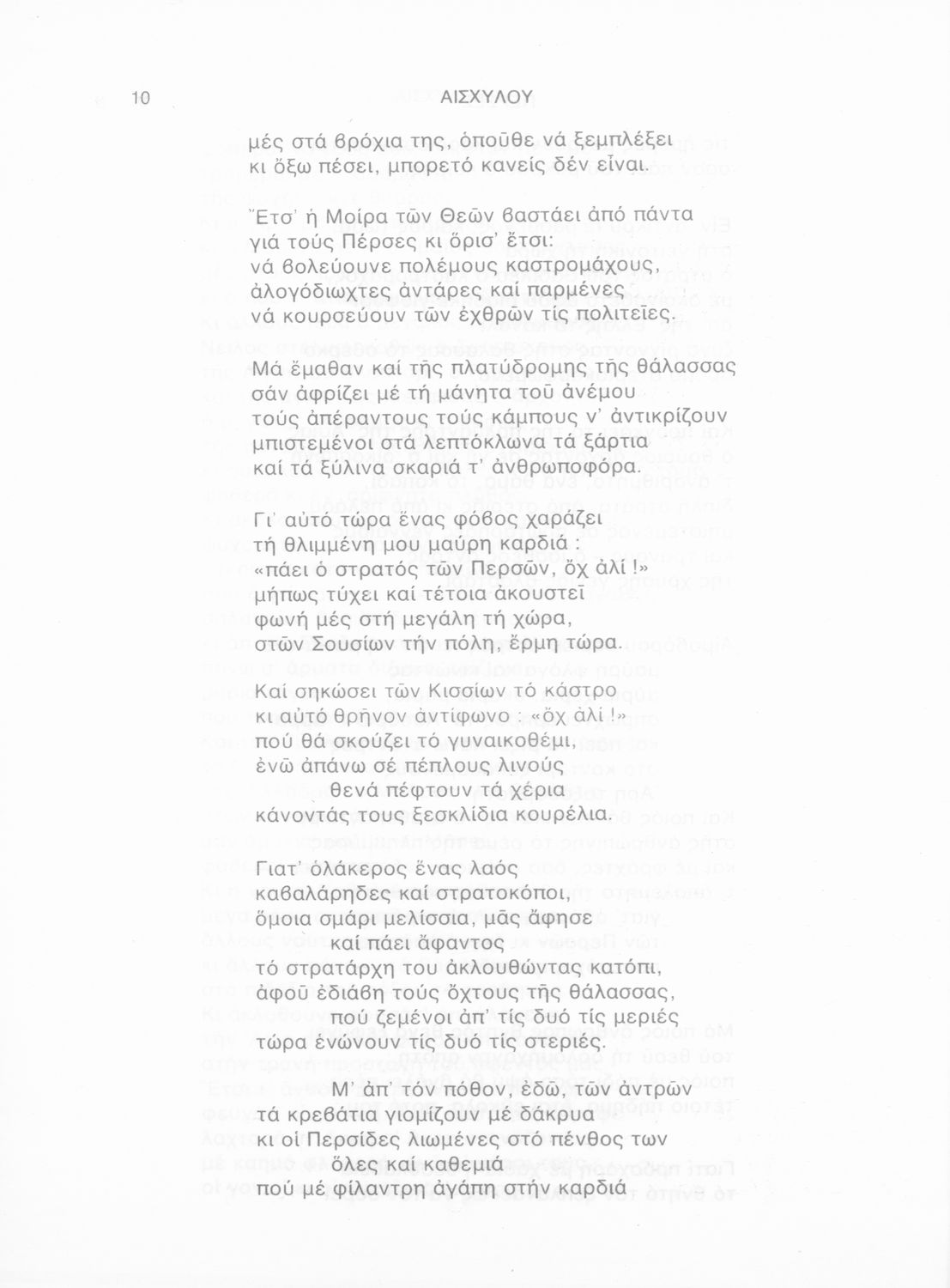 Σχολικό εγχειρίδιο Αρχαίων Ελληνικών Γ΄ Λυκείου που περιλαμβάνει αποσπάσματα από την Τραγωδία του Αισχύλου Πέρσες σε μετάφραση Ι. Ν. Γρυπάρη, εισαγωγικό σημείωμα σχετικά με την αρχαία ελληνική κωμωδία του Ι. Κ. Κακριδή και αποσπάσματα από την κωμωδία του Αριστοφάνη Βάτραχοι σε μετάφραση και ερμηνευτικά σχόλια του Θρ. Σταύρου.