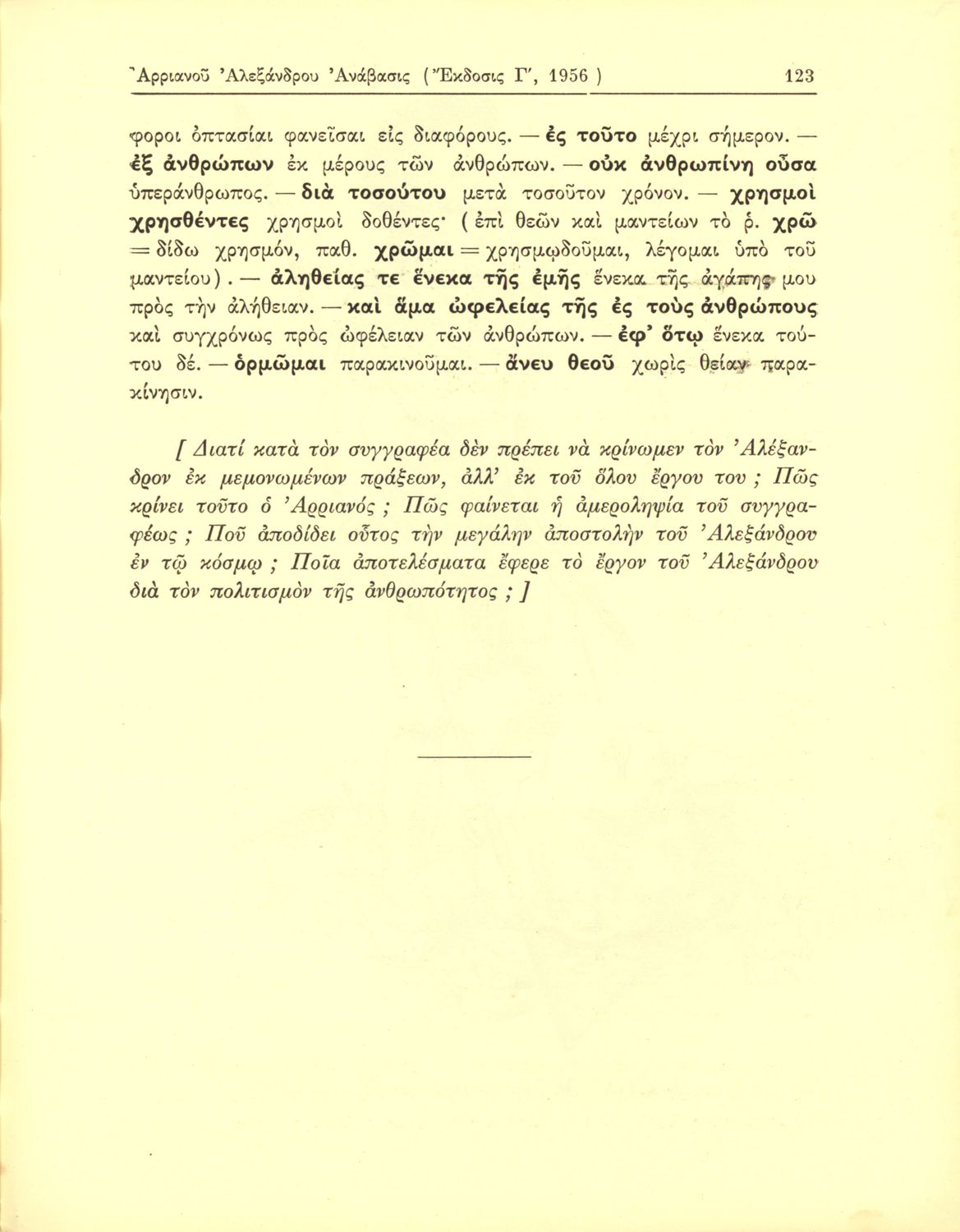 Σχολικό εγχειρίδιο Αρχαίων Ελληνικών Γ΄ Γυμνασίου που περιλαμβάνεται εισαγωγή σχετικά με την εποχή του Αρριανού, τη ζωή και το έργο του αποσπάσματα από το Αλεξάνδρου Ανάβασις, ερμηνευτικές σημειώσεις, εικόνες,