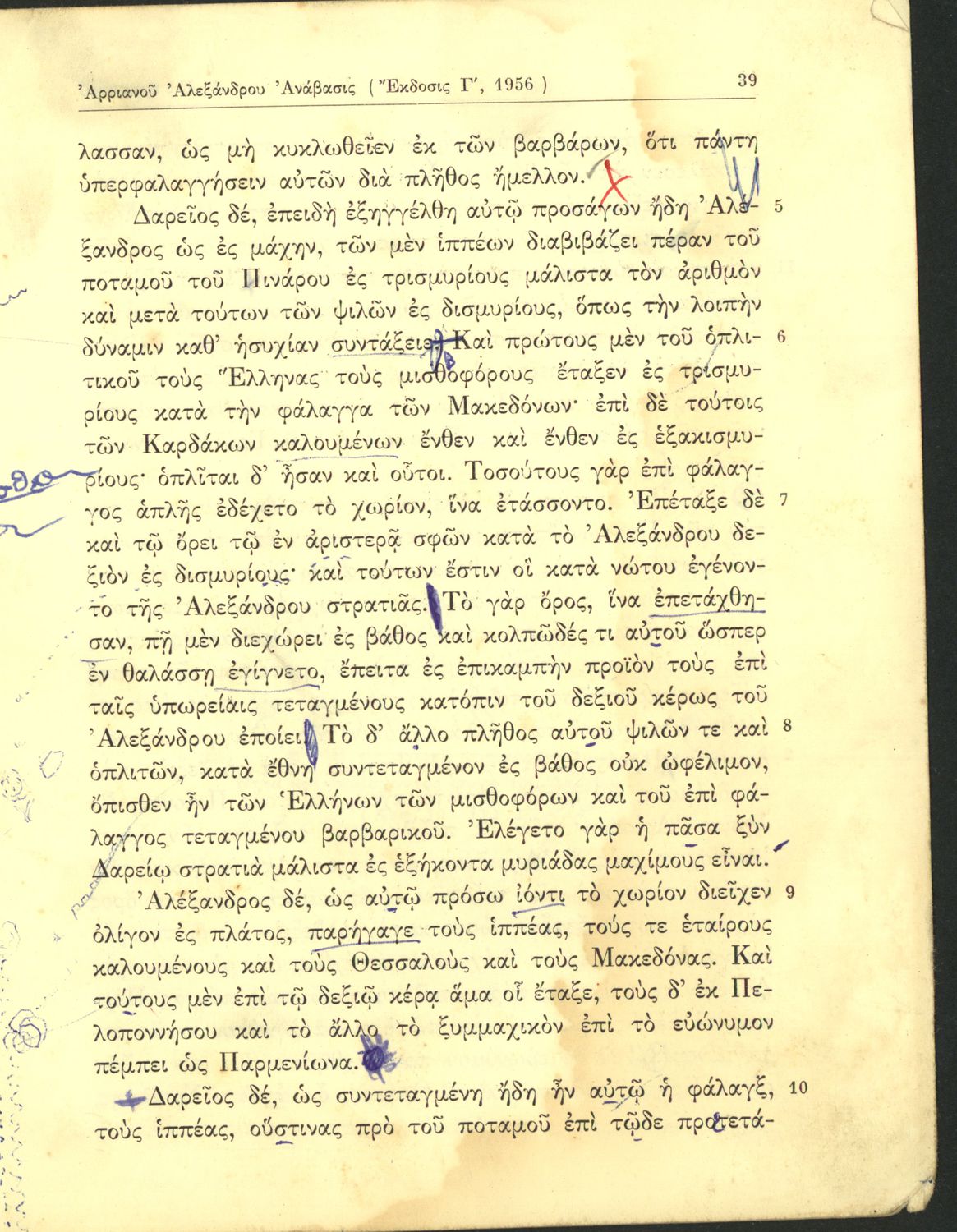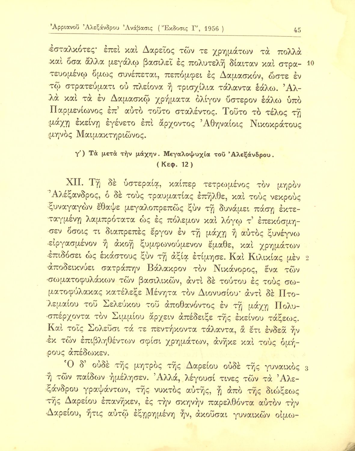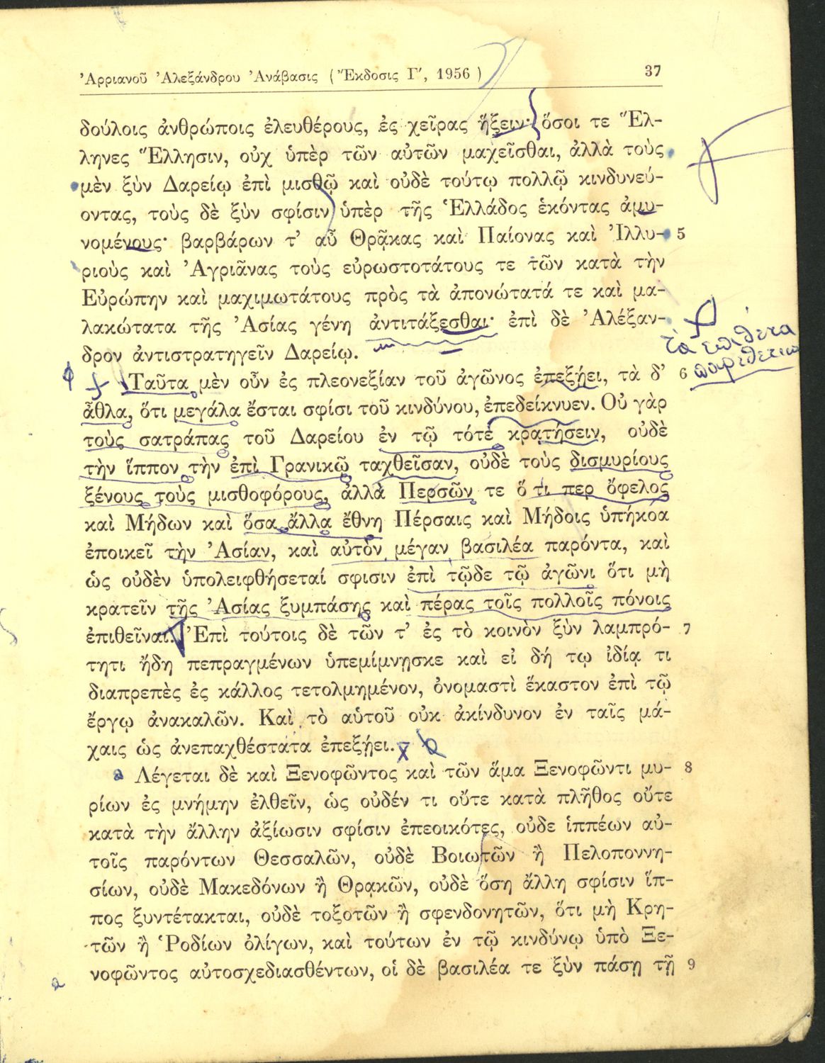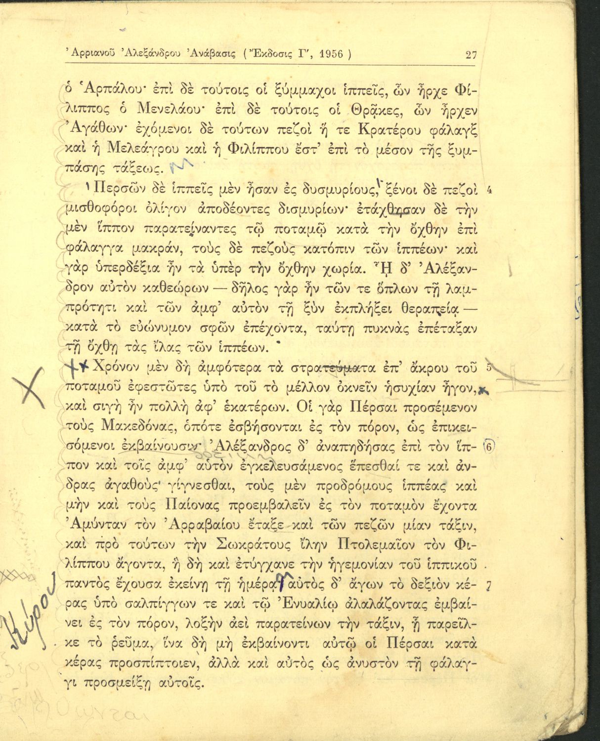Σχολικό εγχειρίδιο Αρχαίων Ελληνικών που περιλαμβάνει αποσπάσματα από το έργο του Αρριανού Αλέξανδρου Ανάβασις και του Ηρόδοτου Ιστορίαι, ερμηνευτικές και λεξιλογικές παρατηρήσεις καθώς και τοπογραφικούς πίνακες και χάρτες..