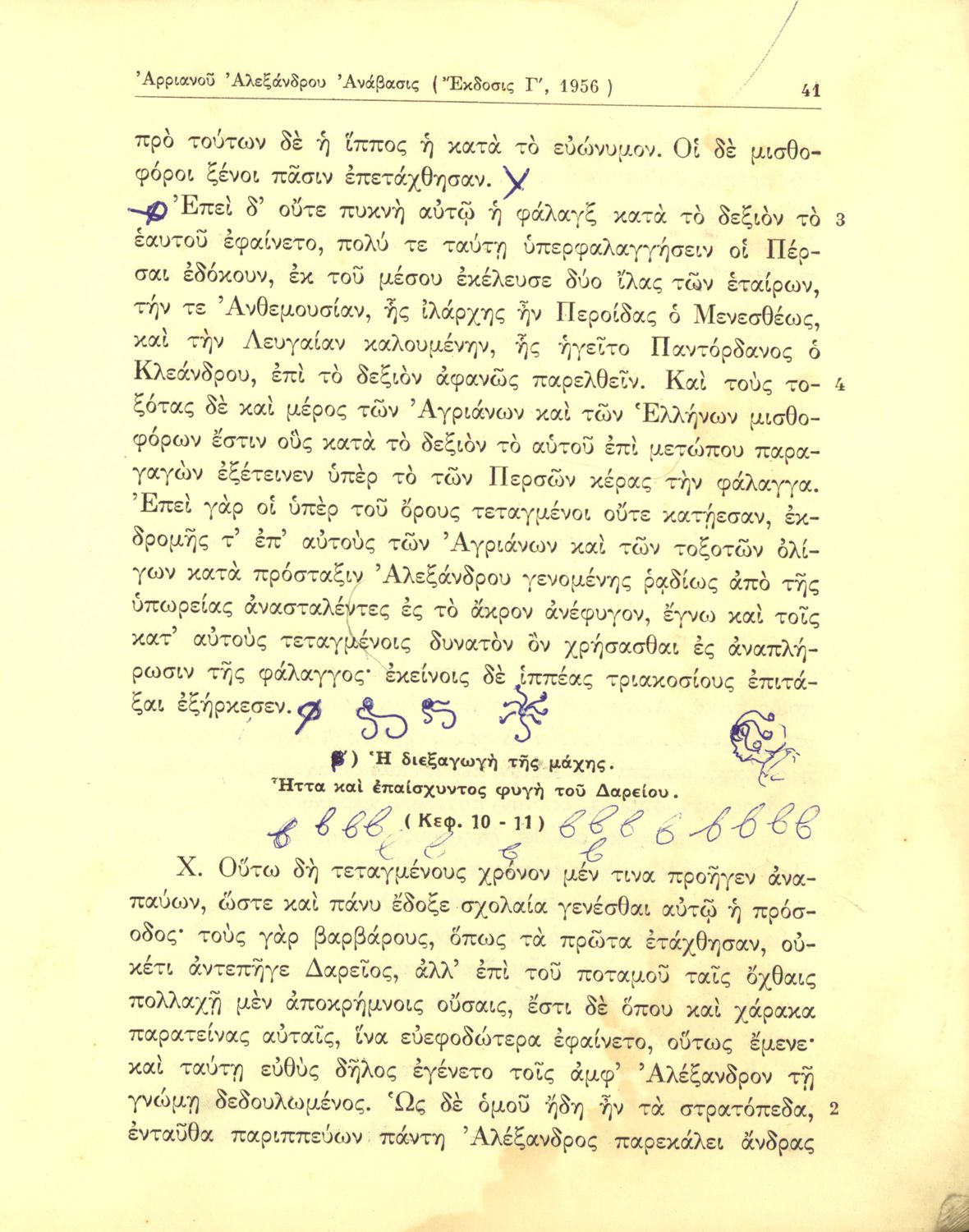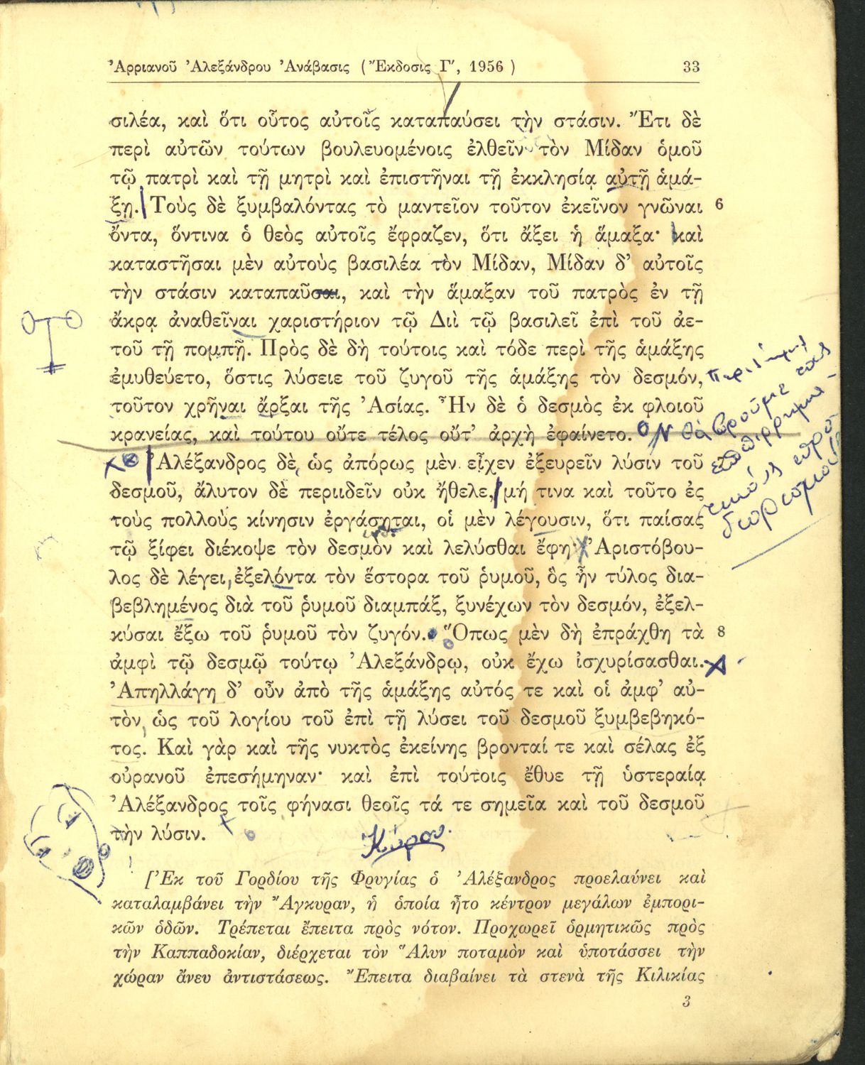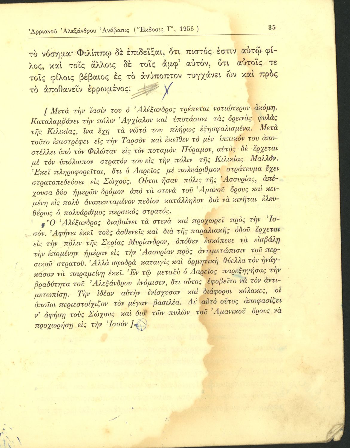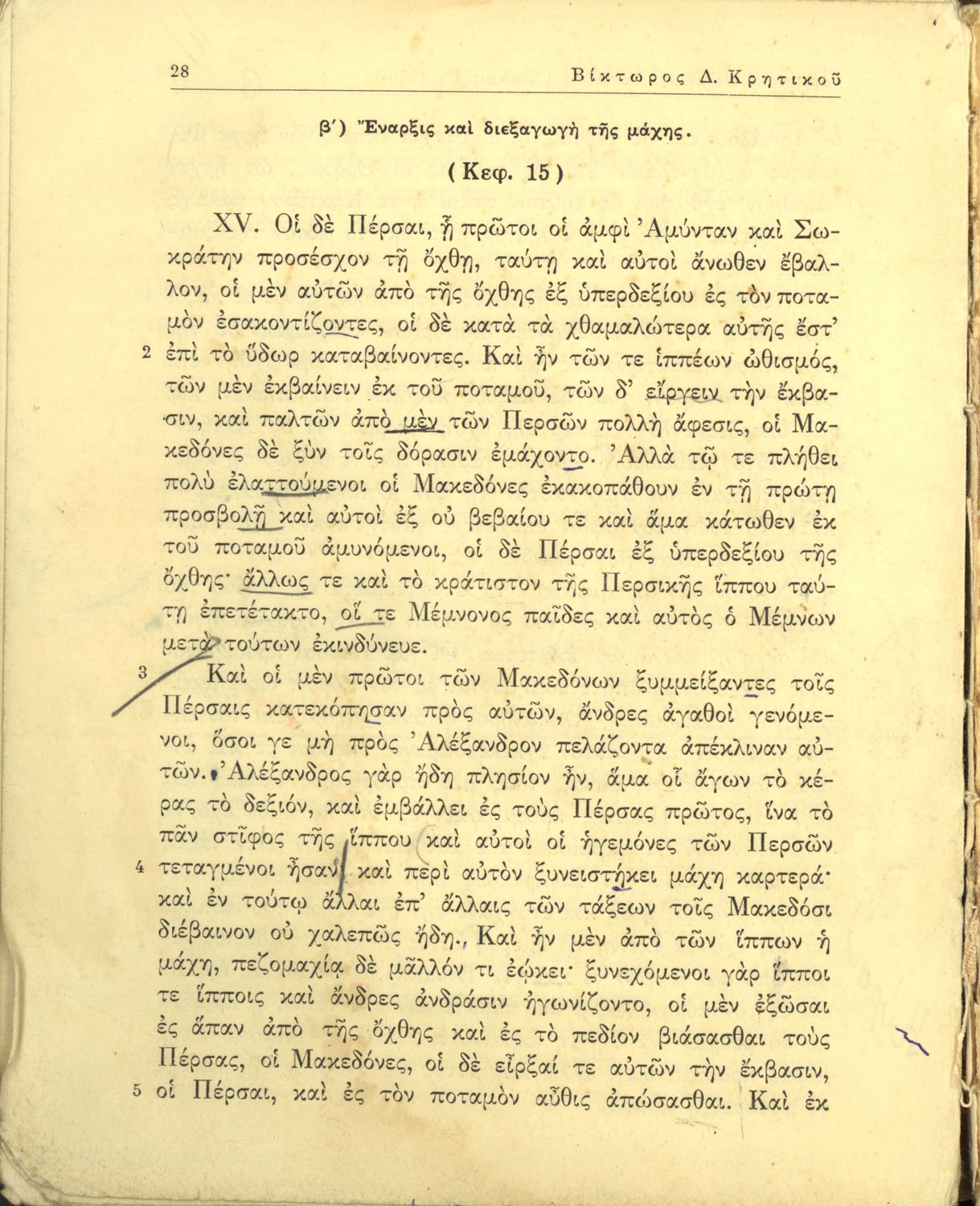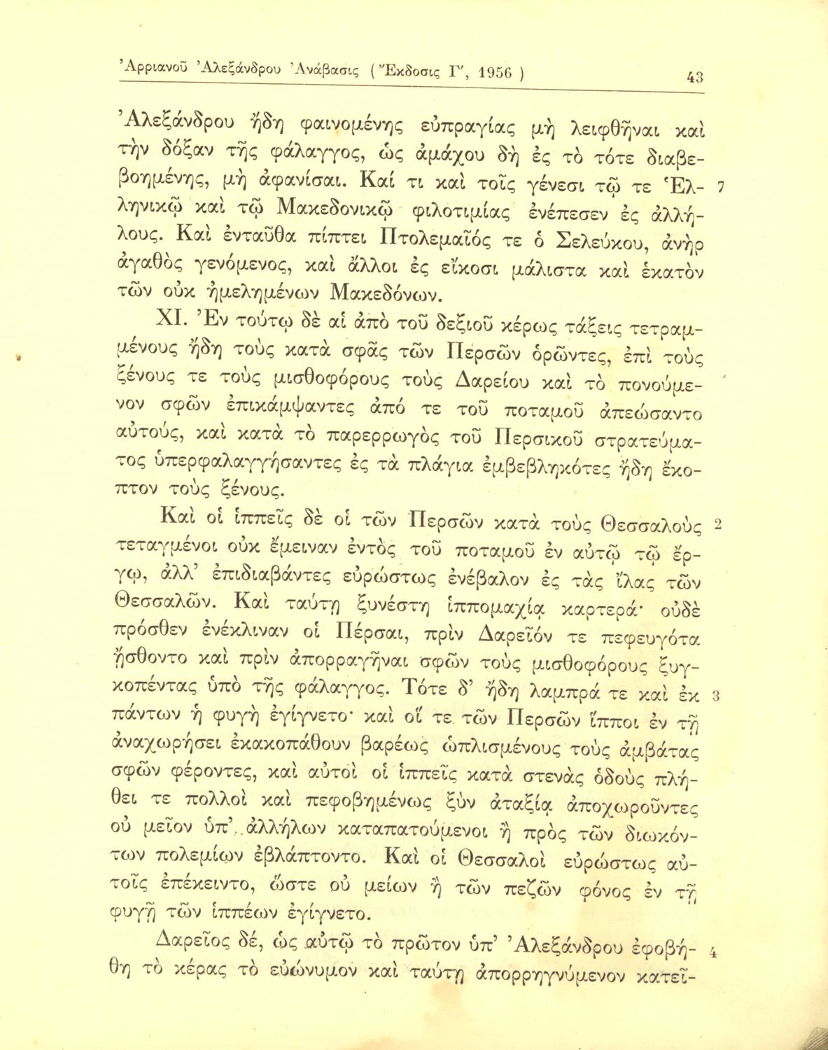 Σχολικό εγχειρίδιο Αρχαίων Ελληνικών που περιλαμβάνει αποσπάσματα από το έργο του Αρριανού Αλέξανδρου Ανάβασις και του Ηρόδοτου Ιστορίαι, ερμηνευτικές και λεξιλογικές παρατηρήσεις καθώς και τοπογραφικούς πίνακες και χάρτες..