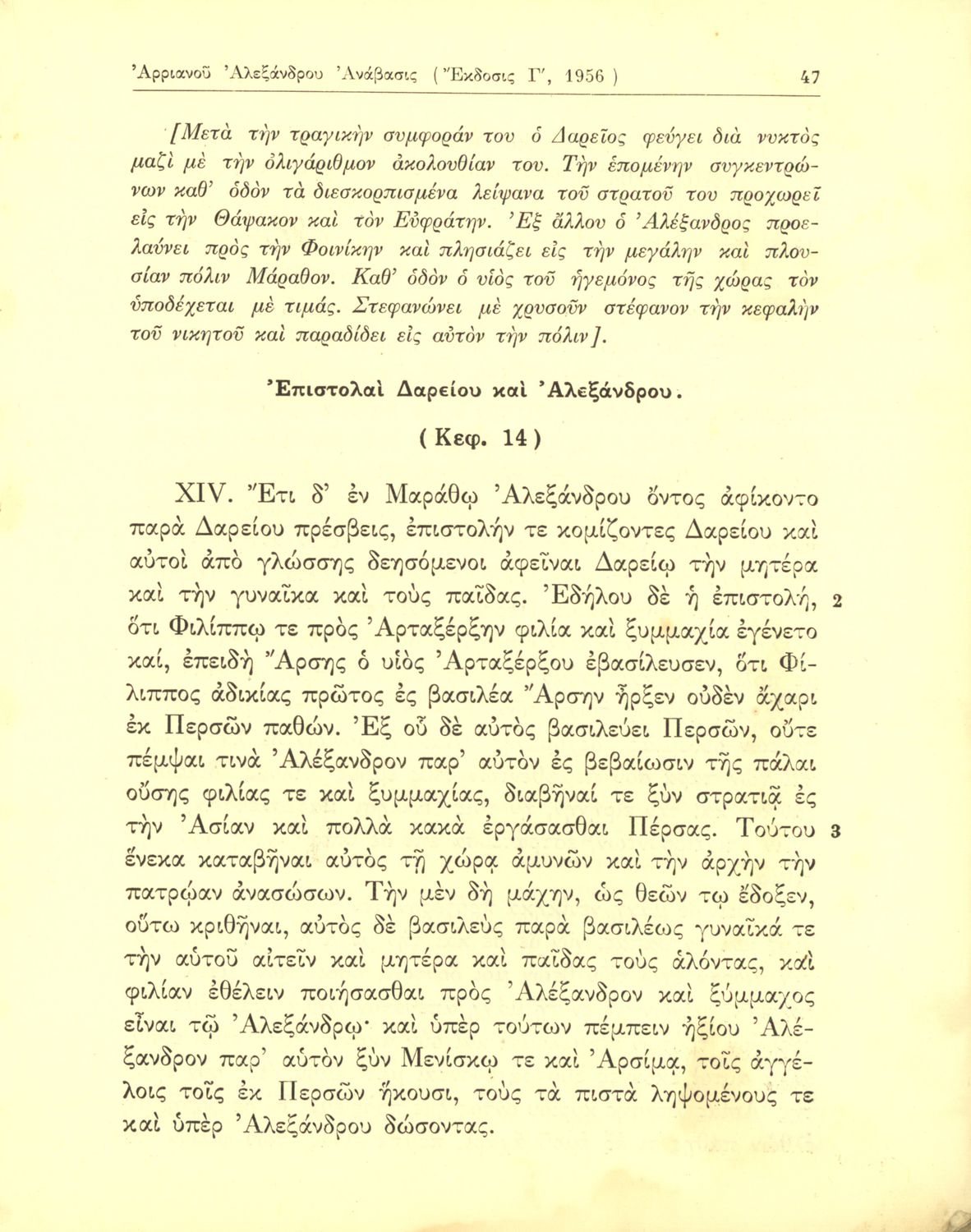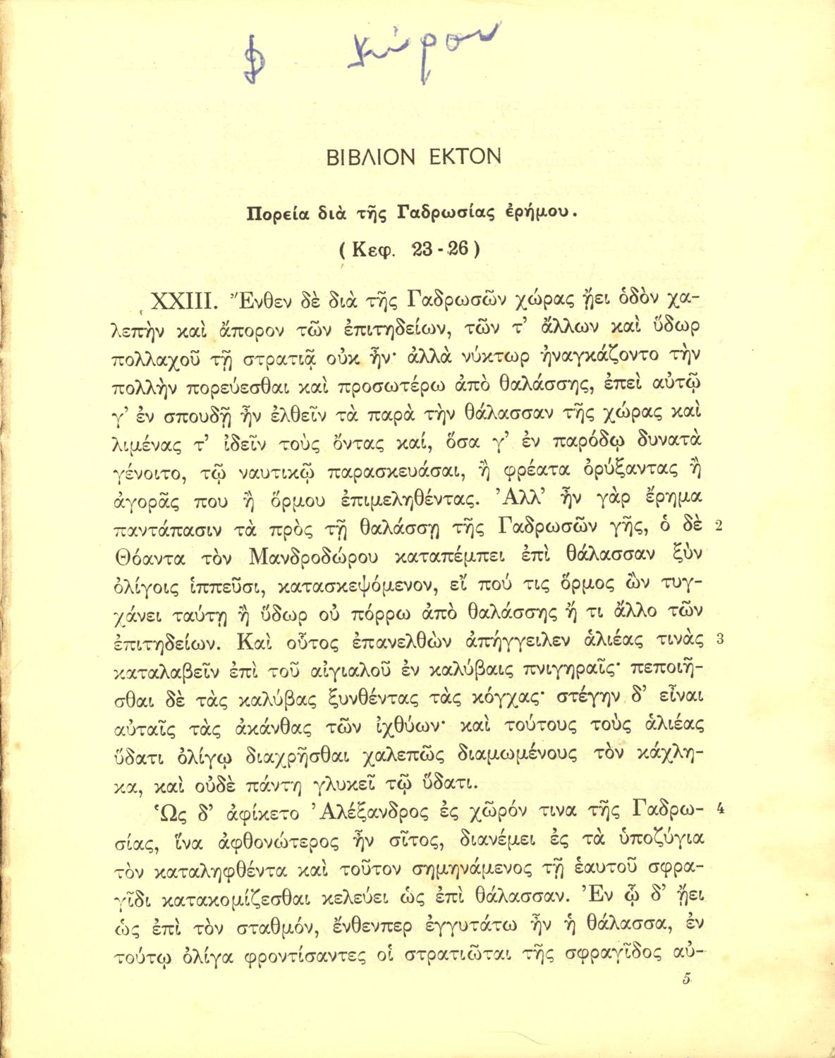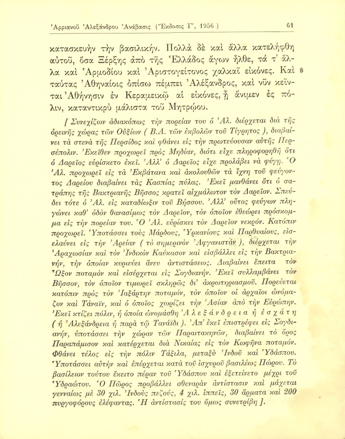 Σχολικό εγχειρίδιο Αρχαίων Ελληνικών που περιλαμβάνει αποσπάσματα από το έργο του Αρριανού Αλέξανδρου Ανάβασις και του Ηρόδοτου Ιστορίαι, ερμηνευτικές και λεξιλογικές παρατηρήσεις καθώς και τοπογραφικούς πίνακες και χάρτες..