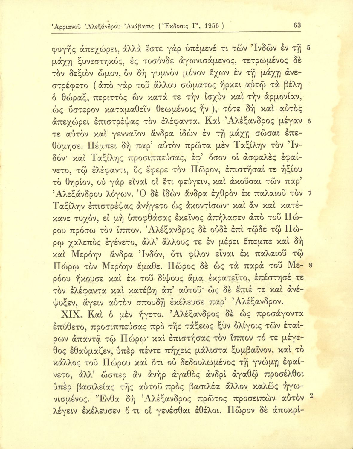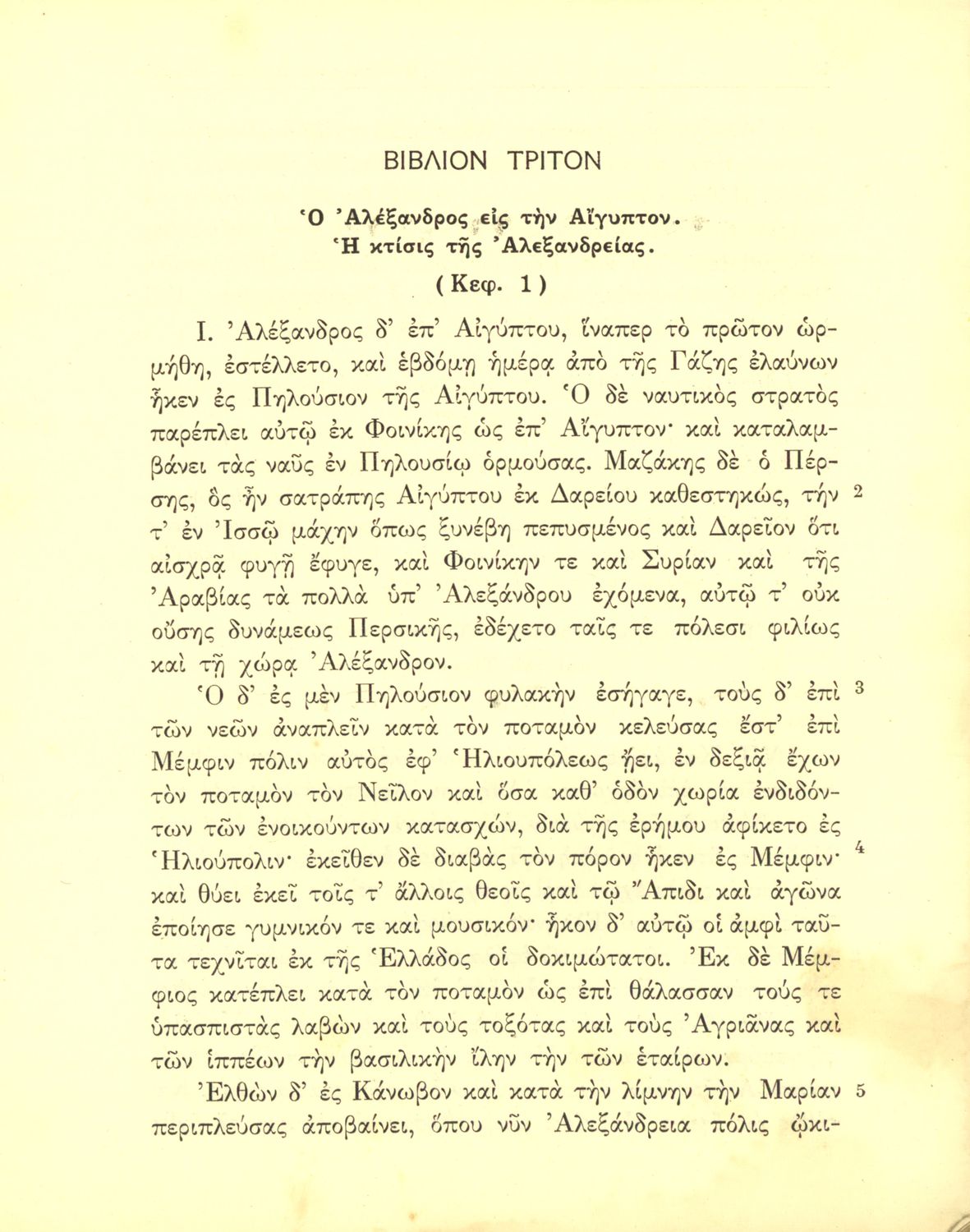 Σχολικό εγχειρίδιο Αρχαίων Ελληνικών Γ΄ Γυμνασίου που περιλαμβάνεται εισαγωγή σχετικά με την εποχή του Αρριανού, τη ζωή και το έργο του αποσπάσματα από το Αλεξάνδρου Ανάβασις, ερμηνευτικές σημειώσεις, εικόνες,