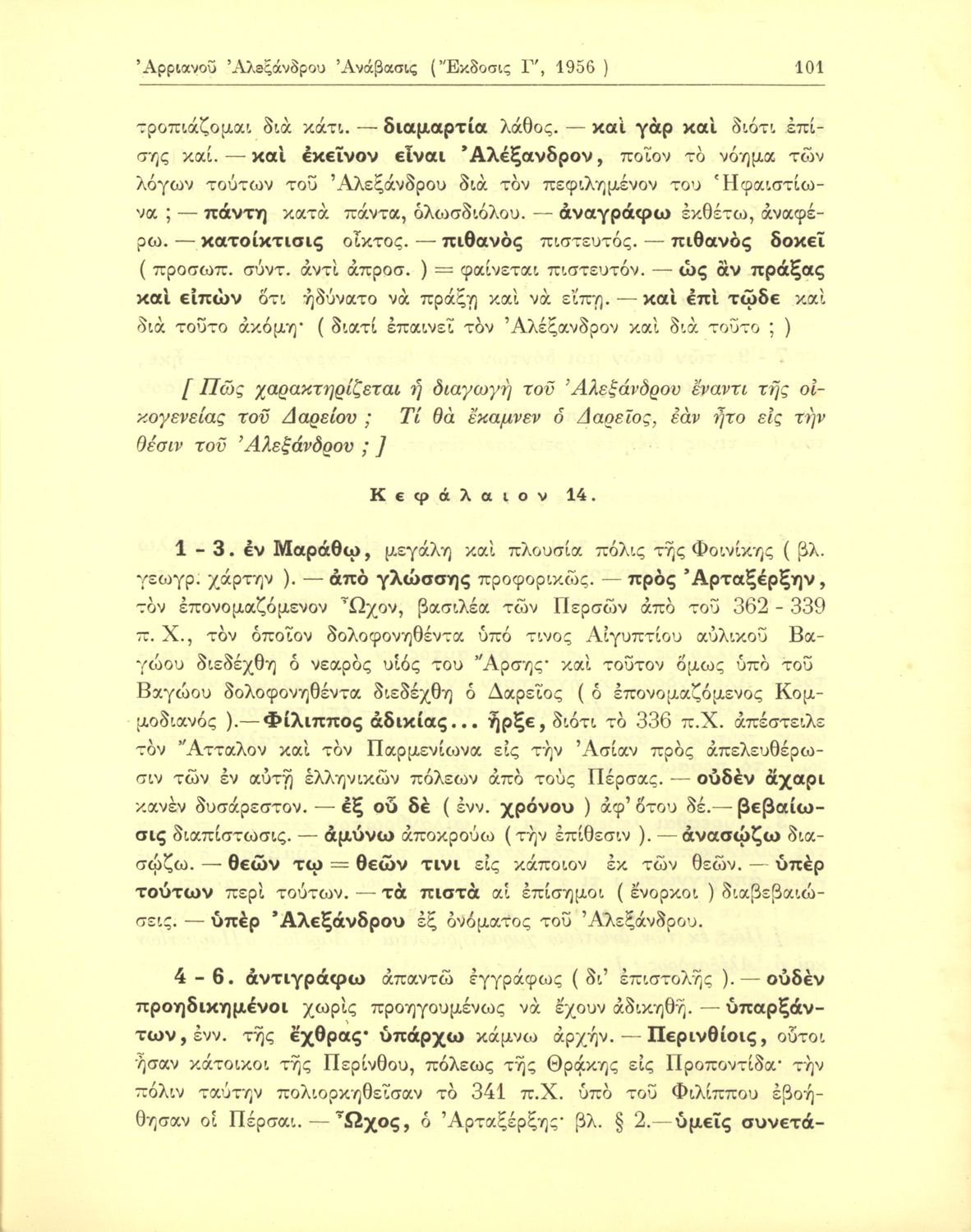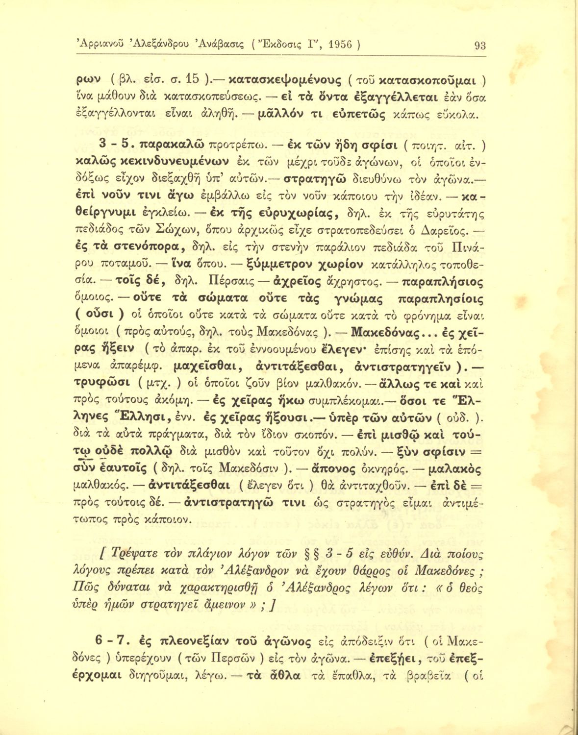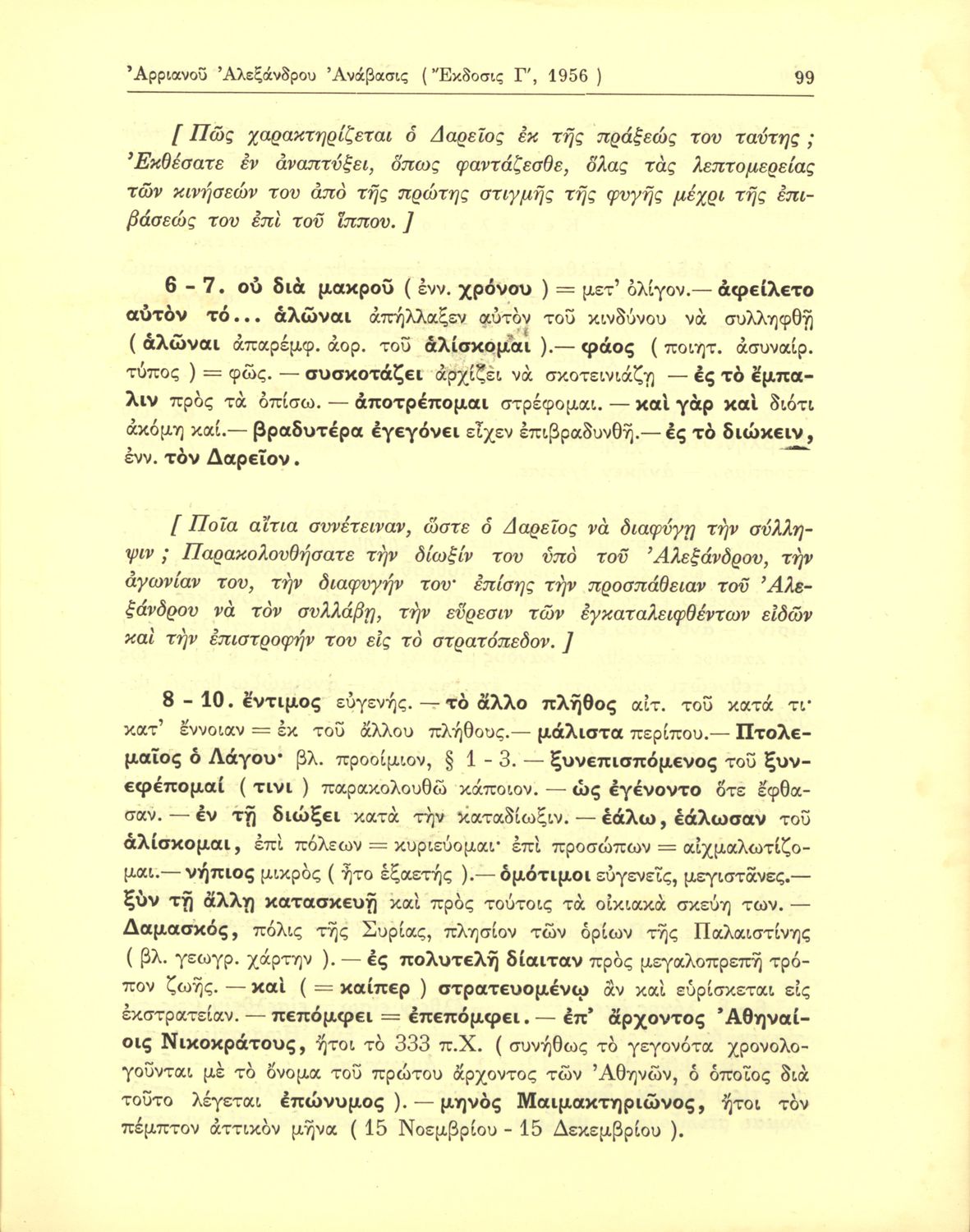 Σχολικό εγχειρίδιο Αρχαίων Ελληνικών που περιλαμβάνει αποσπάσματα από το έργο του Αρριανού Αλέξανδρου Ανάβασις και του Ηρόδοτου Ιστορίαι, ερμηνευτικές και λεξιλογικές παρατηρήσεις καθώς και τοπογραφικούς πίνακες και χάρτες..