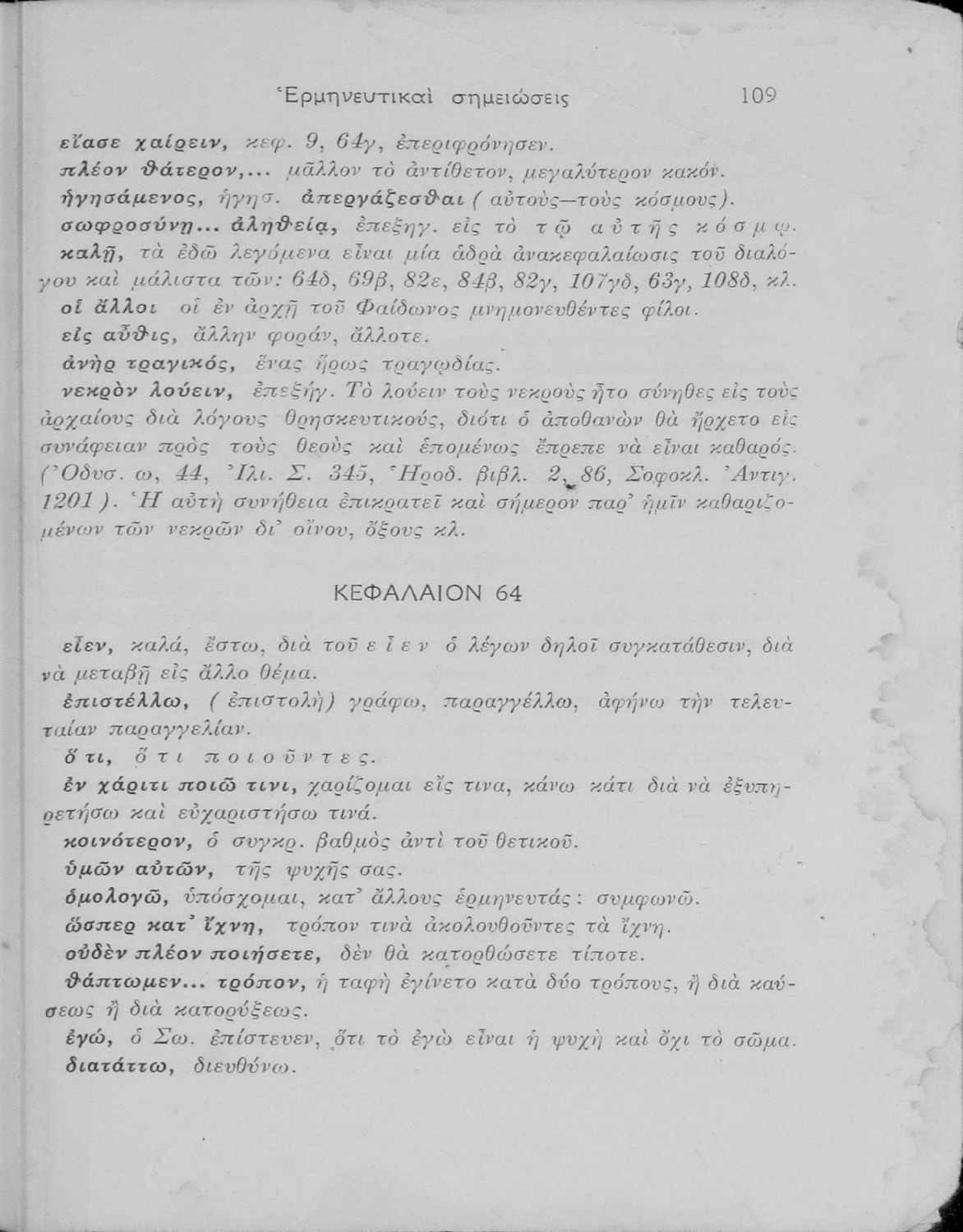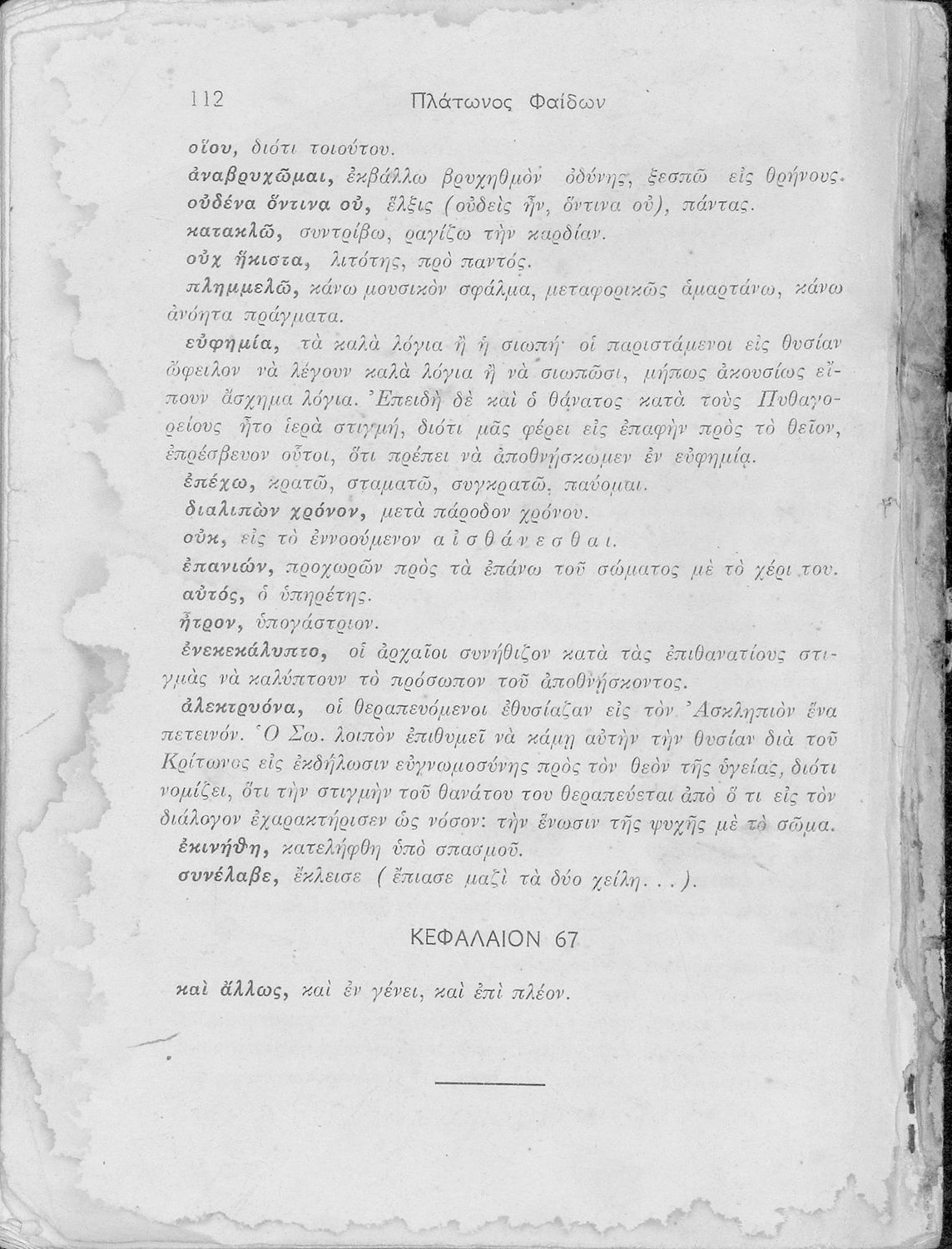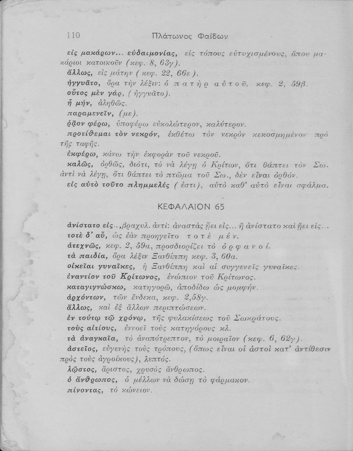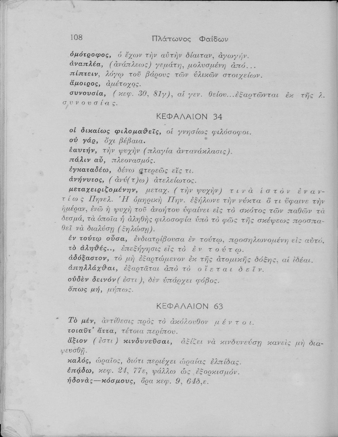 Σχολικό εγχειρίδιο Αρχαίων Ελληνικών. Το βιβλίο περιλαμβάνει εισαγωγικά στοιχεία σχετικά με το έργο και τη ζωή του Πλάτωνα και μία περίληψη που αφορά τα συγγράμματα του. Παραθέτεται αναλυτικά το κείμενο : Φαίδων. Η περί Ψυχής ηθικός, το οποίο περιλαμβάνει κεφάλαια από το 1 έως το 34. Ακολουθεί η περίληψη των κεφαλαίων 35 έως 63 και τελικά ολοκληρώνεται με τις ερμηνευτικές σημειώσεις.