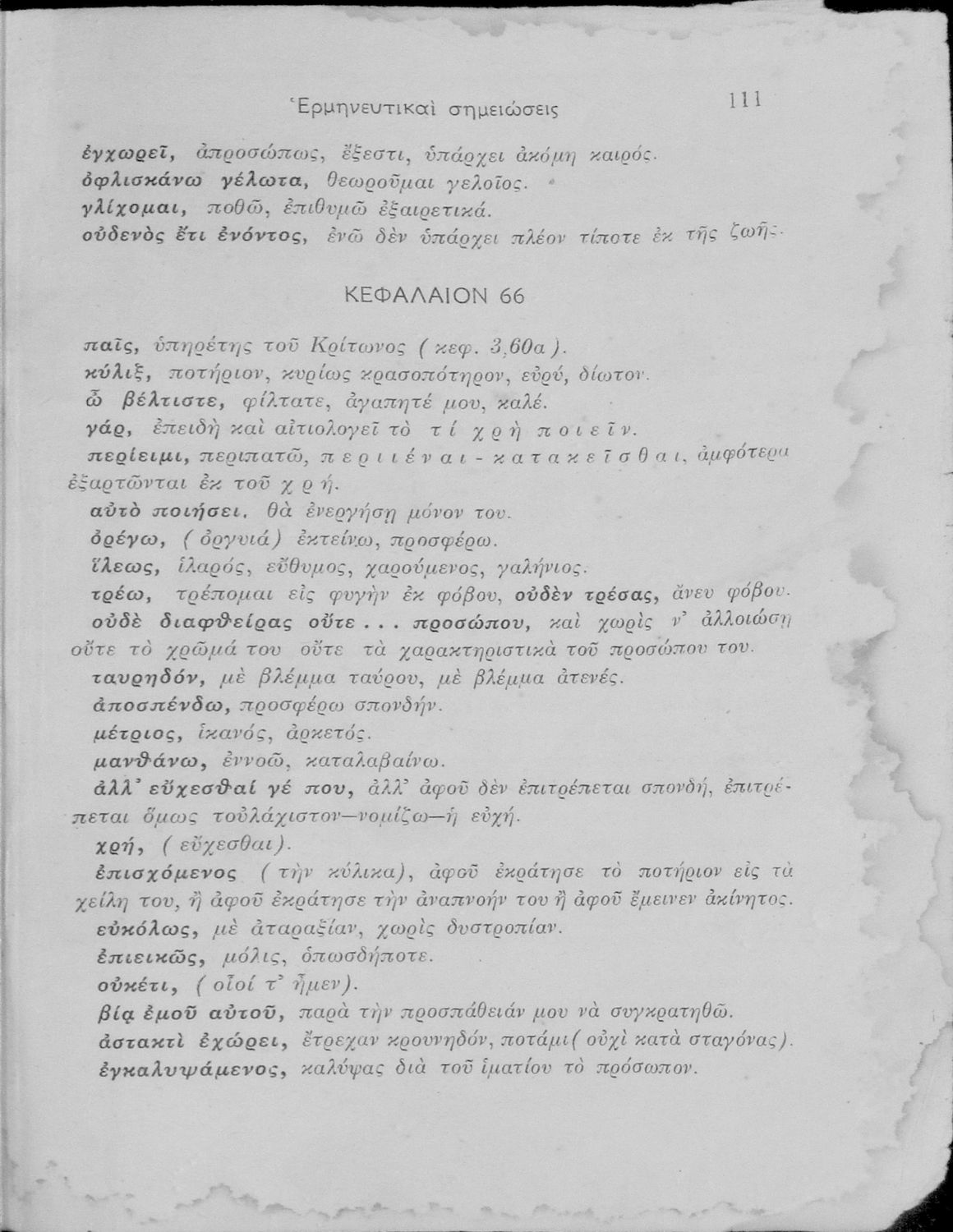 Βαθμίδα εκπαίδευσης: Δευτεροβάθμια Τάξη: ΣΤ' Γυμνασίου Μάθημα: Αρχαία Ελληνικά Γλώσσα: Καθαρεύουσα Παρουσίαση περιεχομένου: Σχολικό εγχειρίδιο Αρχαίων Ελληνικών. Το βιβλίο περιλαμβάνει εισαγωγικά στοιχεία σχετικά με το έργο και τη ζωή του Πλάτωνα και μία περίληψη που αφορά τα συγγράμματα του. Παραθέτεται αναλυτικά το κείμενο : Φαίδων. Η περί Ψυχής ηθικός, το οποίο περιλαμβάνει κεφάλαια από το 1 έως το 34. Ακολουθεί η περίληψη των κεφαλαίων 35 έως 63 και τελικά ολοκληρώνεται με τις ερμηνευτικές σημειώσεις. |
