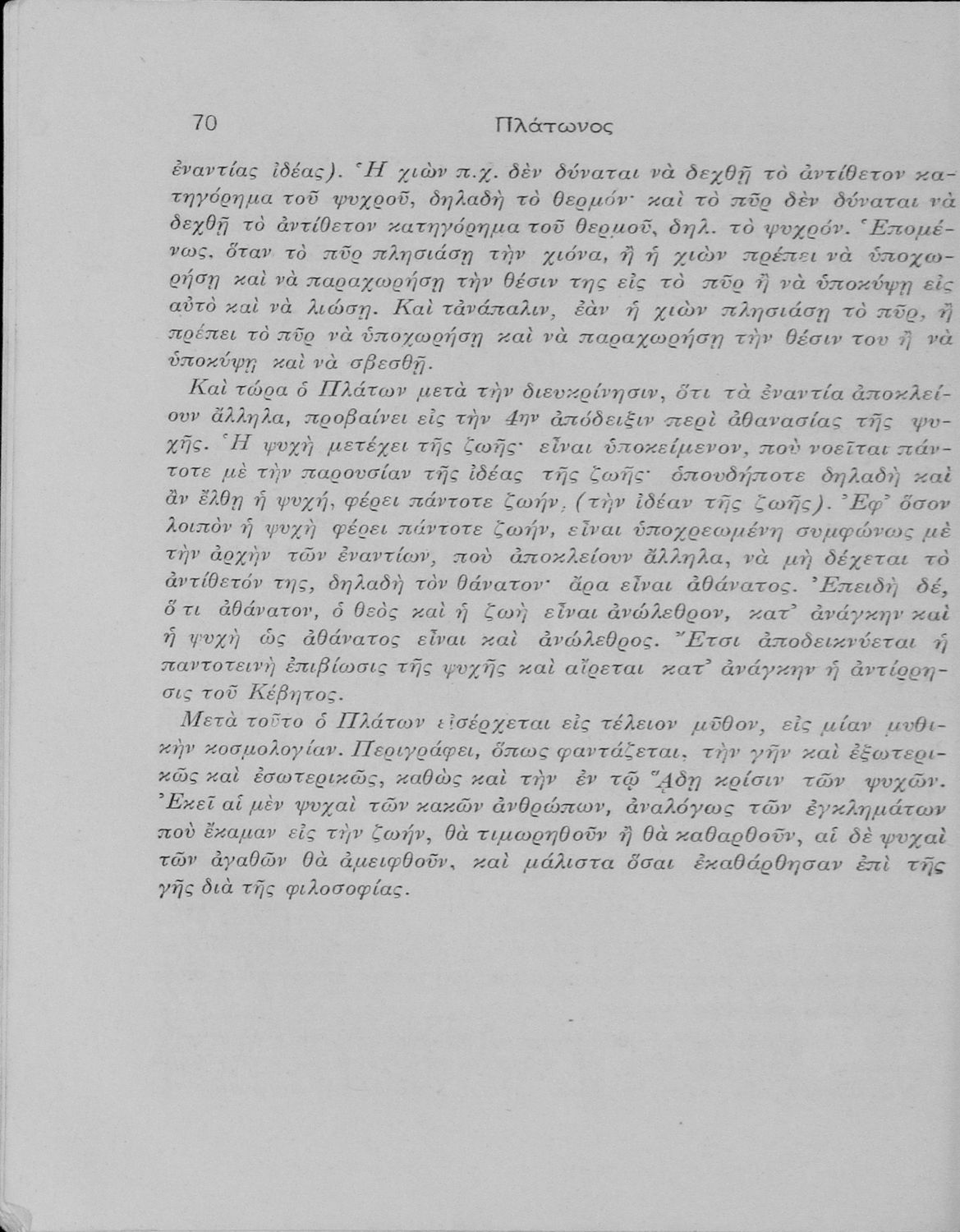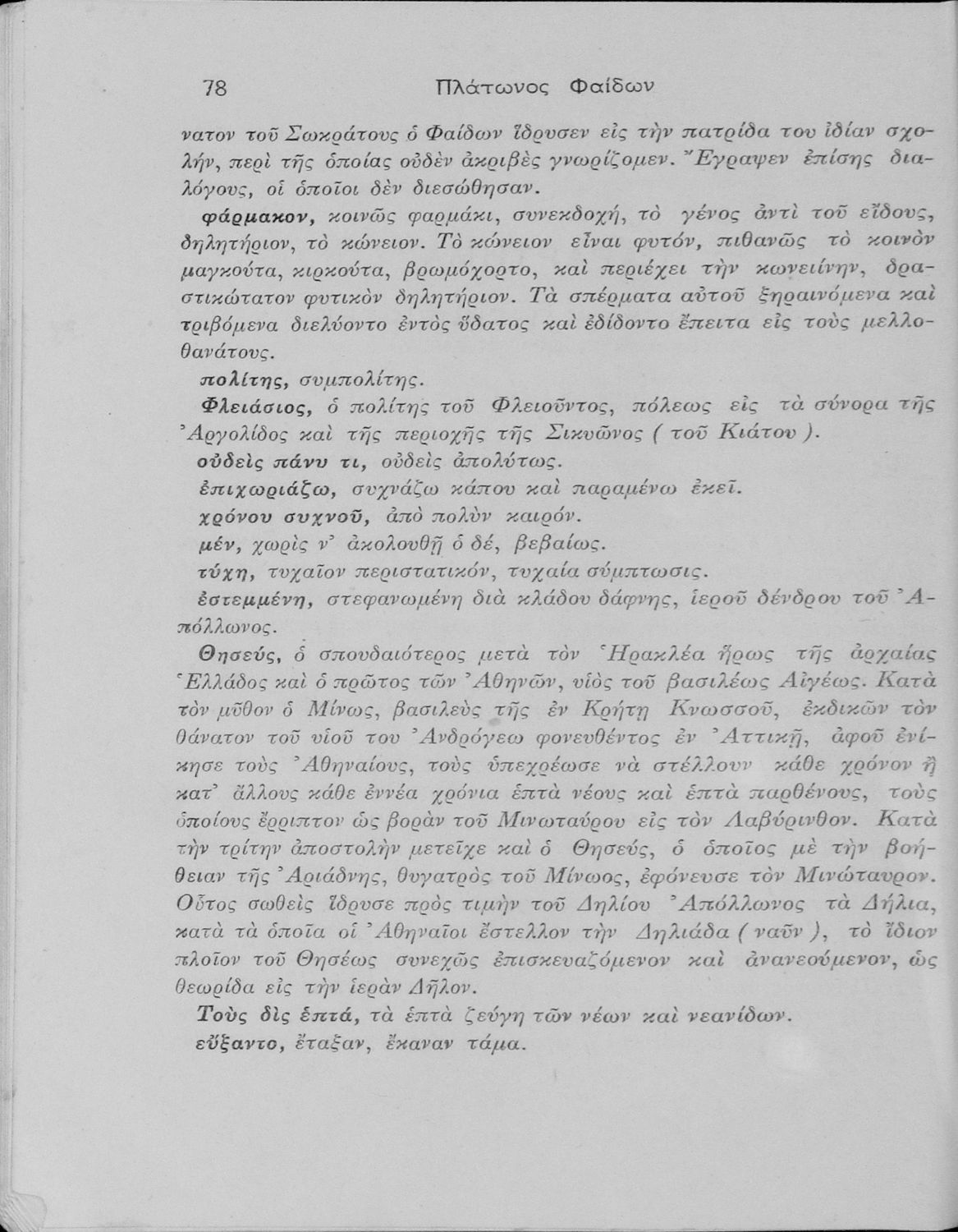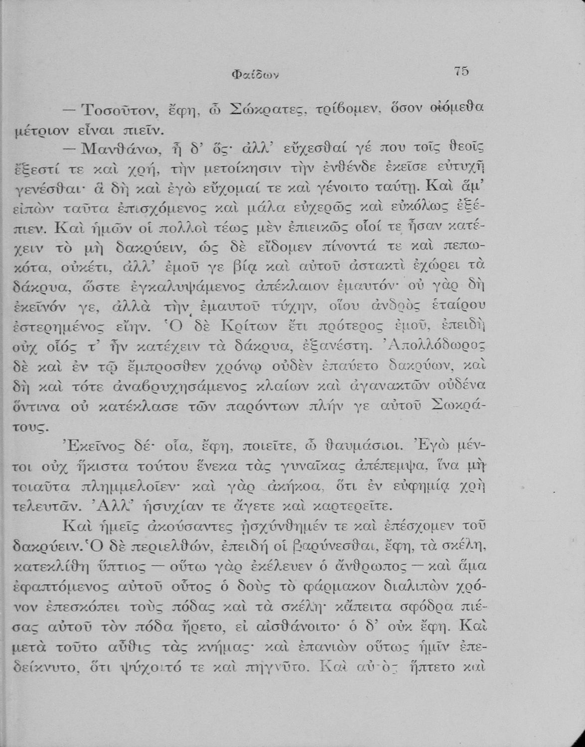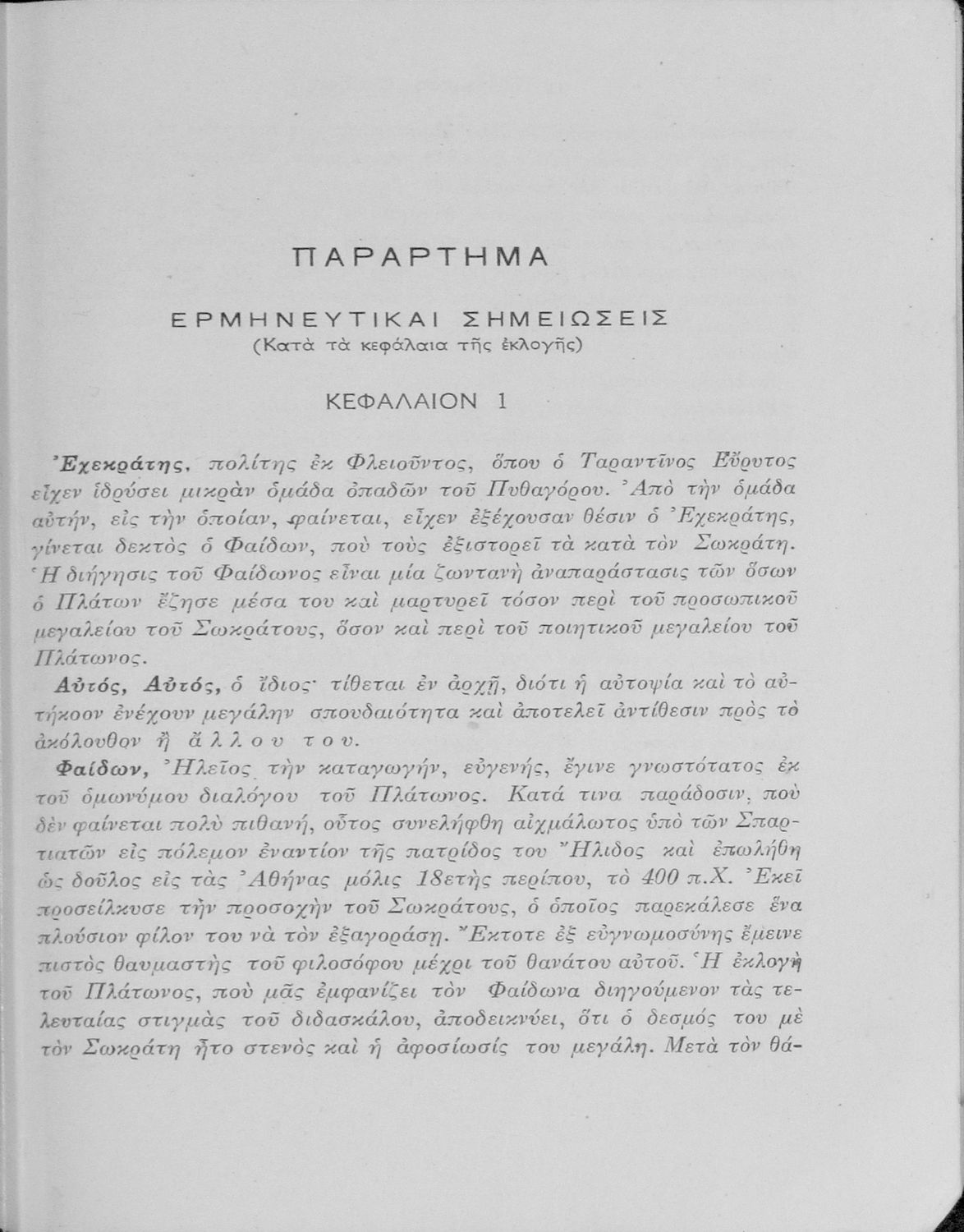 Σχολικό εγχειρίδιο Αρχαίων Ελληνικών. Το βιβλίο περιλαμβάνει εισαγωγικά στοιχεία σχετικά με το έργο και τη ζωή του Πλάτωνα και μία περίληψη που αφορά τα συγγράμματα του. Παραθέτεται αναλυτικά το κείμενο : Φαίδων. Η περί Ψυχής ηθικός, το οποίο περιλαμβάνει κεφάλαια από το 1 έως το 34. Ακολουθεί η περίληψη των κεφαλαίων 35 έως 63 και τελικά ολοκληρώνεται με τις ερμηνευτικές σημειώσεις.