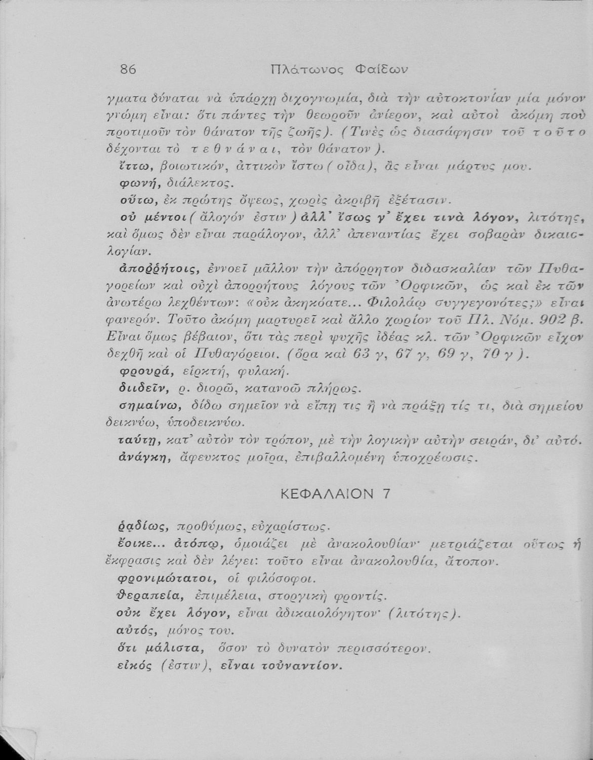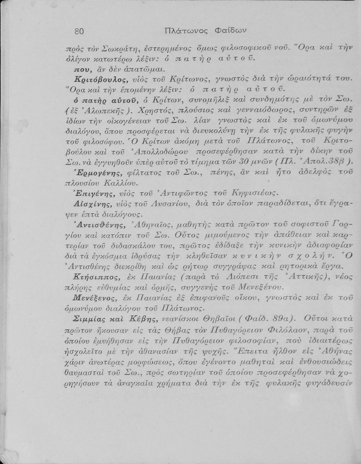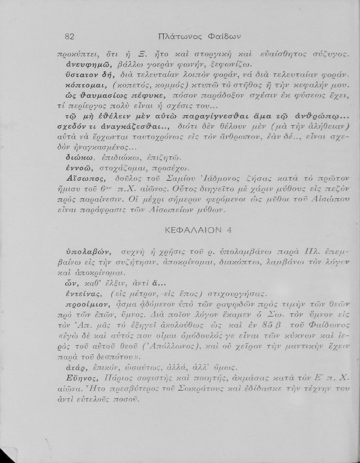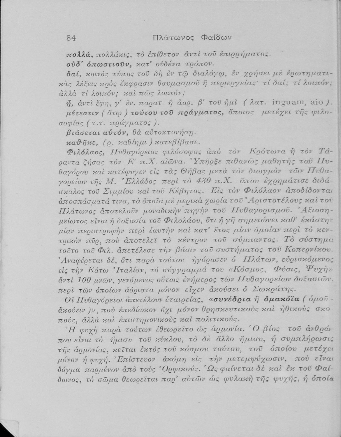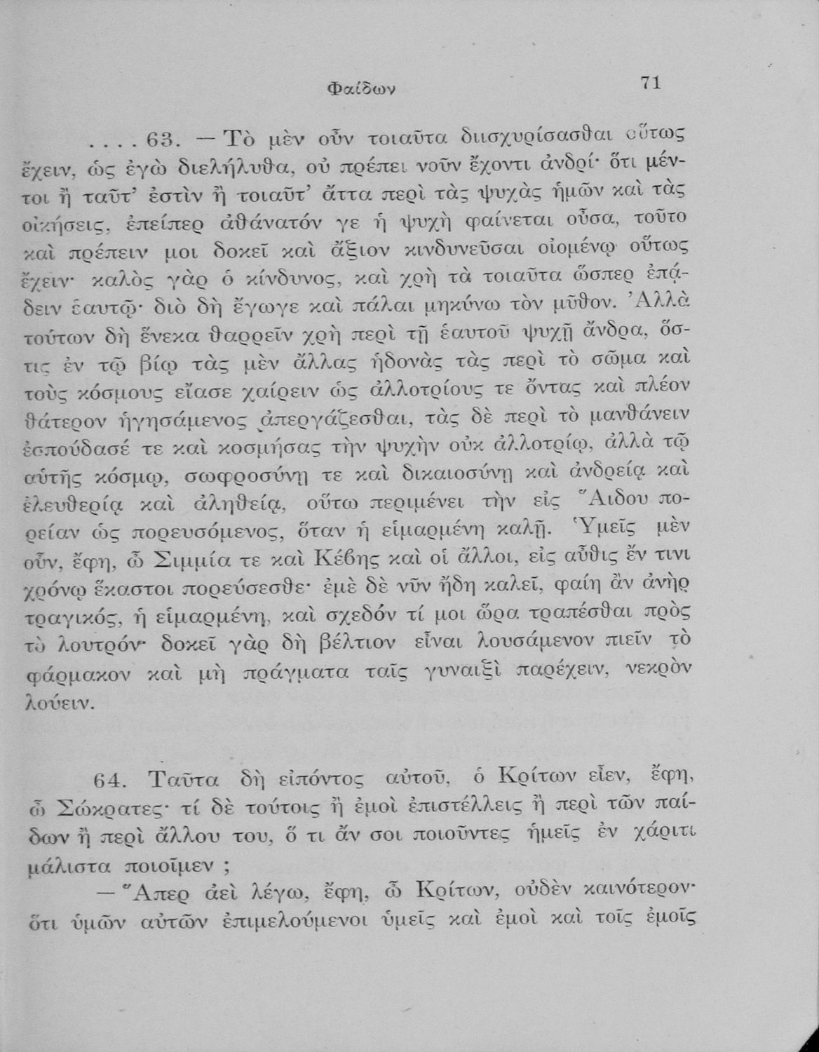 Σχολικό εγχειρίδιο Αρχαίων Ελληνικών. Το βιβλίο περιλαμβάνει εισαγωγικά στοιχεία σχετικά με το έργο και τη ζωή του Πλάτωνα και μία περίληψη που αφορά τα συγγράμματα του. Παραθέτεται αναλυτικά το κείμενο : Φαίδων. Η περί Ψυχής ηθικός, το οποίο περιλαμβάνει κεφάλαια από το 1 έως το 34. Ακολουθεί η περίληψη των κεφαλαίων 35 έως 63 και τελικά ολοκληρώνεται με τις ερμηνευτικές σημειώσεις.