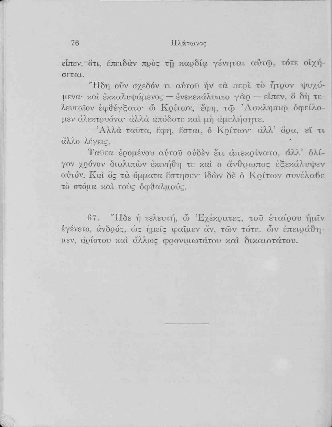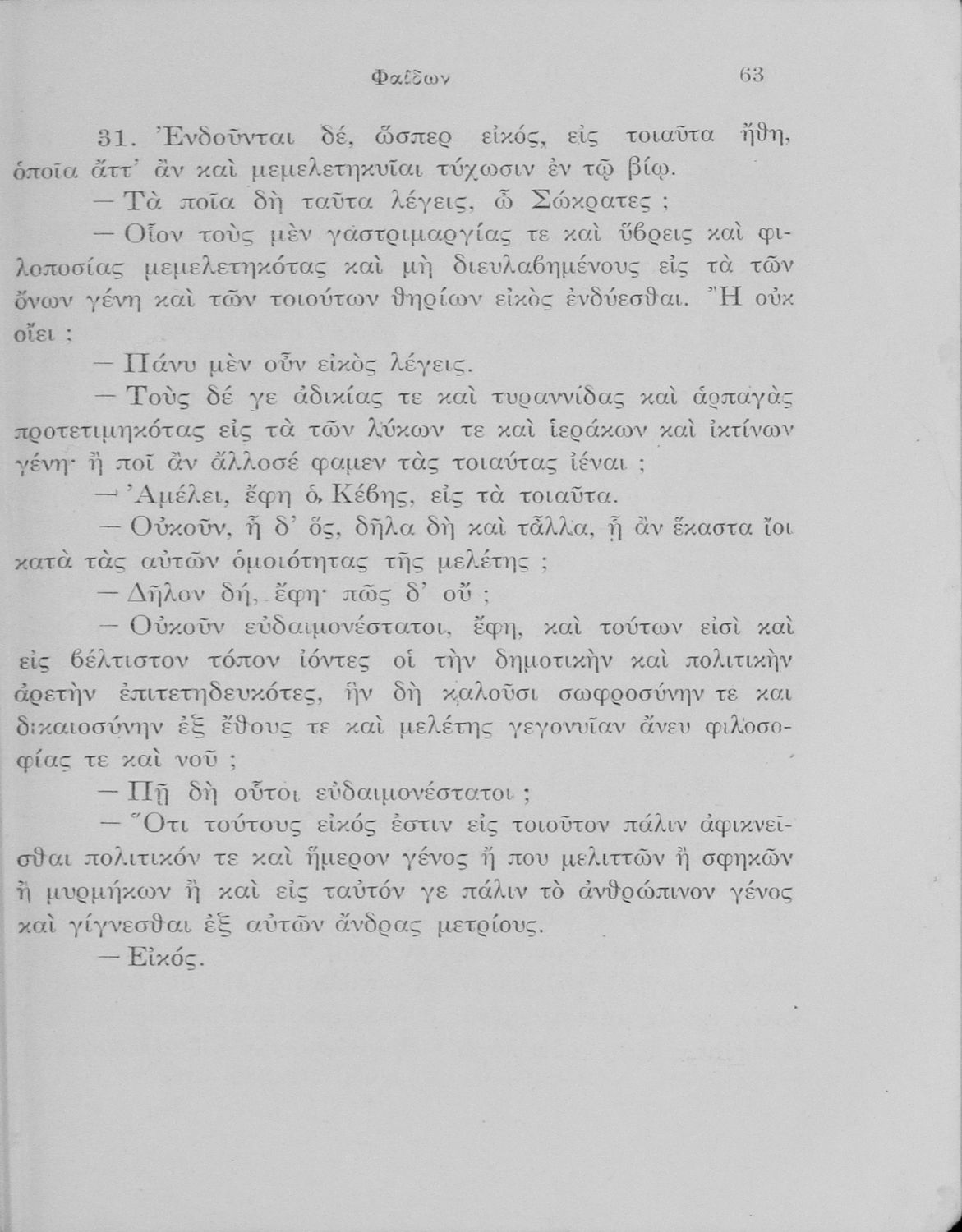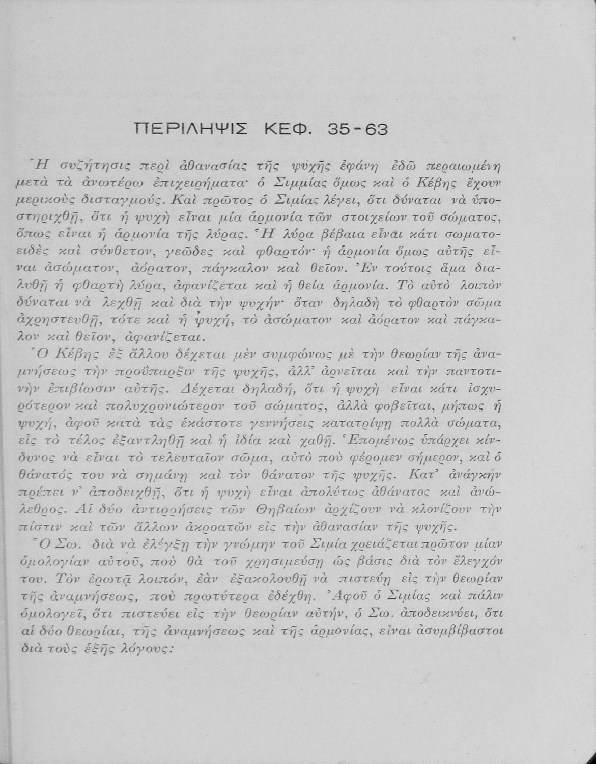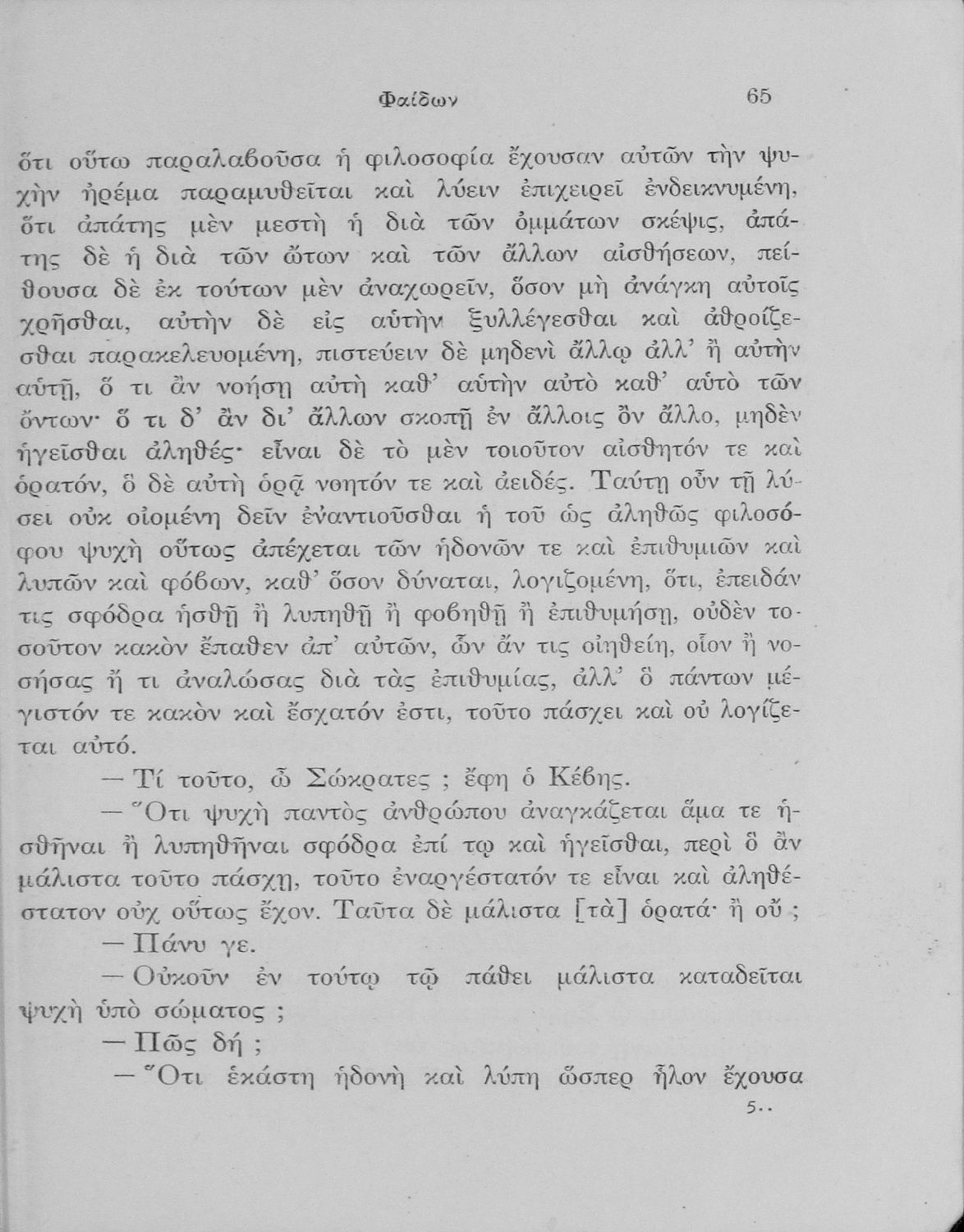Σχολικό εγχειρίδιο Αρχαίων Ελληνικών. Το βιβλίο περιλαμβάνει εισαγωγικά στοιχεία σχετικά με το έργο και τη ζωή του Πλάτωνα και μία περίληψη που αφορά τα συγγράμματα του. Παραθέτεται αναλυτικά το κείμενο : Φαίδων. Η περί Ψυχής ηθικός, το οποίο περιλαμβάνει κεφάλαια από το 1 έως το 34. Ακολουθεί η περίληψη των κεφαλαίων 35 έως 63 και τελικά ολοκληρώνεται με τις ερμηνευτικές σημειώσεις.