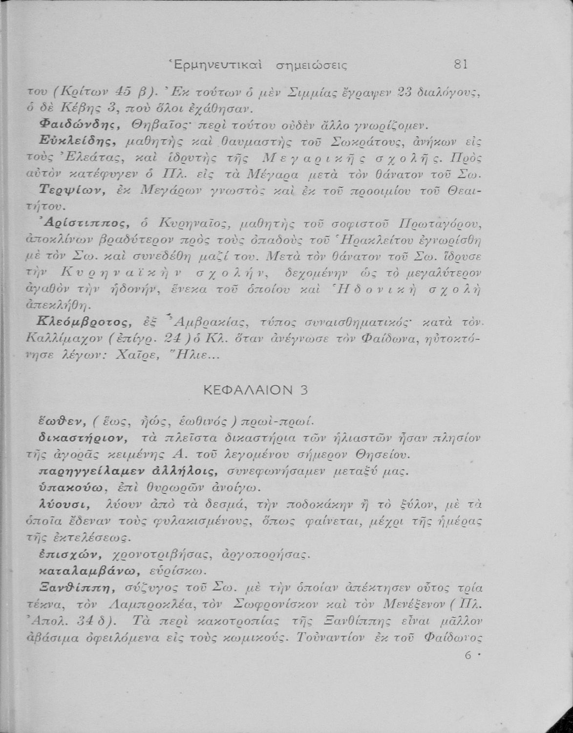 Βαθμίδα εκπαίδευσης: Δευτεροβάθμια Τάξη: ΣΤ' Γυμνασίου Μάθημα: Αρχαία Ελληνικά Γλώσσα: Καθαρεύουσα Παρουσίαση περιεχομένου: Σχολικό εγχειρίδιο Αρχαίων Ελληνικών. Το βιβλίο περιλαμβάνει εισαγωγικά στοιχεία σχετικά με το έργο και τη ζωή του Πλάτωνα και μία περίληψη που αφορά τα συγγράμματα του. Παραθέτεται αναλυτικά το κείμενο : Φαίδων. Η περί Ψυχής ηθικός, το οποίο περιλαμβάνει κεφάλαια από το 1 έως το 34. Ακολουθεί η περίληψη των κεφαλαίων 35 έως 63 και τελικά ολοκληρώνεται με τις ερμηνευτικές σημειώσεις. |