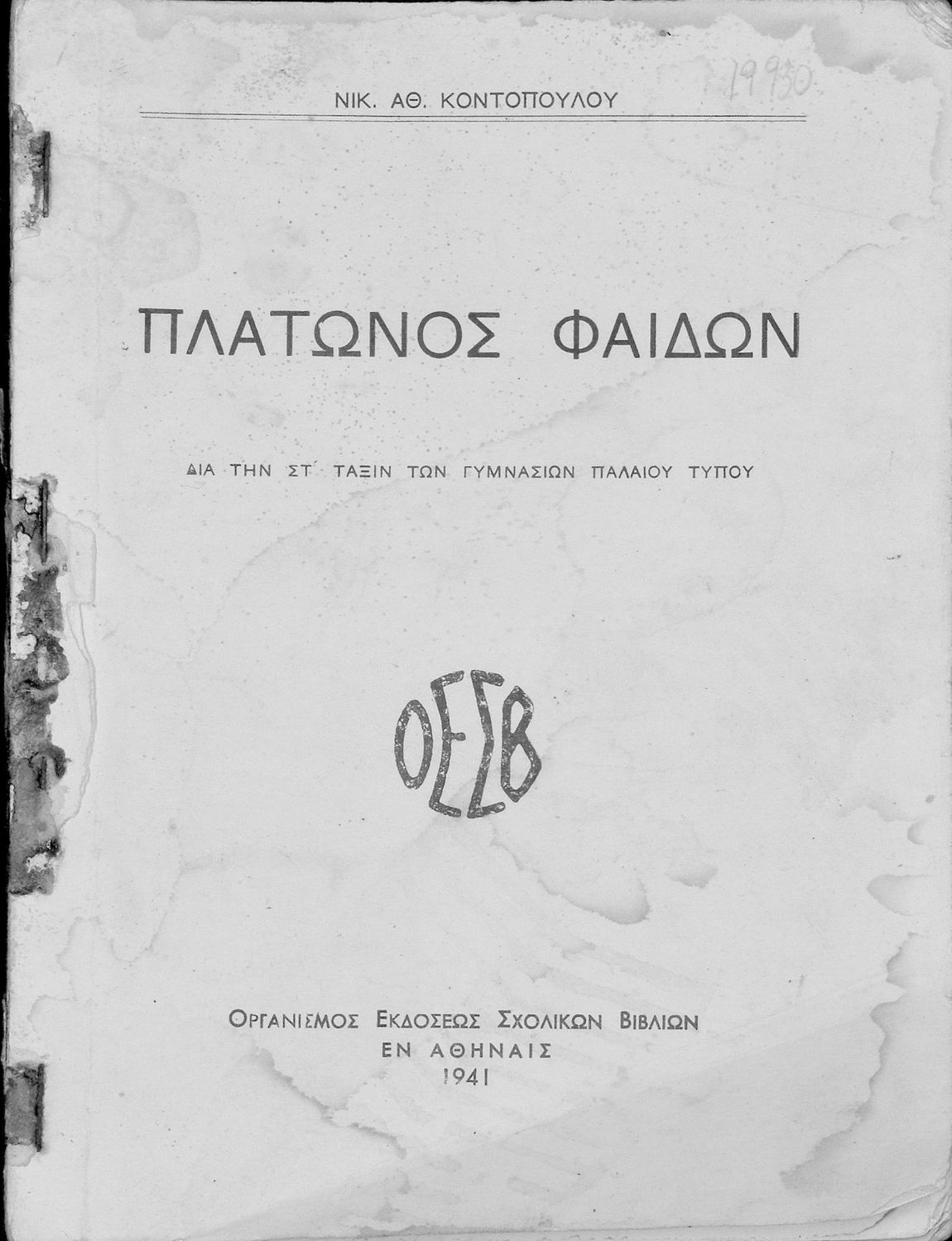 Σχολικό εγχειρίδιο Αρχαίων Ελληνικών. Το βιβλίο περιλαμβάνει εισαγωγικά στοιχεία σχετικά με το έργο και τη ζωή του Πλάτωνα και μία περίληψη που αφορά τα συγγράμματα του. Παραθέτεται αναλυτικά το κείμενο : Φαίδων. Η περί Ψυχής ηθικός, το οποίο περιλαμβάνει κεφάλαια από το 1 έως το 34. Ακολουθεί η περίληψη των κεφαλαίων 35 έως 63 και τελικά ολοκληρώνεται με τις ερμηνευτικές σημειώσεις.
