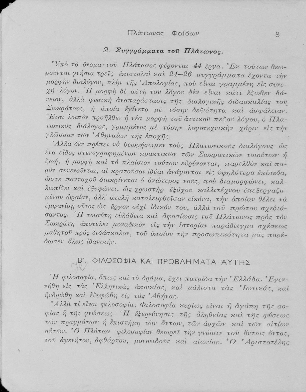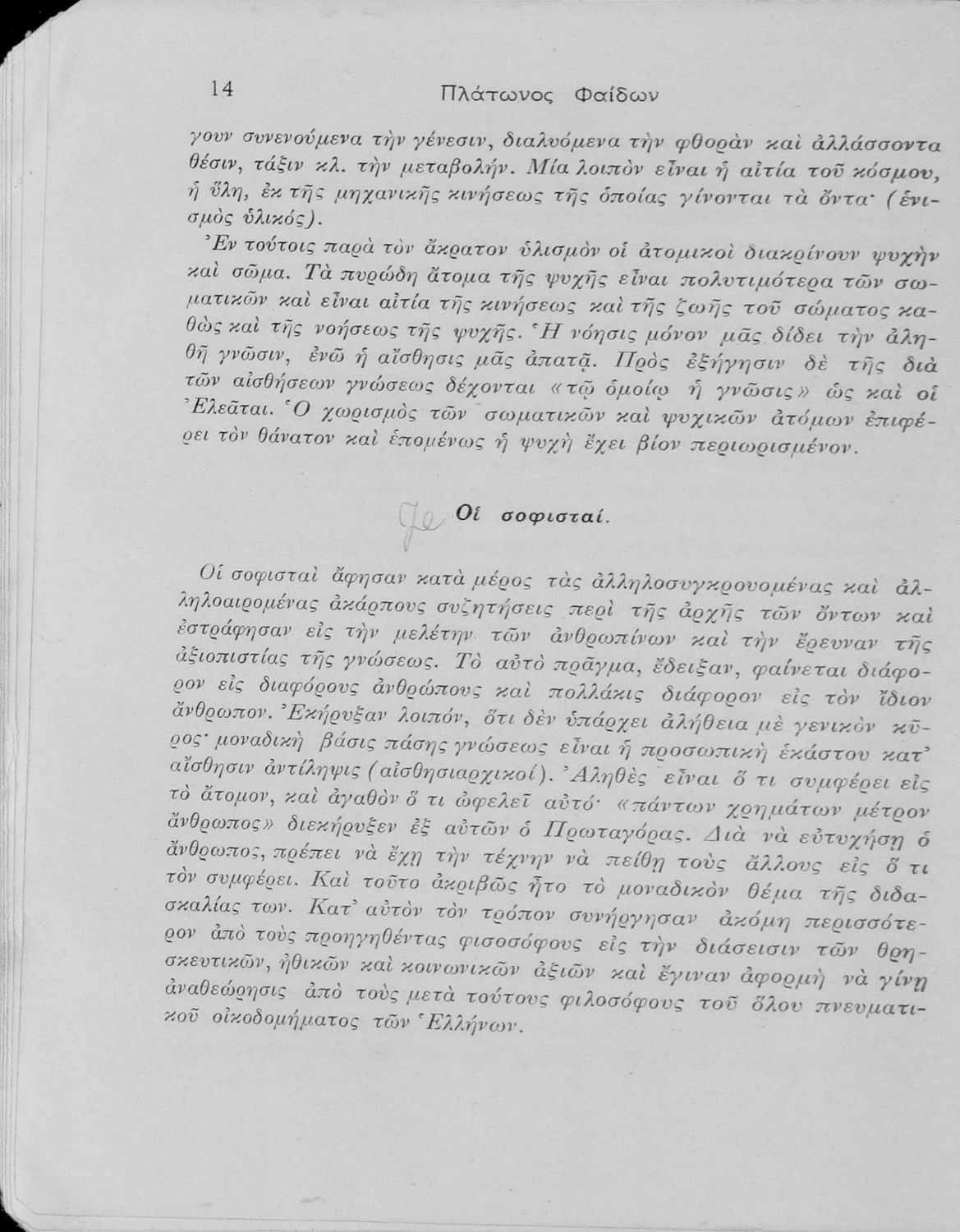 Σχολικό εγχειρίδιο Αρχαίων Ελληνικών. Το βιβλίο περιλαμβάνει εισαγωγή σχετικά με τη ζωή και το έργο του Πλάτωνα και αναφέρεται σε φιλοσόφους της εποχής. Παραθέτεται το κείμενο "Φαίδων : Η περί ψυχής ηθικός" το
