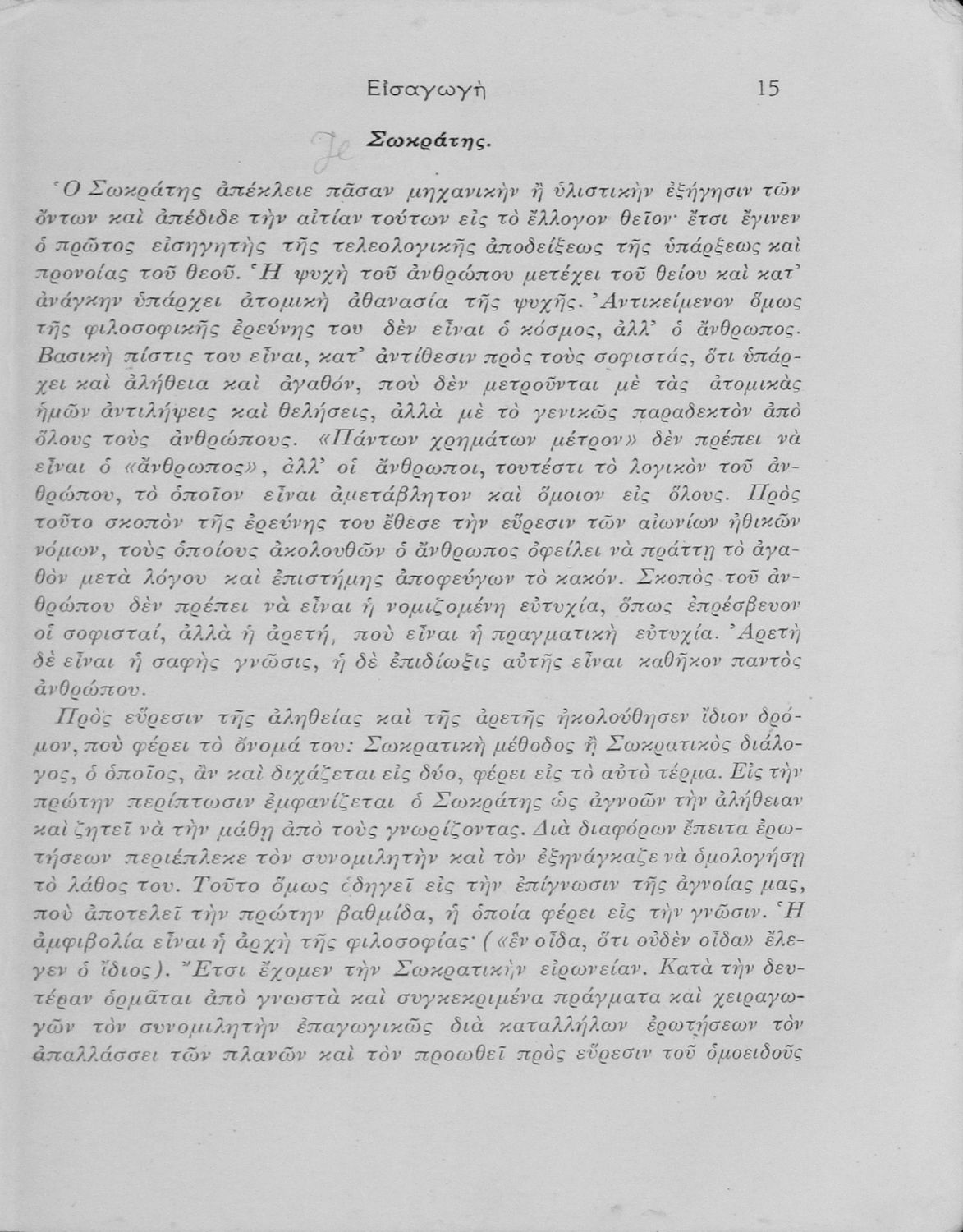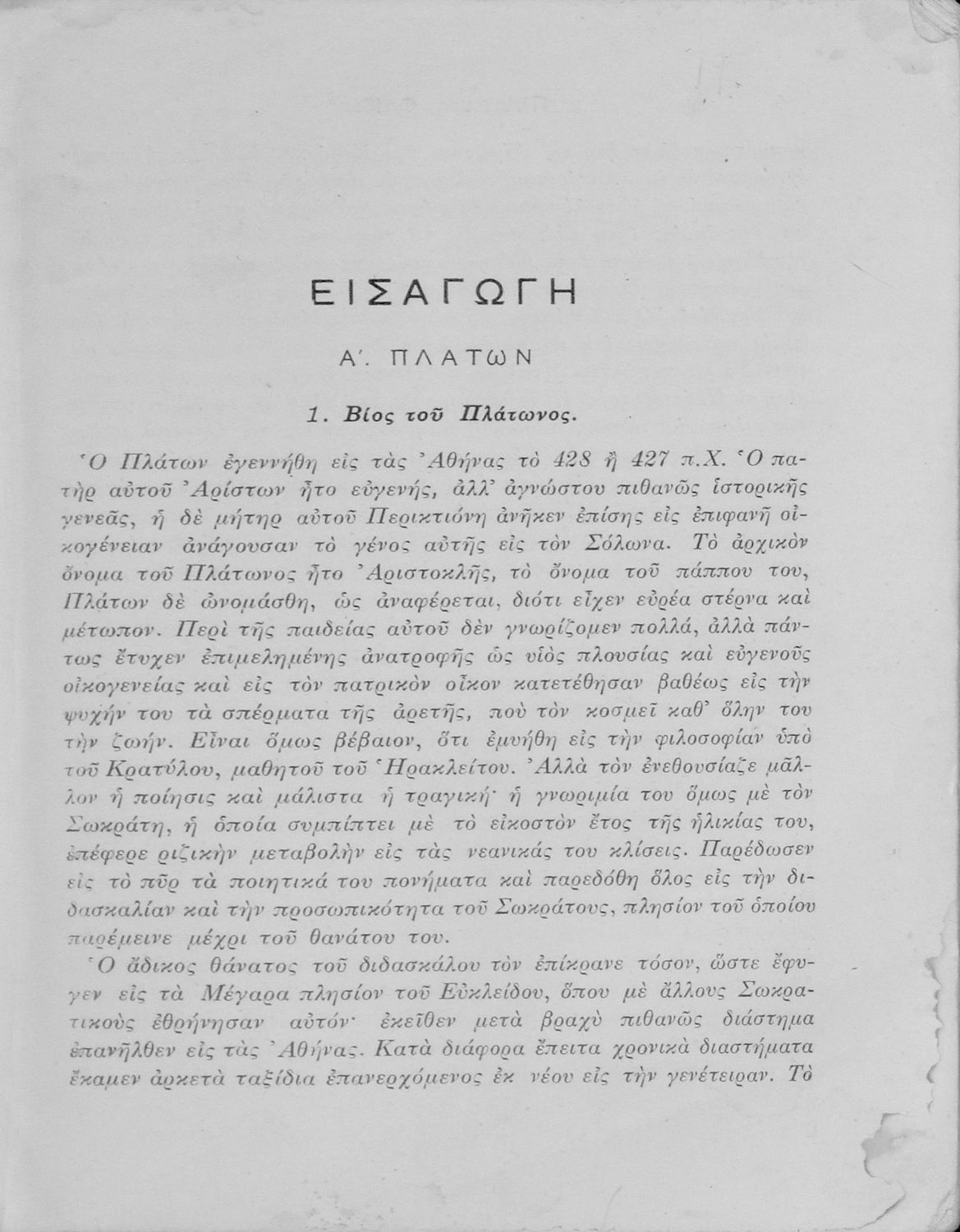 Σχολικό εγχειρίδιο Αρχαίων Ελληνικών για τη ΣΤ΄ τάξη των Εξαταξίων Γυμνασίων που περιλαμβάνει σύντομο βιογραφικό του Πλάτωνα, εισαγωγή στην προσωκρατική φιλοσοφία και στην φιλοσοφία του Πλάτωνα, αποσπάσματα ...