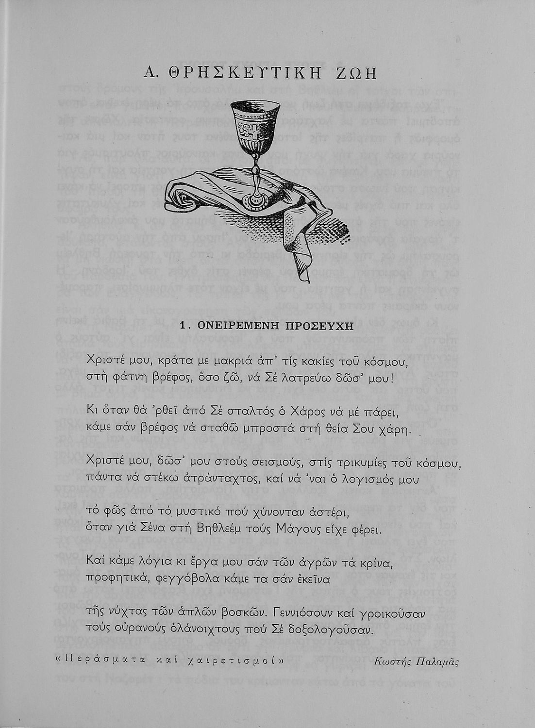 Σχολικό εγχειρίδιο Νέων Ελληνικών Γ΄ Γυμνασίου και Α' Αστικού Σχολείου που περιέχει πεζά και ποιήματα Ελλήνων συγγραφέων εμπνευσμένα από τη θρησκευτική και κοινωνική ζωή, την ελληνική μυθολογία, την αρχαία και