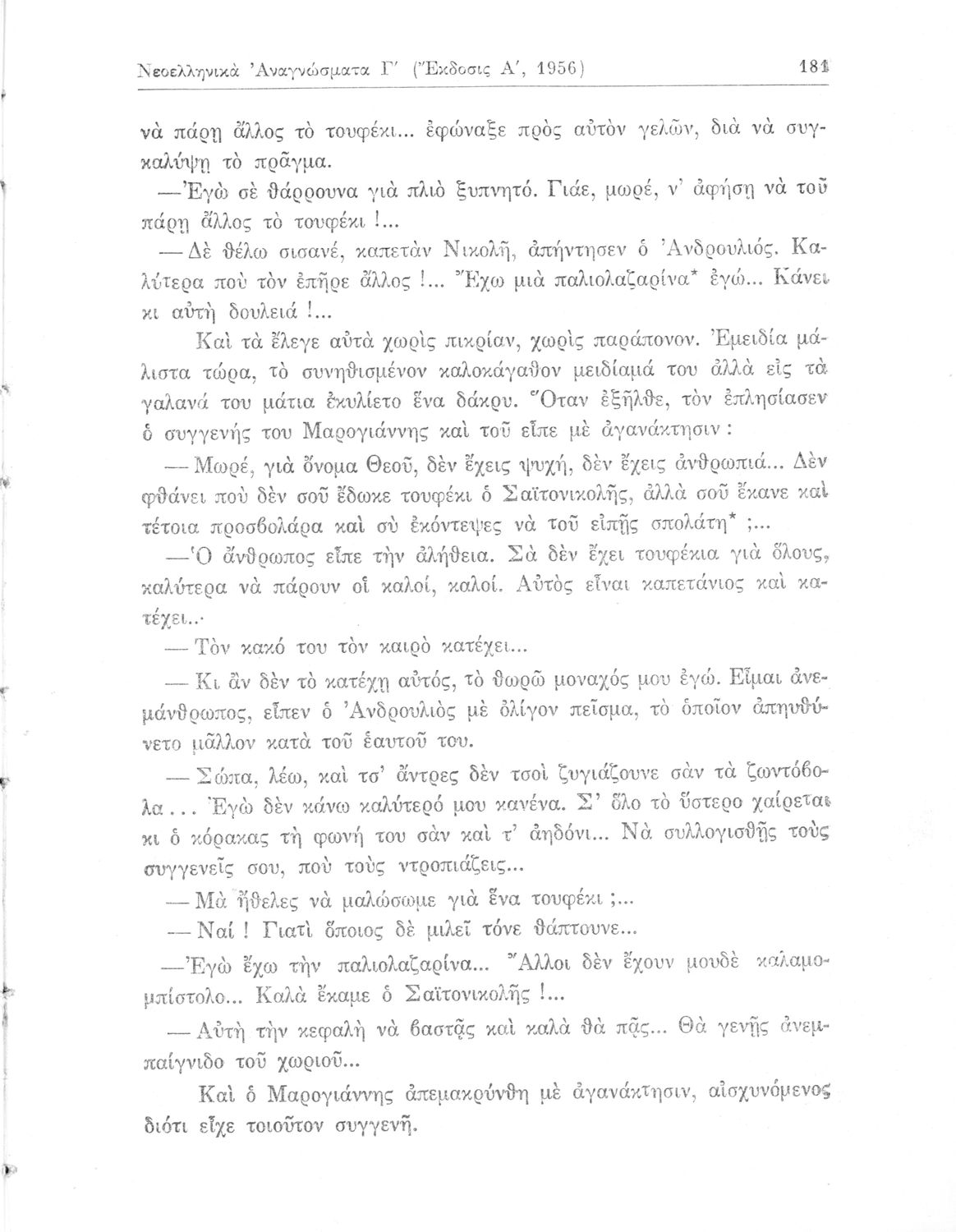 Βαθμίδα εκπαίδευσης: Δευτεροβάθμια Τάξη: Γ' Γυμνασίου Μάθημα: Νέα Ελληνικά Γλώσσα: Δημοτική Παρουσίαση περιεχομένου: Σχολικό εγχειρίδιο Νέων Ελληνικών Γ΄ Γυμνασίου που περιέχει ποιήματα και πεζά Ελλήνων συγγραφέων εμπνευσμένα από τη θρησκευτική, οικογενειακή και κοινωνική ζωή, την σύγχρονή ελληνική ιστορία και την ελληνική φύση. Περιέχει παράρτημα με βιογραφίες των συγγραφέων και λεξιλόγιο. |