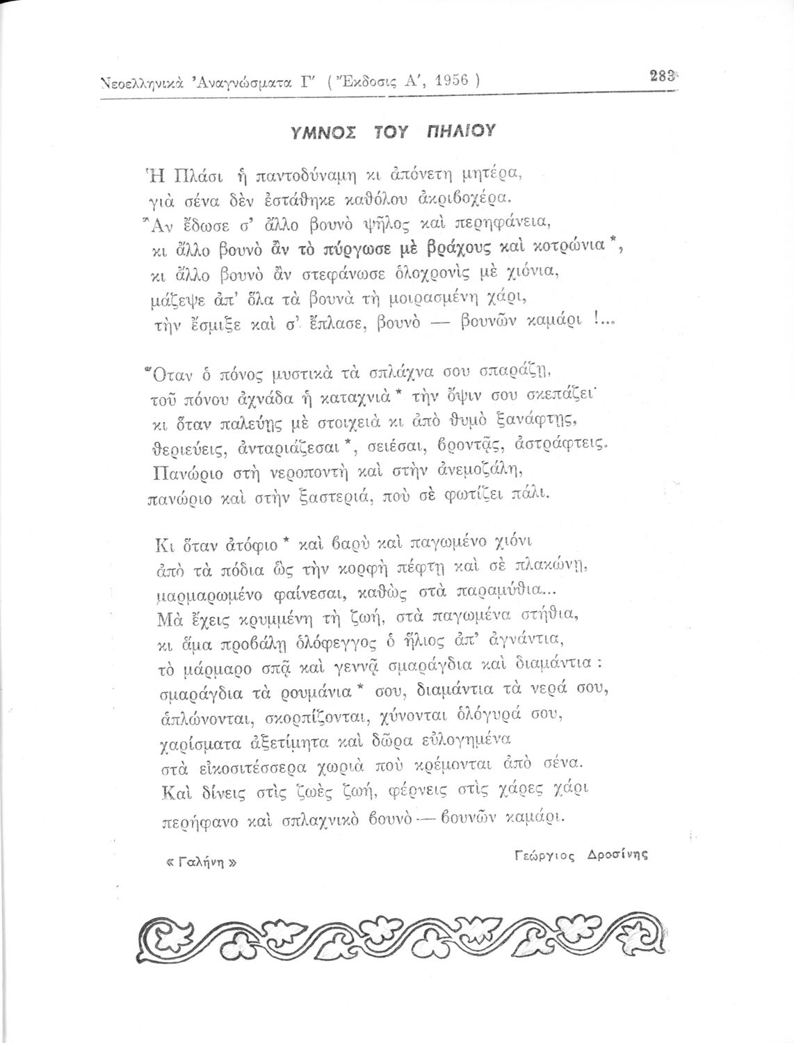 Σχολικό εγχειρίδιο Νέων Ελληνικών Γ΄ Γυμνασίου που περιέχει ποιήματα και πεζά Ελλήνων συγγραφέων εμπνευσμένα από τη θρησκευτική, οικογενειακή και κοινωνική ζωή, την σύγχρονή ελληνική ιστορία και την ελληνική φύση. Περιέχει παράρτημα με βιογραφίες των συγγραφέων και λεξιλόγιο.