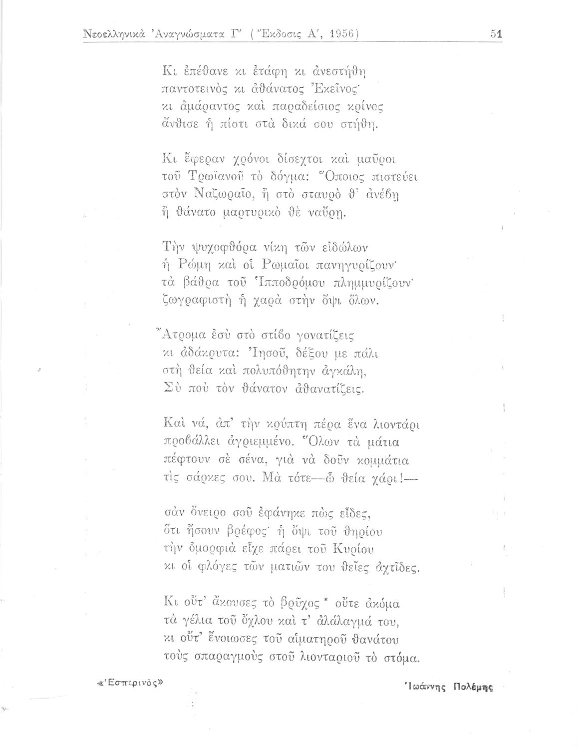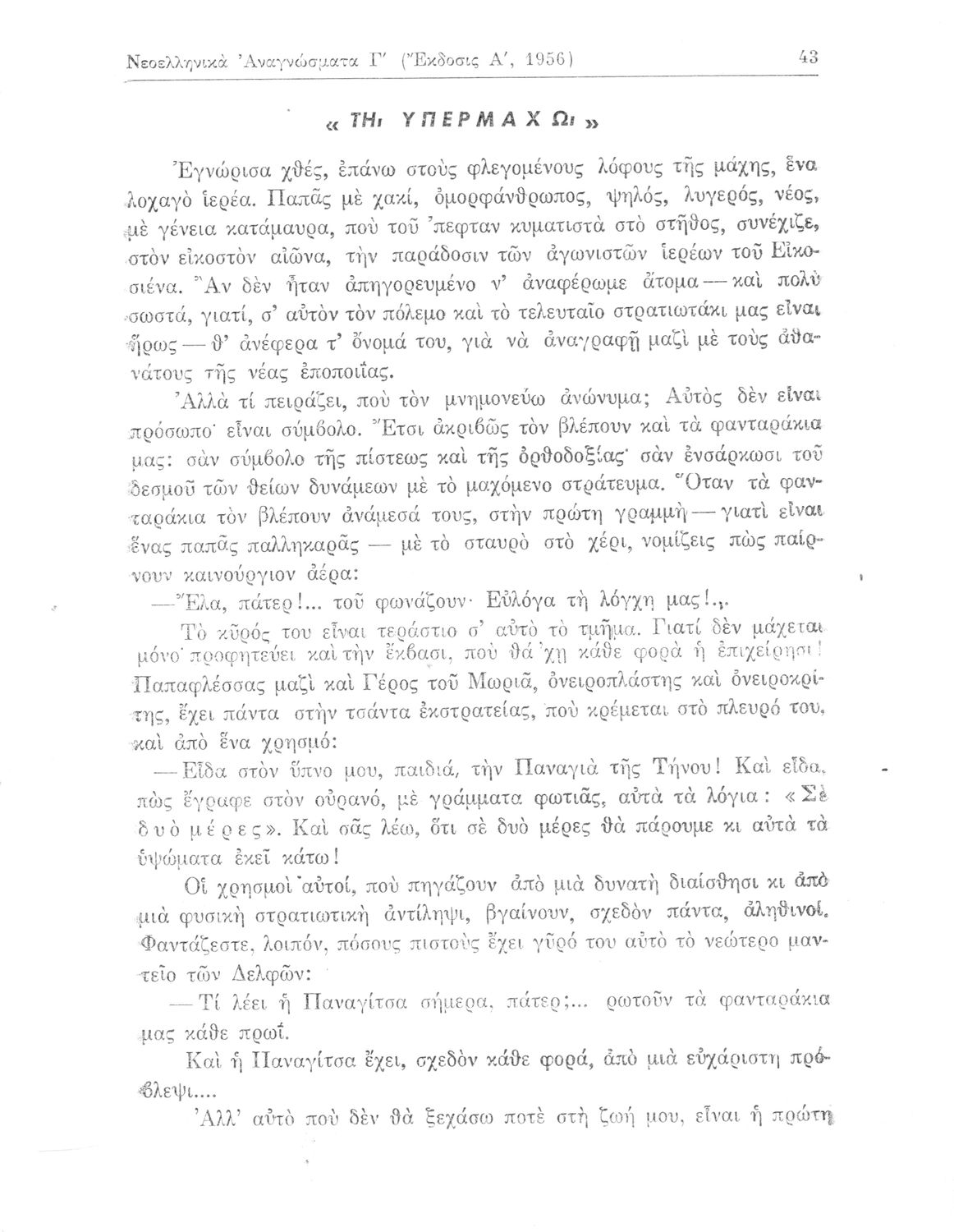 Σχολικό εγχειρίδιο Νέων Ελληνικών Γ΄ Γυμνασίου και Α' Αστικού Σχολείου που περιέχει πεζά και ποιήματα Ελλήνων συγγραφέων εμπνευσμένα από τη θρησκευτική και κοινωνική ζωή, την ελληνική μυθολογία, την αρχαία και