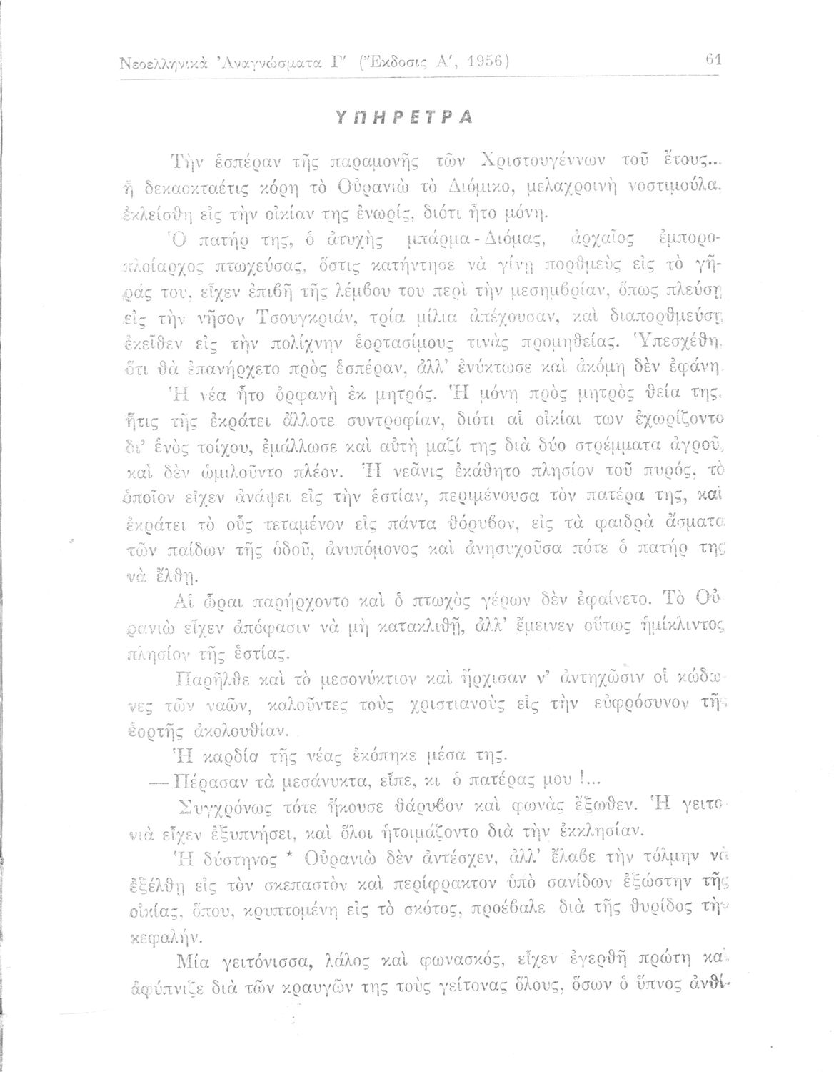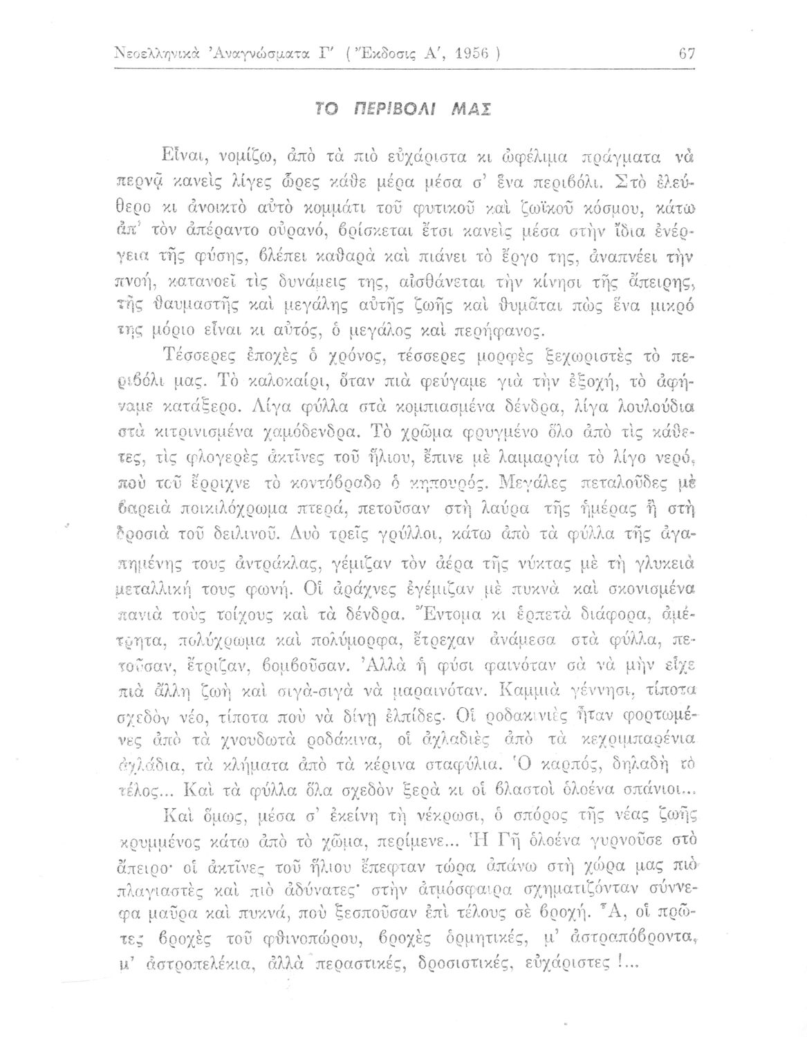 Σχολικό εγχειρίδιο Νέων Ελληνικών Γ΄ Γυμνασίου και Α' Αστικού Σχολείου που περιέχει πεζά και ποιήματα Ελλήνων συγγραφέων εμπνευσμένα από τη θρησκευτική και κοινωνική ζωή, την ελληνική μυθολογία, την αρχαία και