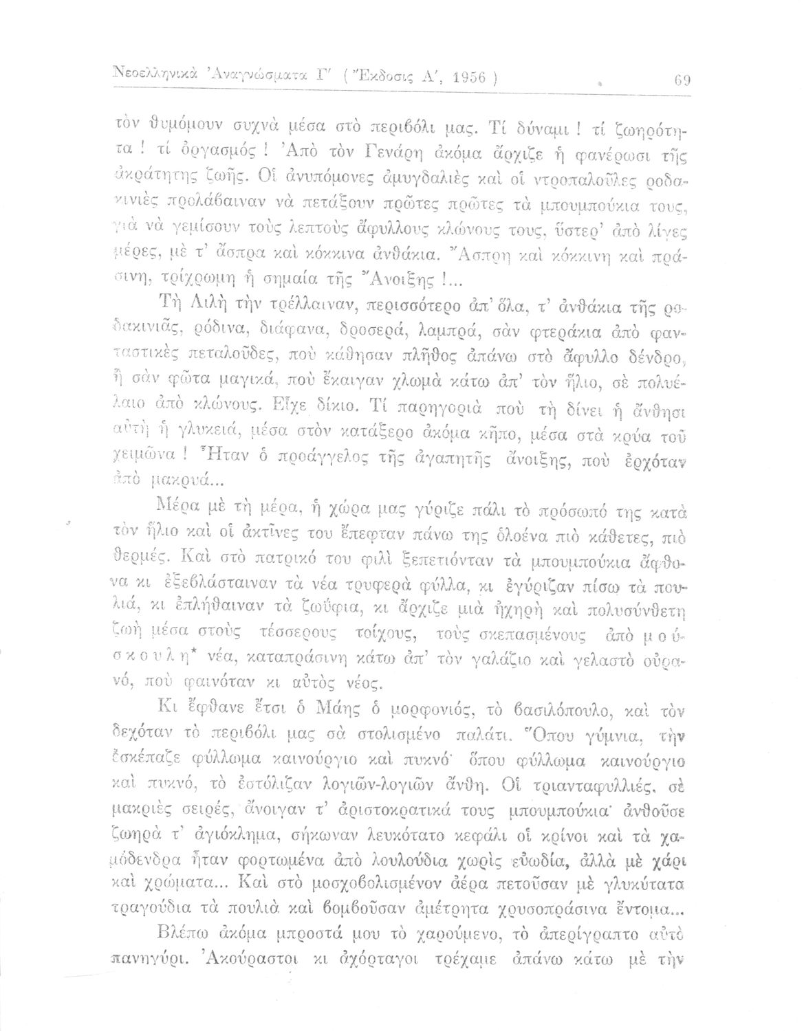 Σχολικό εγχειρίδιο Νέων Ελληνικών Γ΄ Γυμνασίου που περιέχει ποιήματα και πεζά Ελλήνων συγγραφέων εμπνευσμένα από τη θρησκευτική, οικογενειακή και κοινωνική ζωή, την σύγχρονή ελληνική ιστορία και την ελληνική φύση. Περιέχει παράρτημα με βιογραφίες των συγγραφέων και λεξιλόγιο.