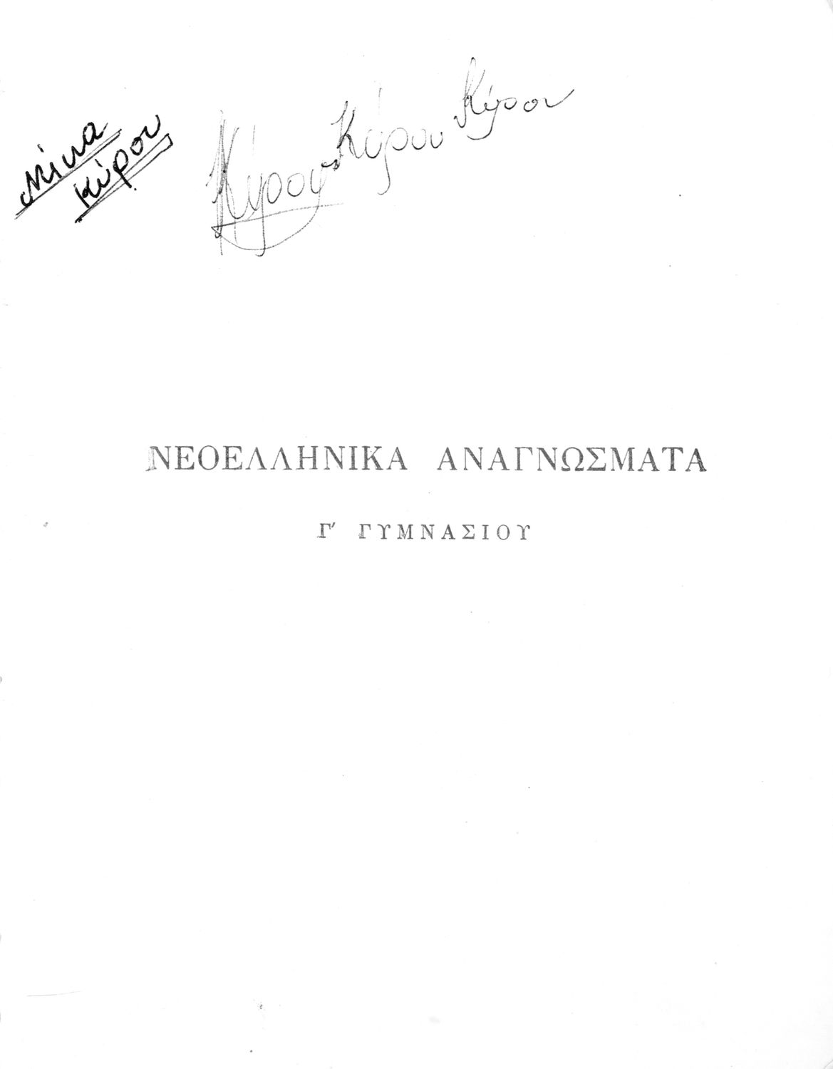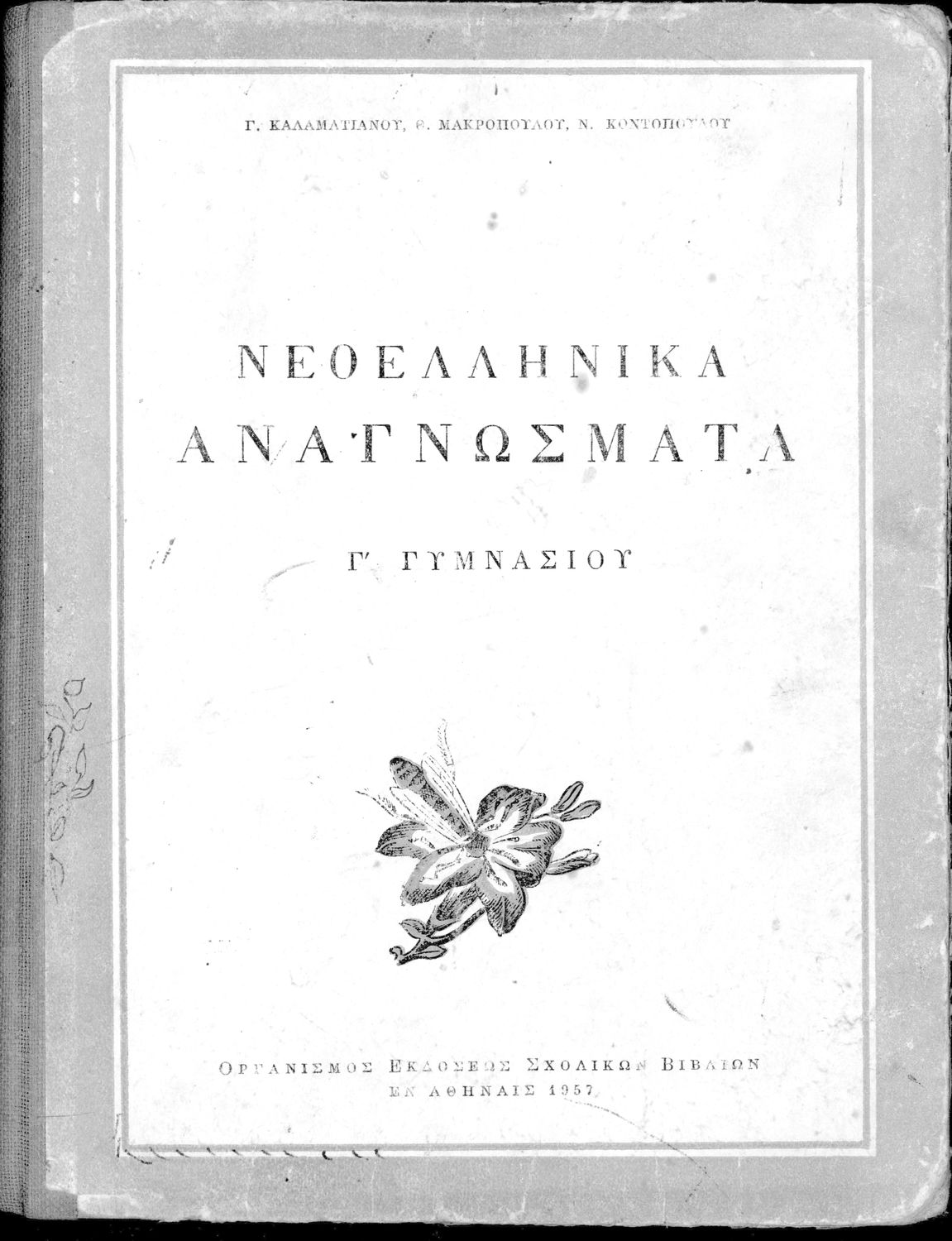 Βαθμίδα εκπαίδευσης: Δευτεροβάθμια Τάξη: Γ' Γυμνασίου Μάθημα: Νέα Ελληνικά Γλώσσα: Δημοτική Παρουσίαση περιεχομένου: Σχολικό εγχειρίδιο Νέων Ελληνικών Γ΄ Γυμνασίου που περιέχει ποιήματα και πεζά Ελλήνων συγγραφέων εμπνευσμένα από τη θρησκευτική, οικογενειακή και κοινωνική ζωή, την σύγχρονή ελληνική ιστορία και την ελληνική φύση. Περιέχει παράρτημα με βιογραφίες των συγγραφέων και λεξιλόγιο. |