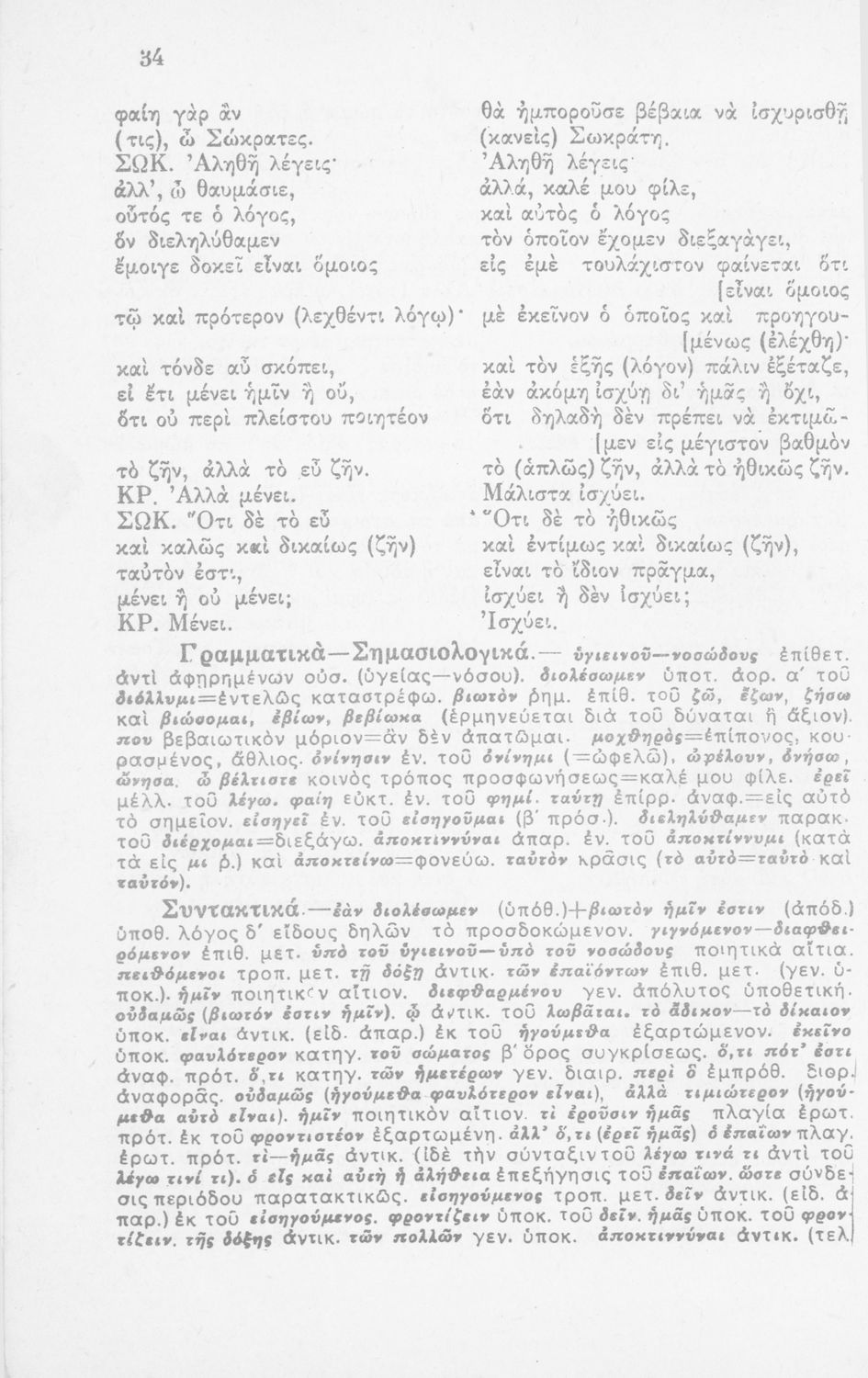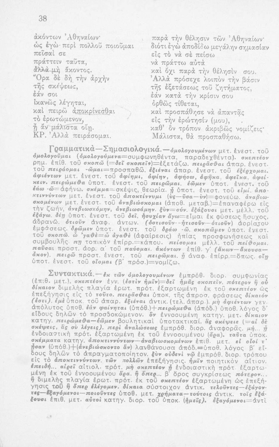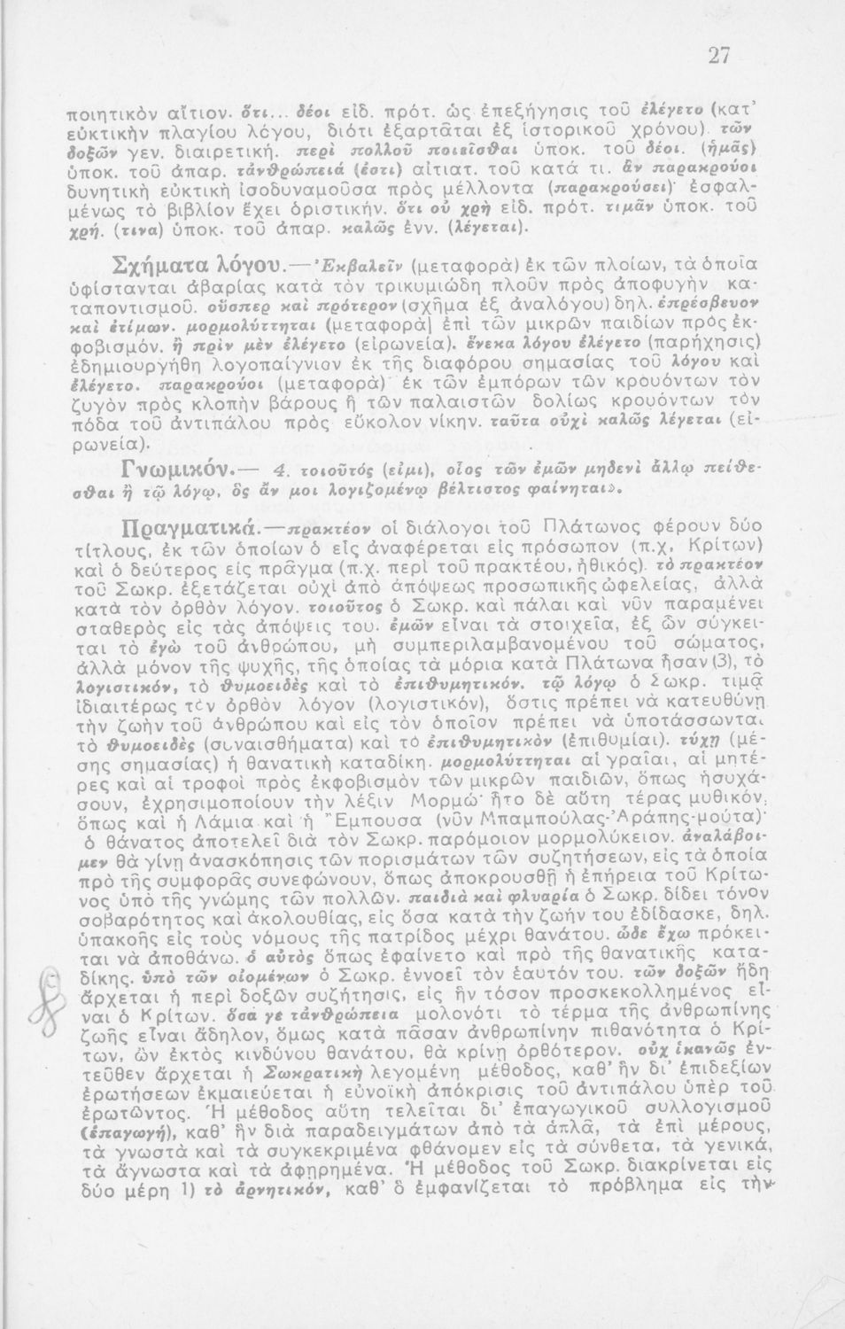 Σχολικό εγχειρίδιο Αρχαίων Ελληνικών για τη Β΄ Λυκείου που περιλαμβάνει έργα του Πλάτωνα με ερμηνευτικά σχόλια του συγγραφέα στη καθαρεύουσα. Το κείμενο είναι πρωτότυπο.