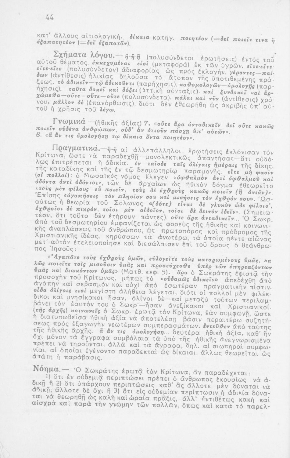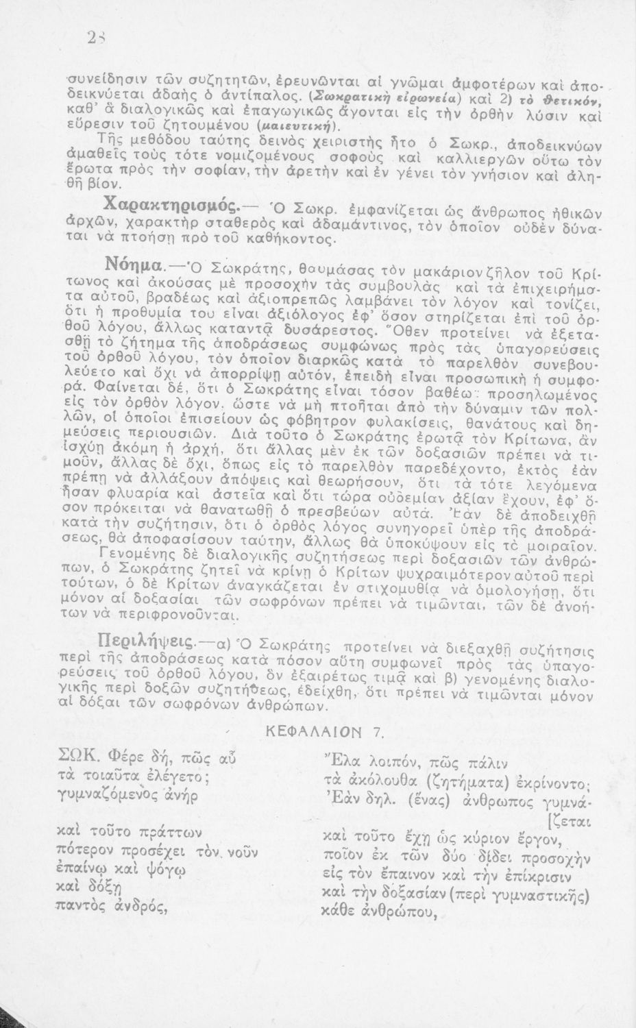 Σχολικό εγχειρίδιο Αρχαίων Ελληνικών από το κείμενο του Πλάτωνα. Περιέχονται ερμηνευτικά σχόλια του συγγραφέα στη καθαρεύουσα. Απεικονίζεται το σύμβολο της Επταετίας.