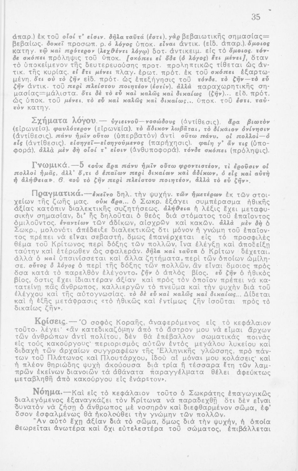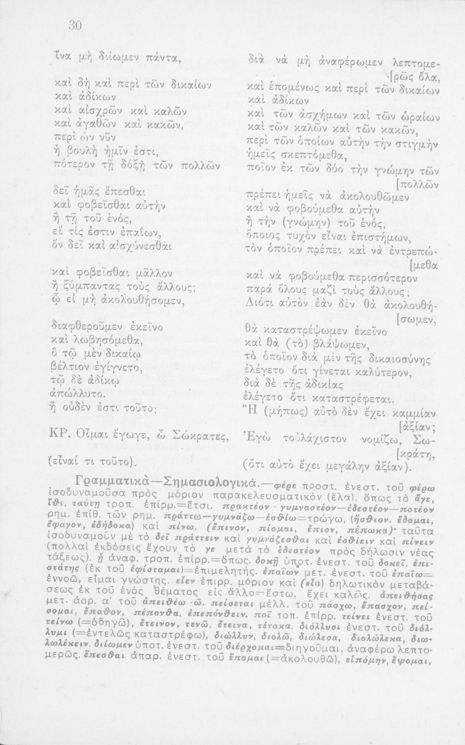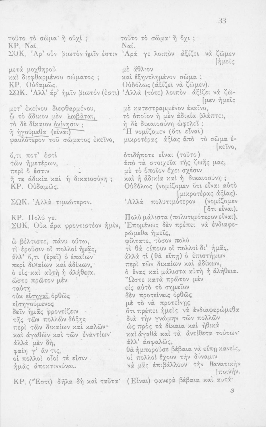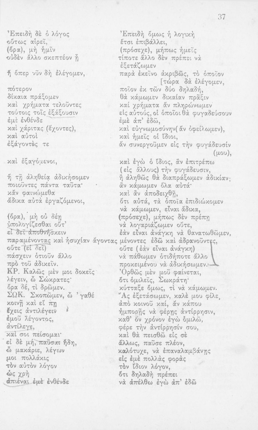 Σχολικό εγχειρίδιο Αρχαίων Ελληνικών Γ΄ Γυμνασίου που περιλαμβάνει το έργο του Πλάτωνα Κρίτων, εισαγωγή, μετάφραση και ερμηνευτικές παρατηρήσεις.