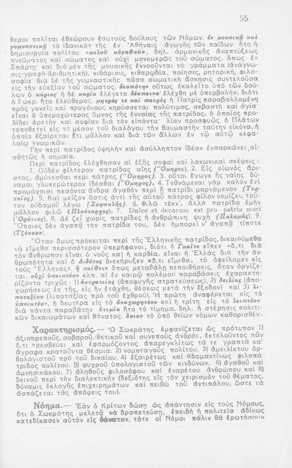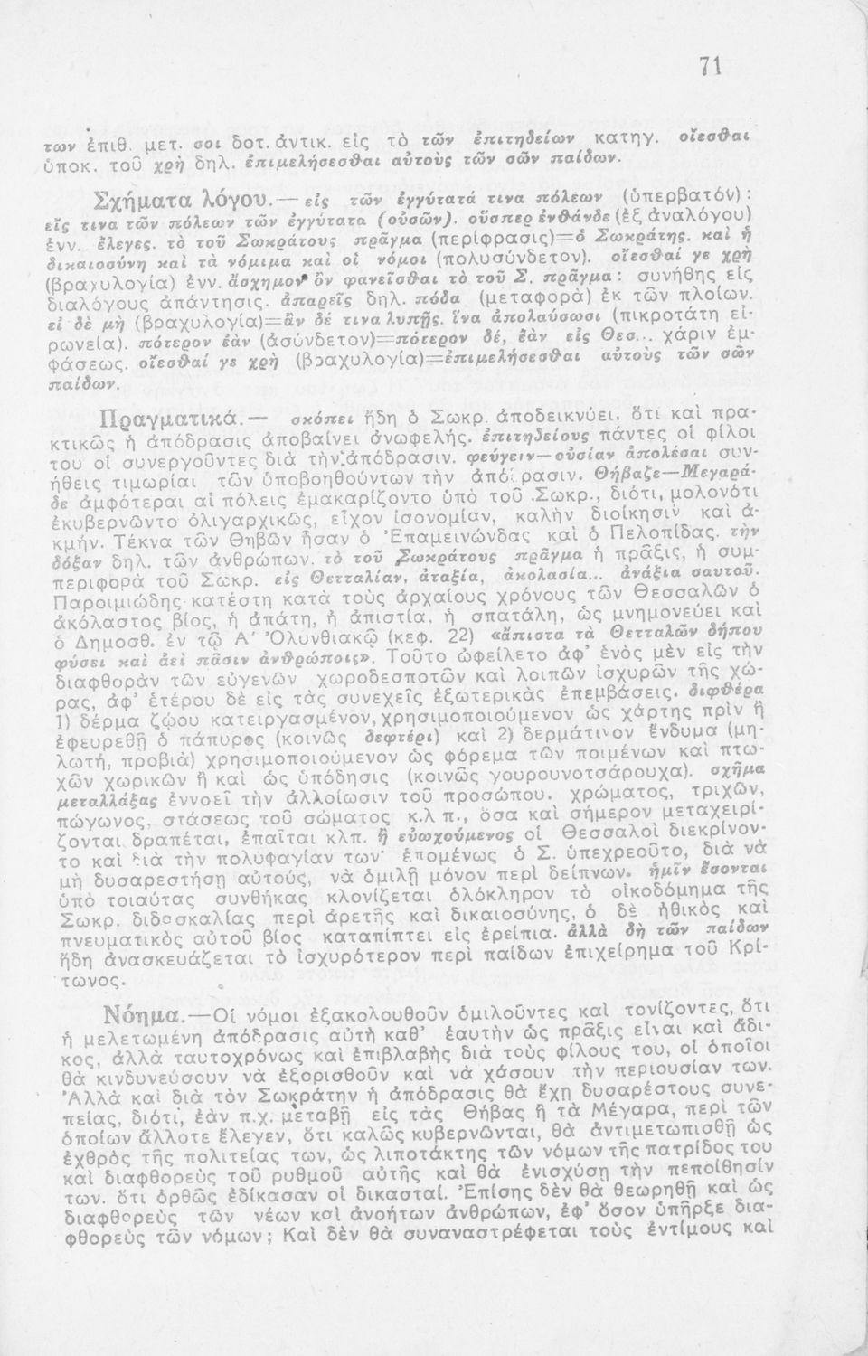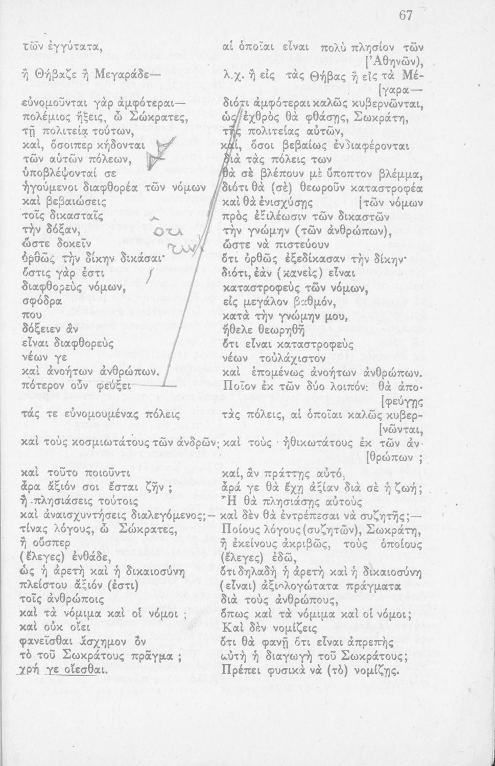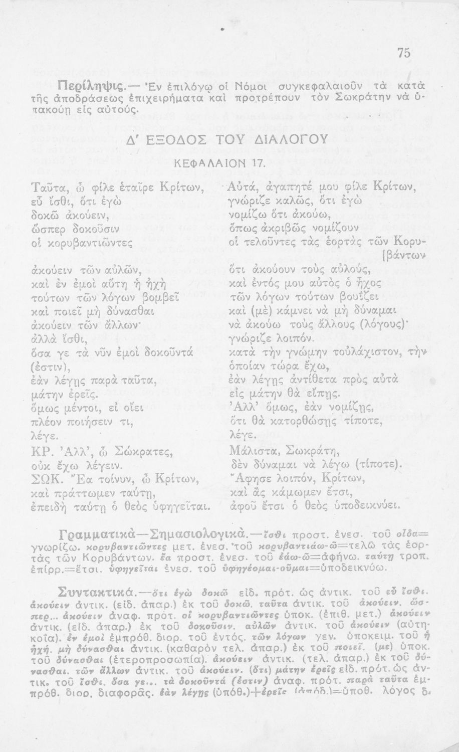 Σχολικό εγχειρίδιο Αρχαίων Ελληνικών για τη Β΄ Λυκείου που περιλαμβάνει έργα του Πλάτωνα με ερμηνευτικά σχόλια του συγγραφέα στη καθαρεύουσα. Το κείμενο είναι πρωτότυπο.