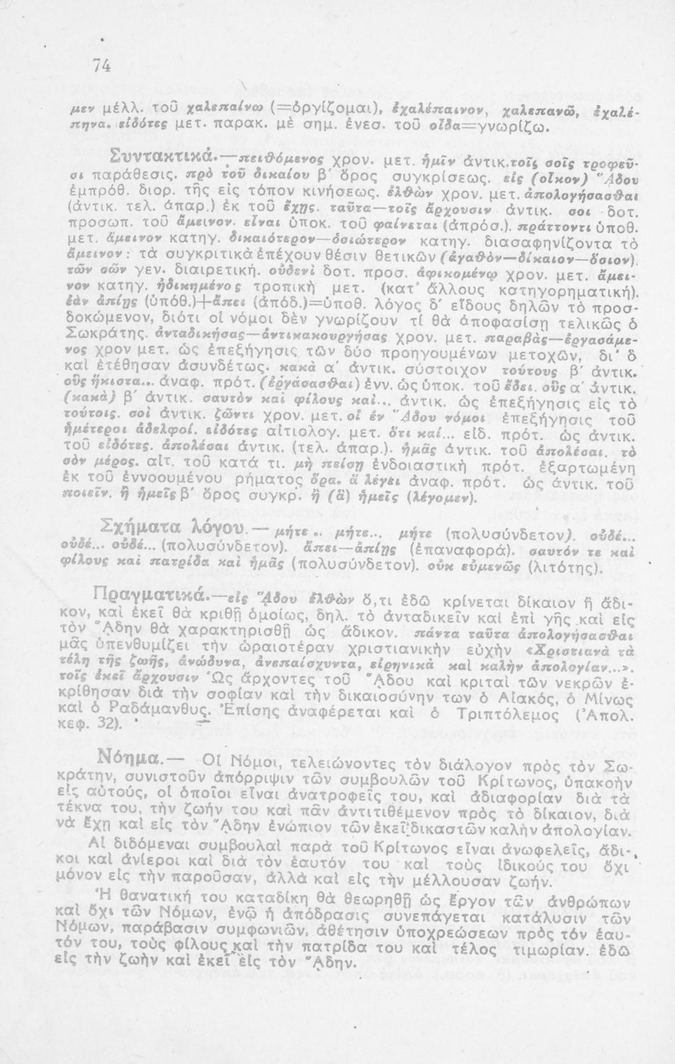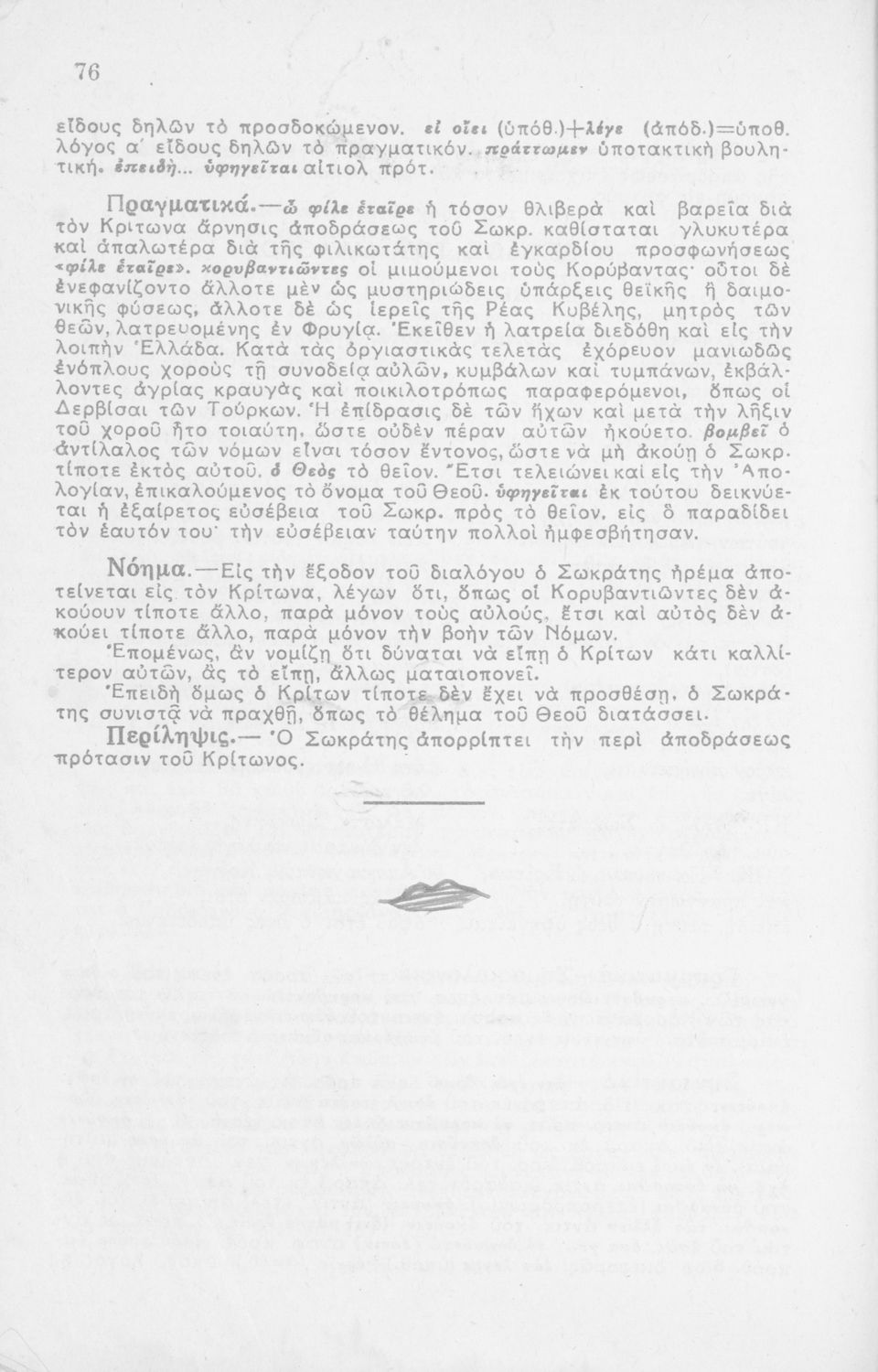 Σχολικό εγχειρίδιο Αρχαίων Ελληνικών από το κείμενο του Πλάτωνα. Περιέχονται ερμηνευτικά σχόλια του συγγραφέα στη καθαρεύουσα. Απεικονίζεται το σύμβολο της Επταετίας.
