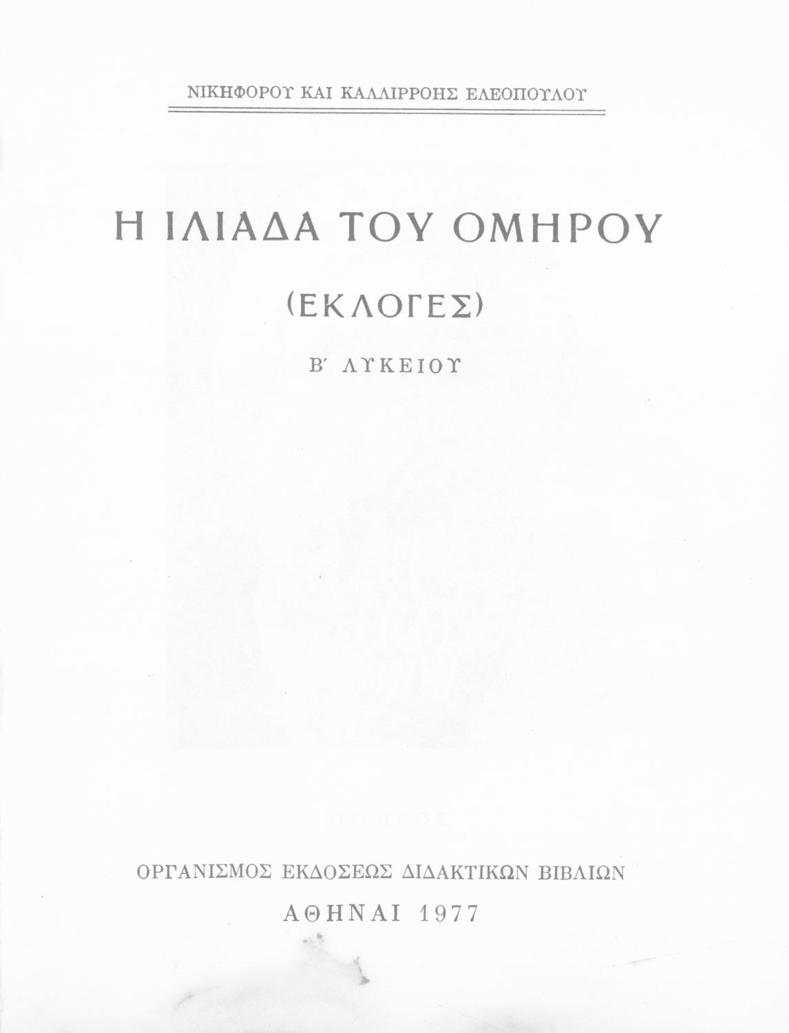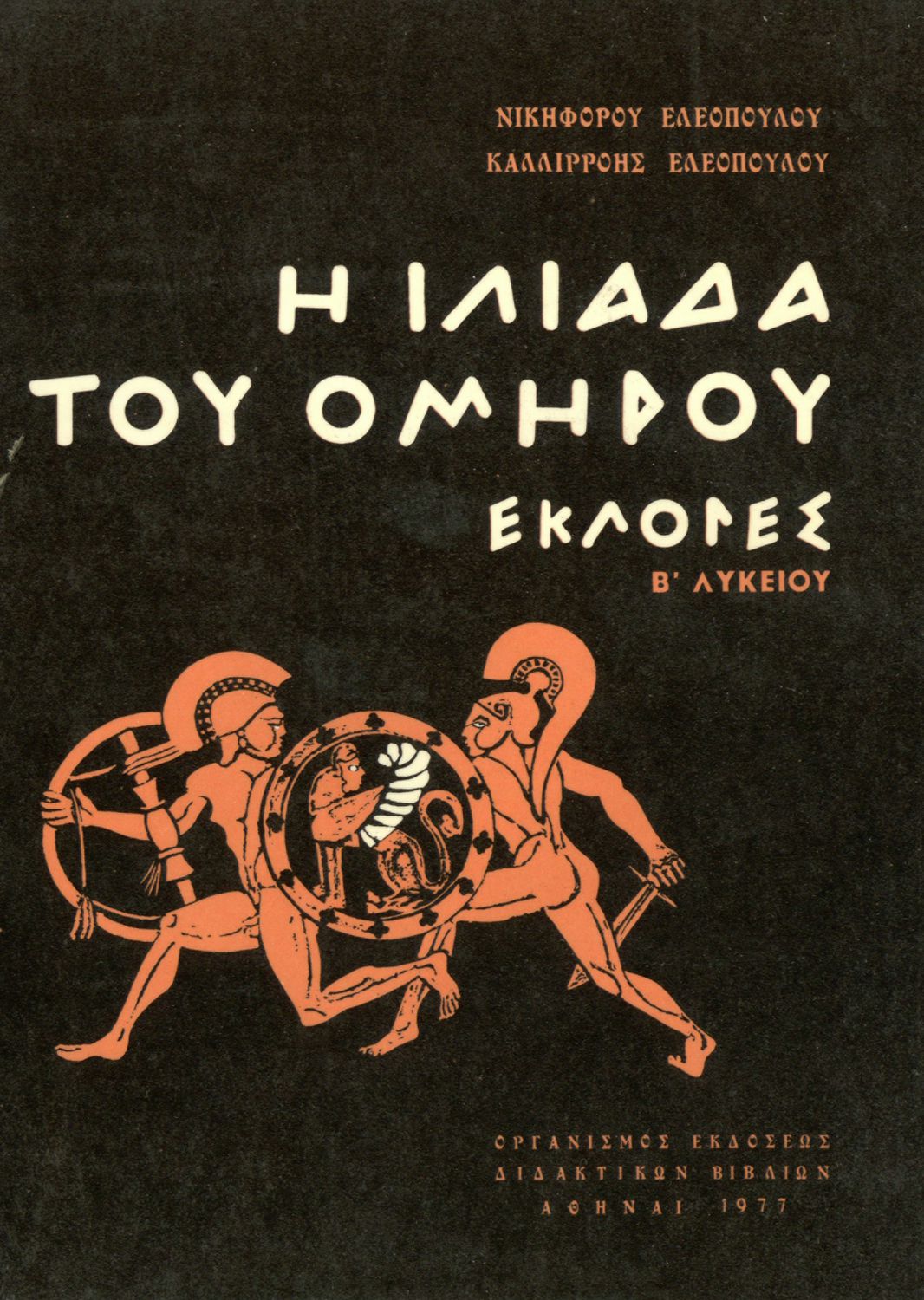Σχολικό εγχειρίδιο Αρχαίων Ελληνικών για τη Β' Γυμνασίου που περιλαμβάνει την Ιλιάδα Ομήρου. Το βιβλίο αποτελεί το Α΄ τεύχος από δύο. Η εισαγωγή και τα σχόλια έγιναν από την Ελένη Ι. Κακριδή.